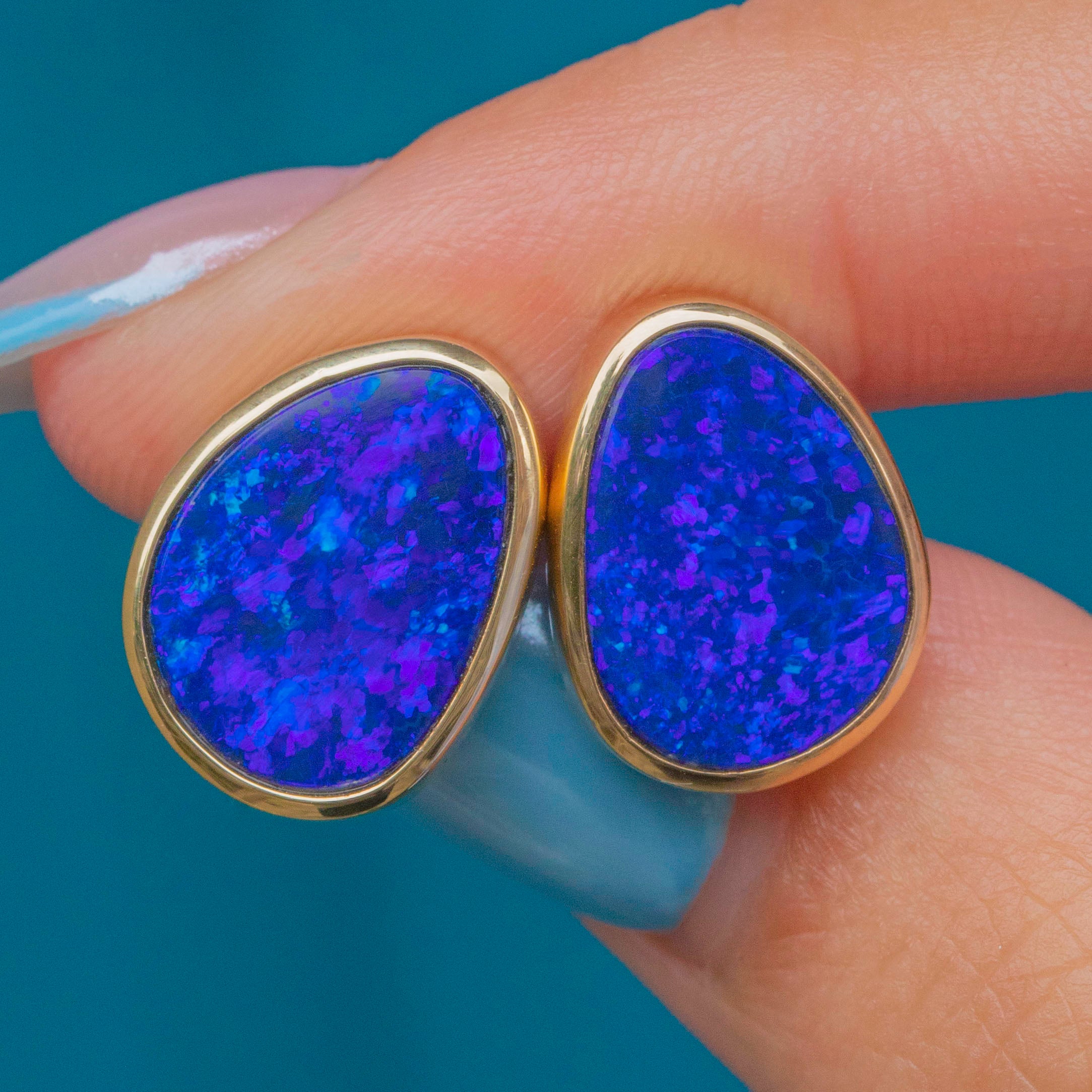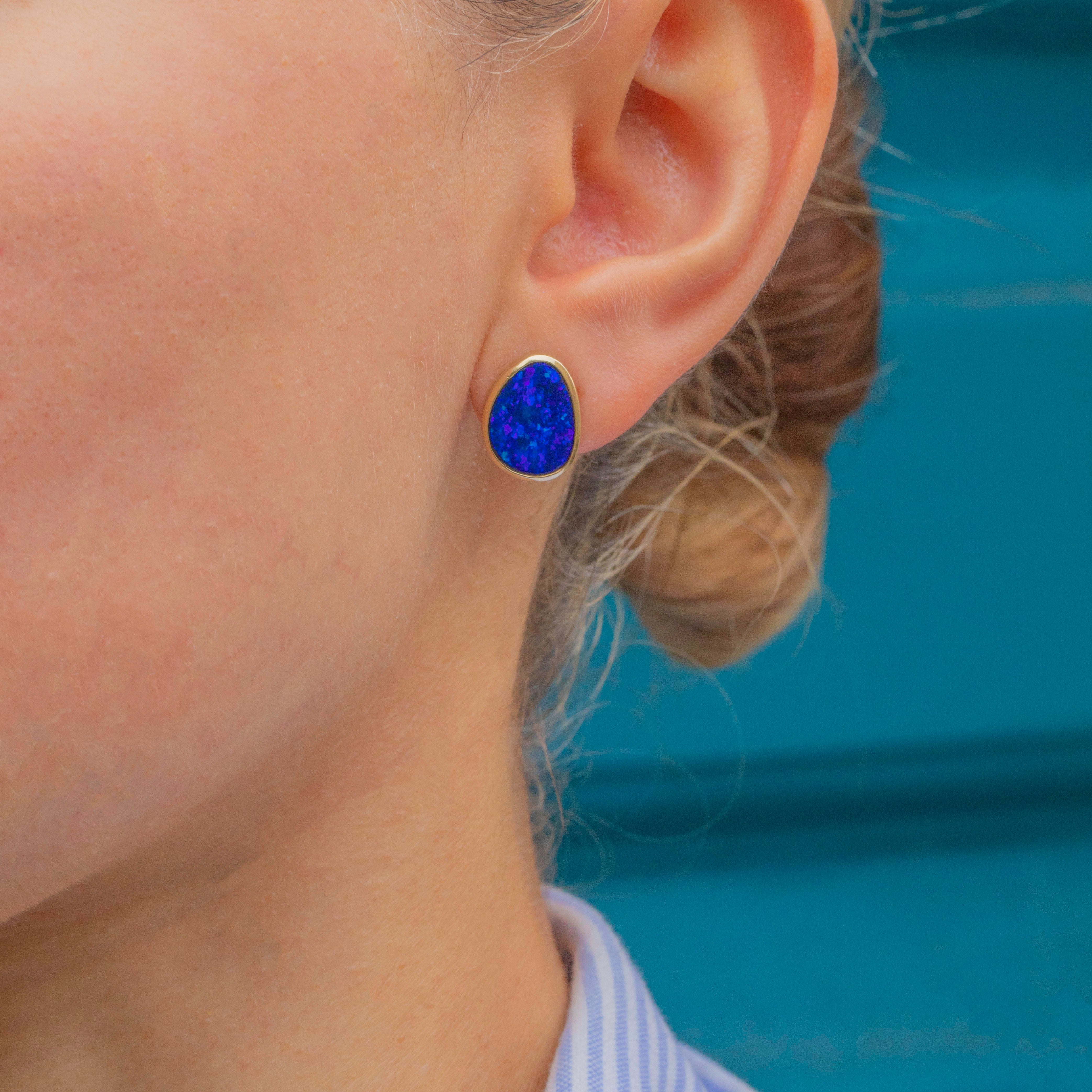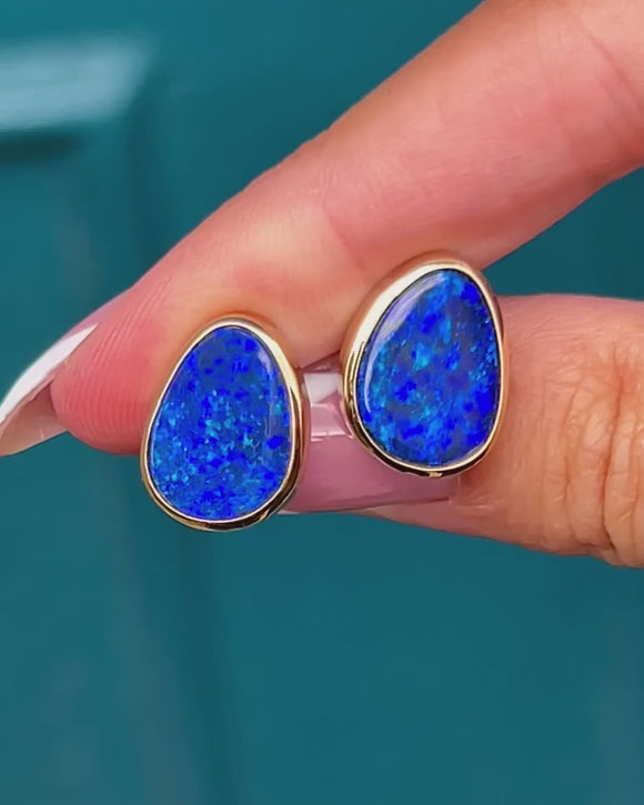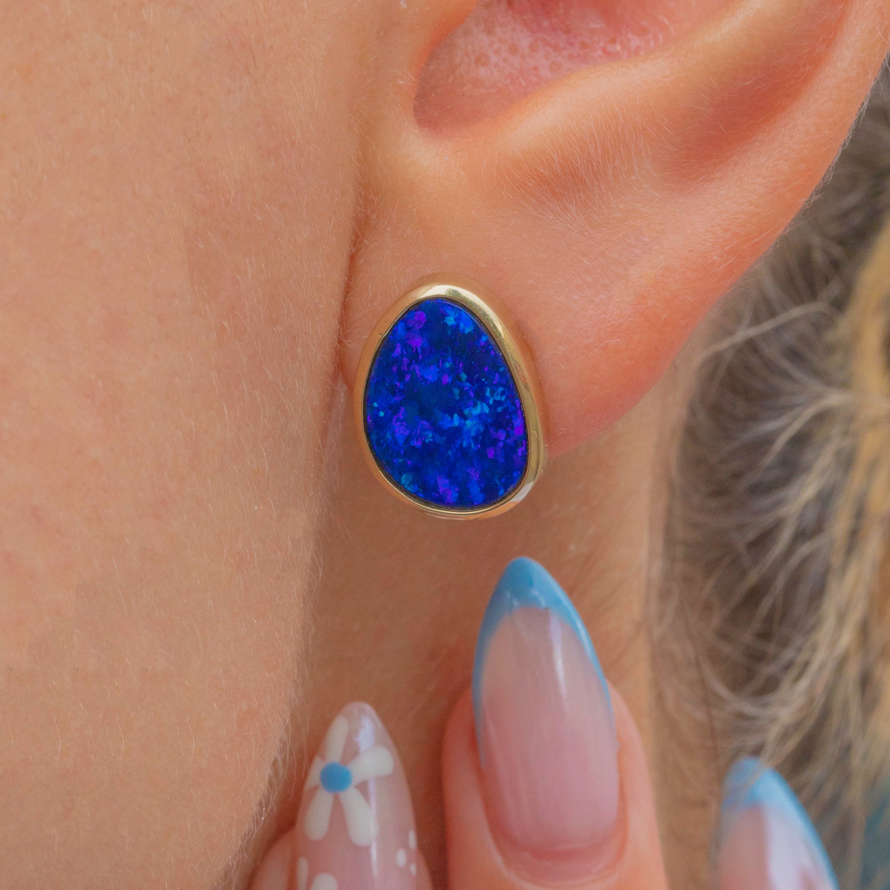 Each vintage earring boasts a vibrant and intensely saturated deep blue Boulder Opal, displaying striking flashes of cerulean as they catch the light.