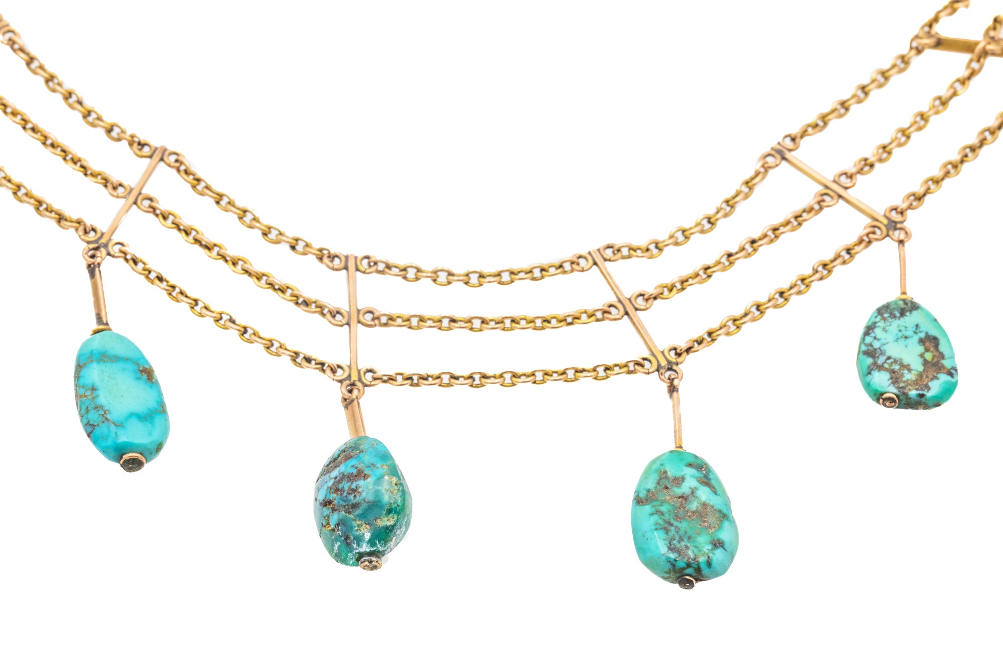 EXCELLENT. This 14.5" antique 9ct Gold Turquoise collar necklace is in very good condition. All the components are firmly connected and the gemstones held securely in place.