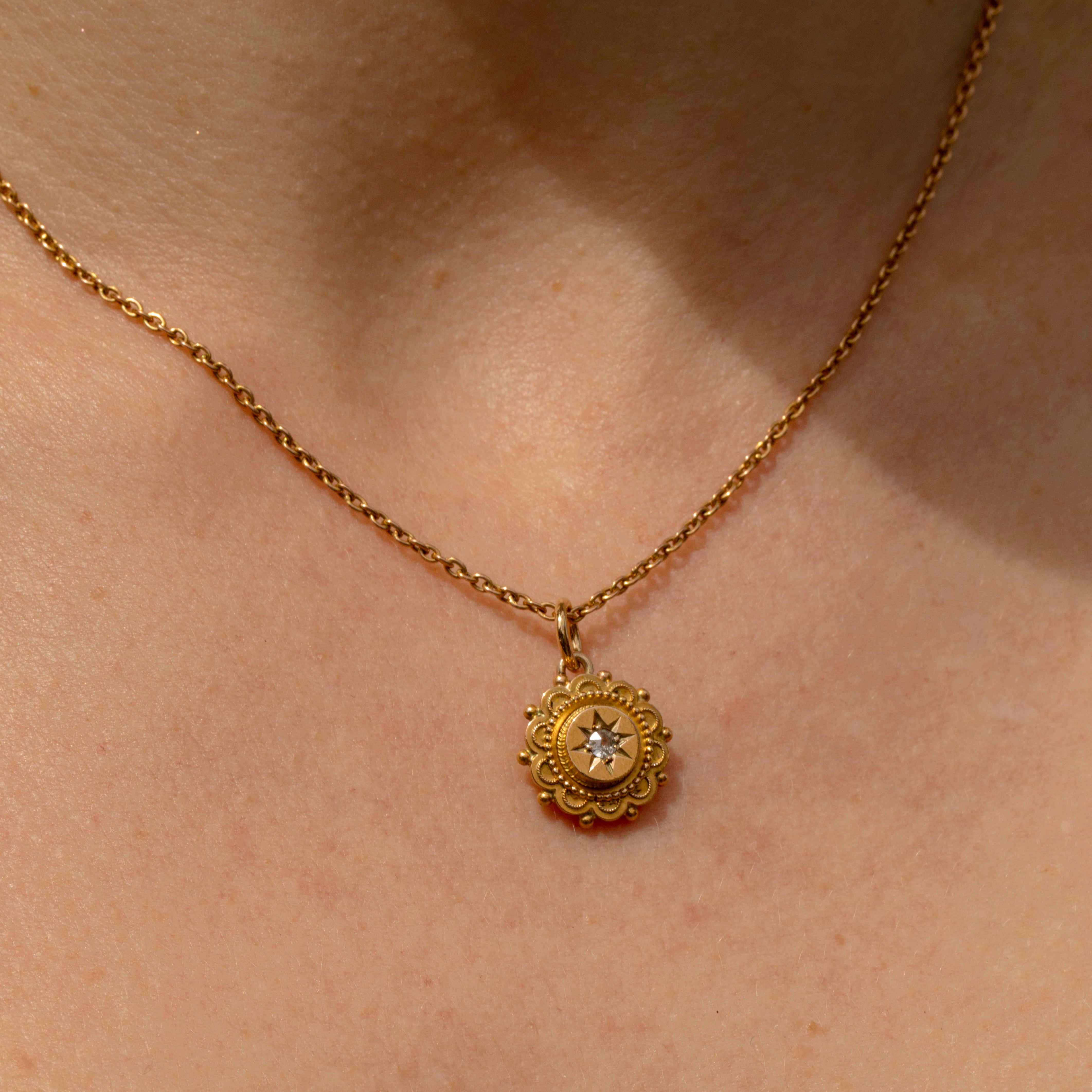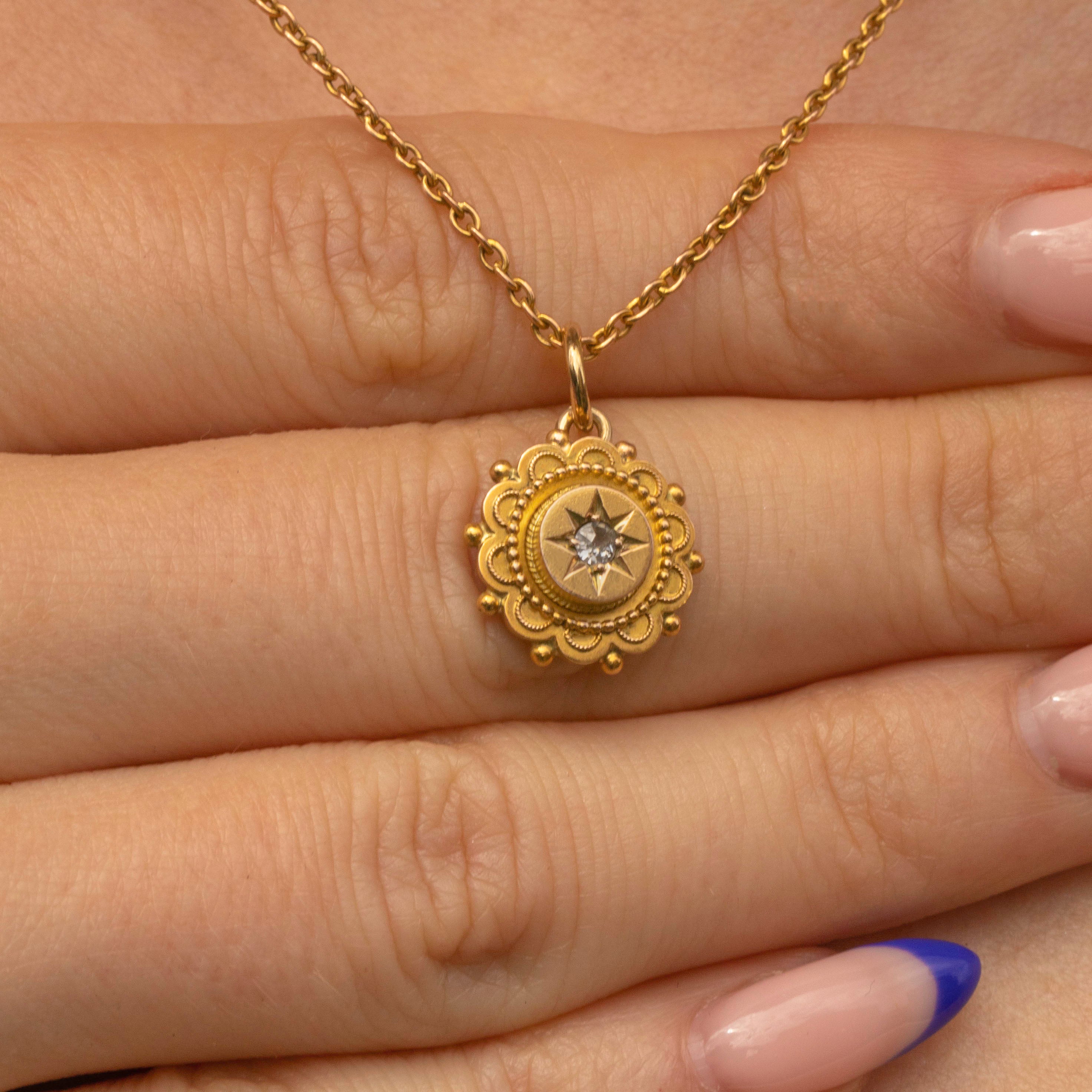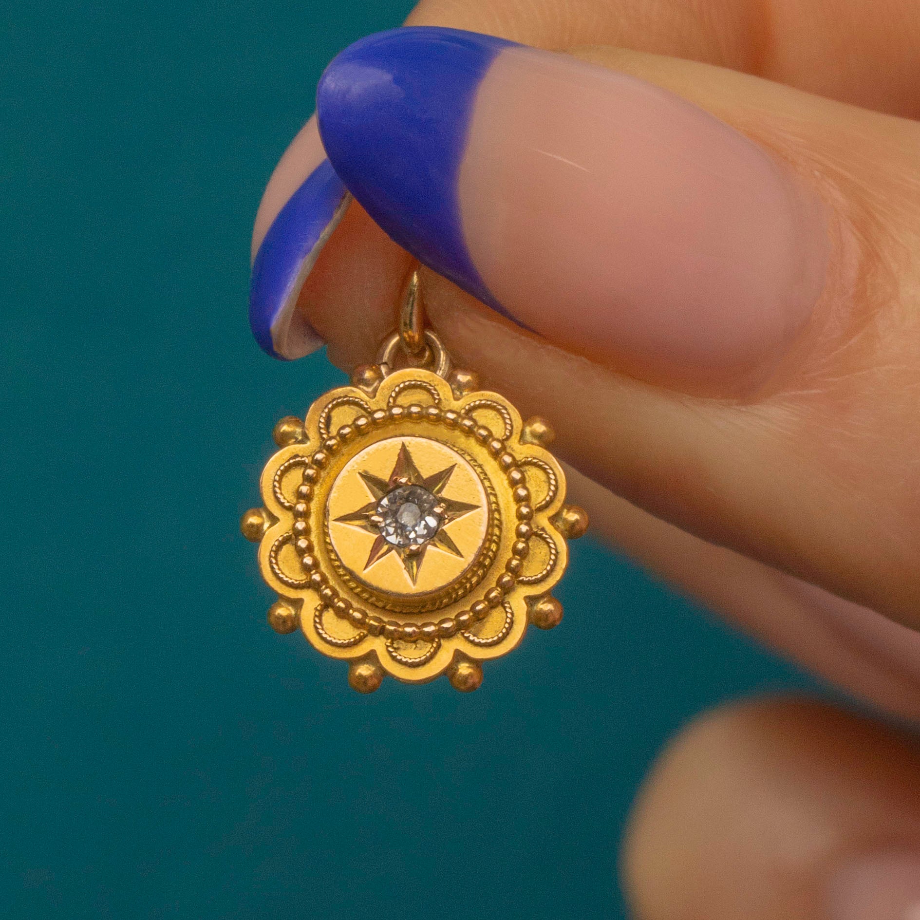 Crafted from solid 15ct Gold, this antique pendant showcases a star-set twinkling Diamond at her centre surrounded by intricate details for a refined finish; this Etruscan beauty will look exquisite suspended from a dainty Gold chain!