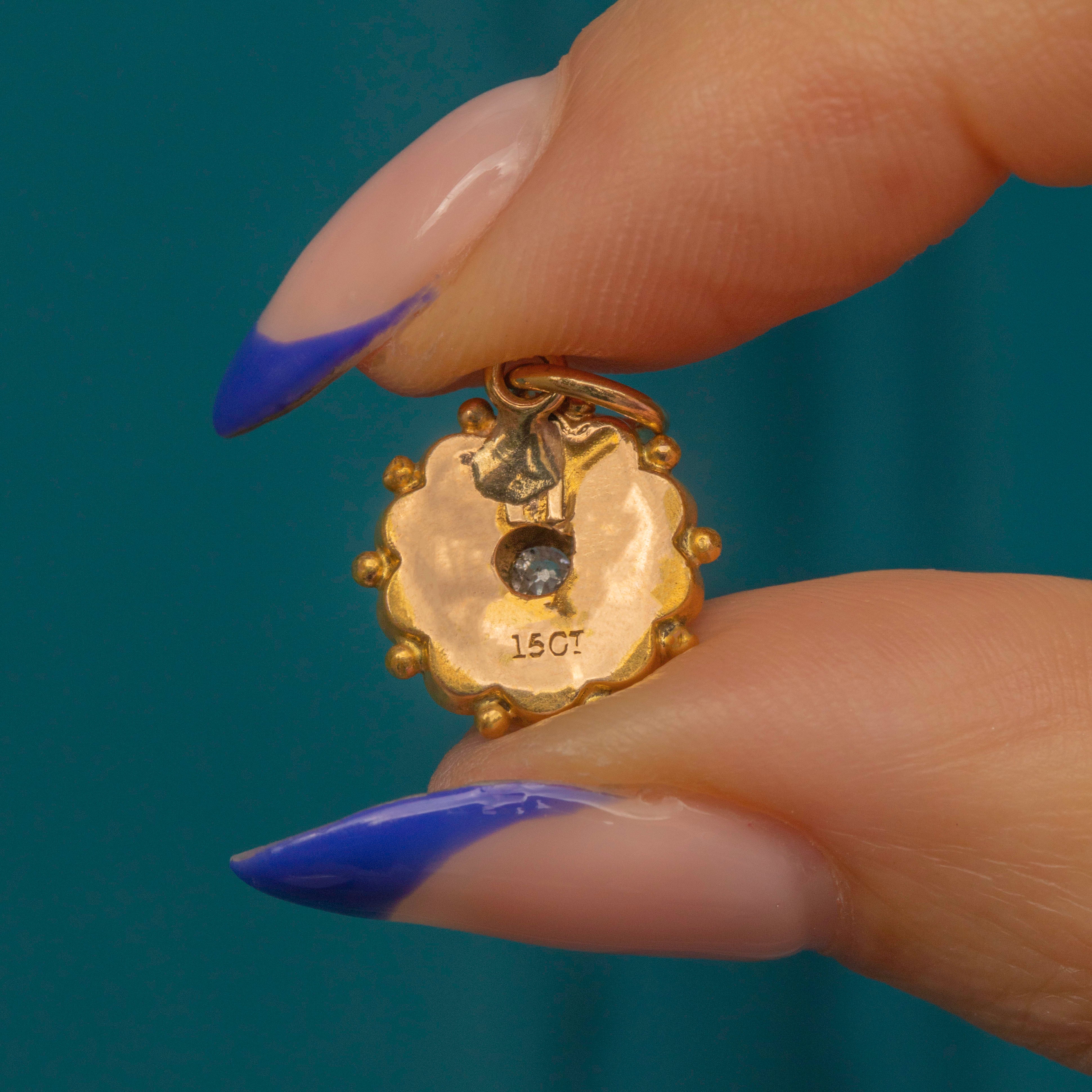 VERY GOOD. This 15ct Gold Etruscan Diamond charm is in excellent condition. The Diamond is secure and the piece wears super smoothly. Having been expertly converted from a stick pin there is a hairline crack and a small ding coming from the centre, but you will not notice this when you're busy appreciating her beauty!