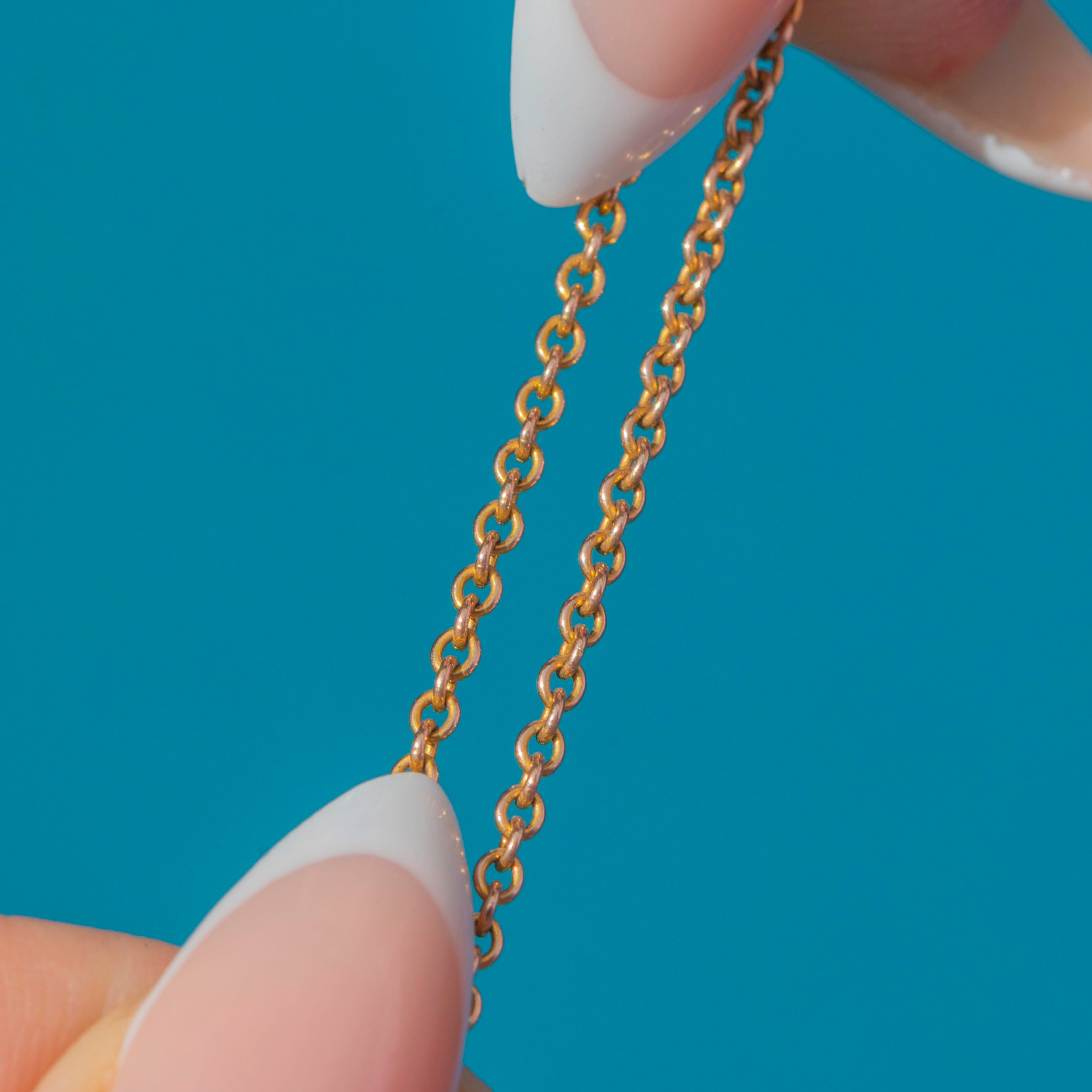 A delicate 9ct Gold skinny pendant chain from the early 20th century. The fine links and warm rose hue make it an ideal chain for showcasing your favourite pendant, or equally lovely worn alone for a subtle touch of vintage elegance.