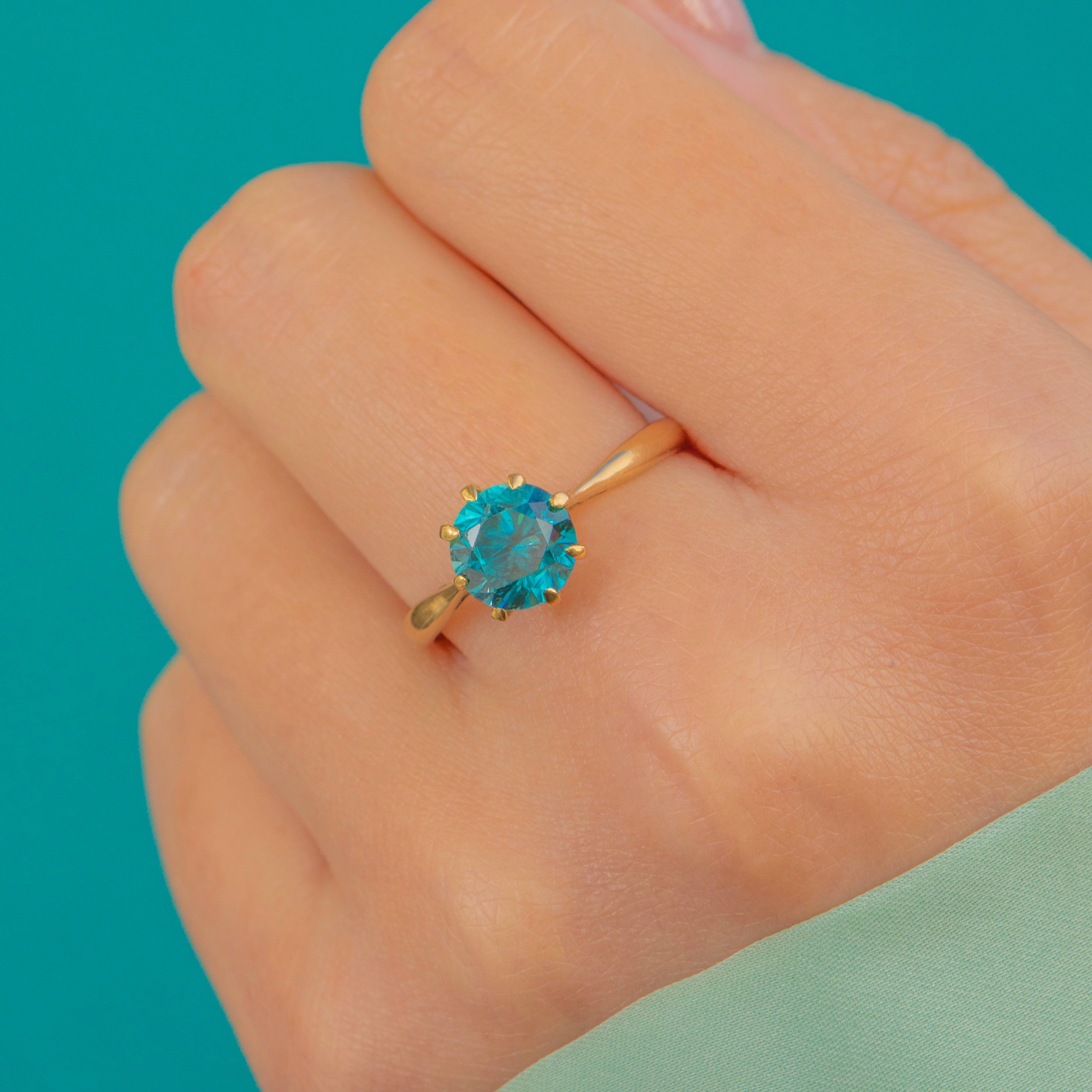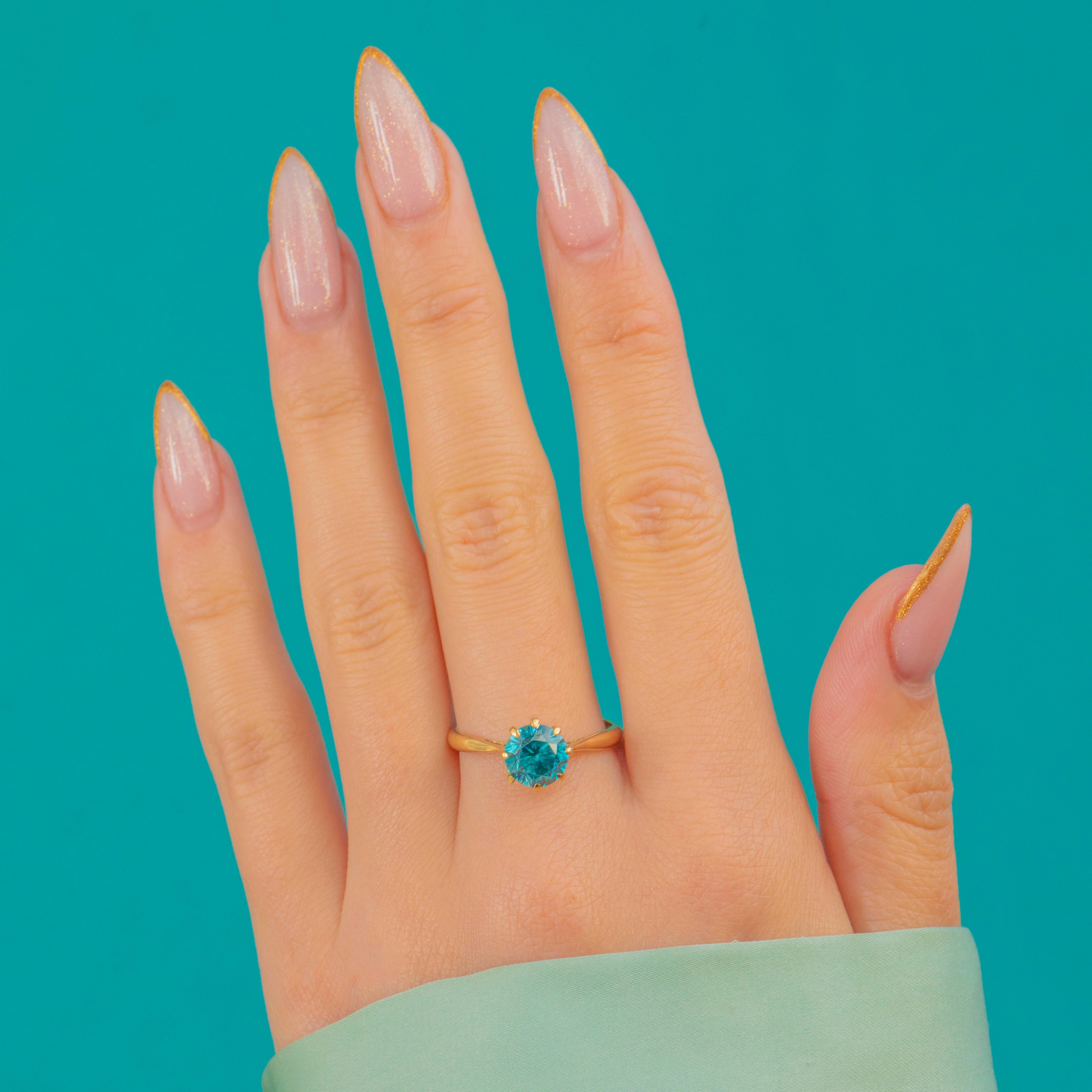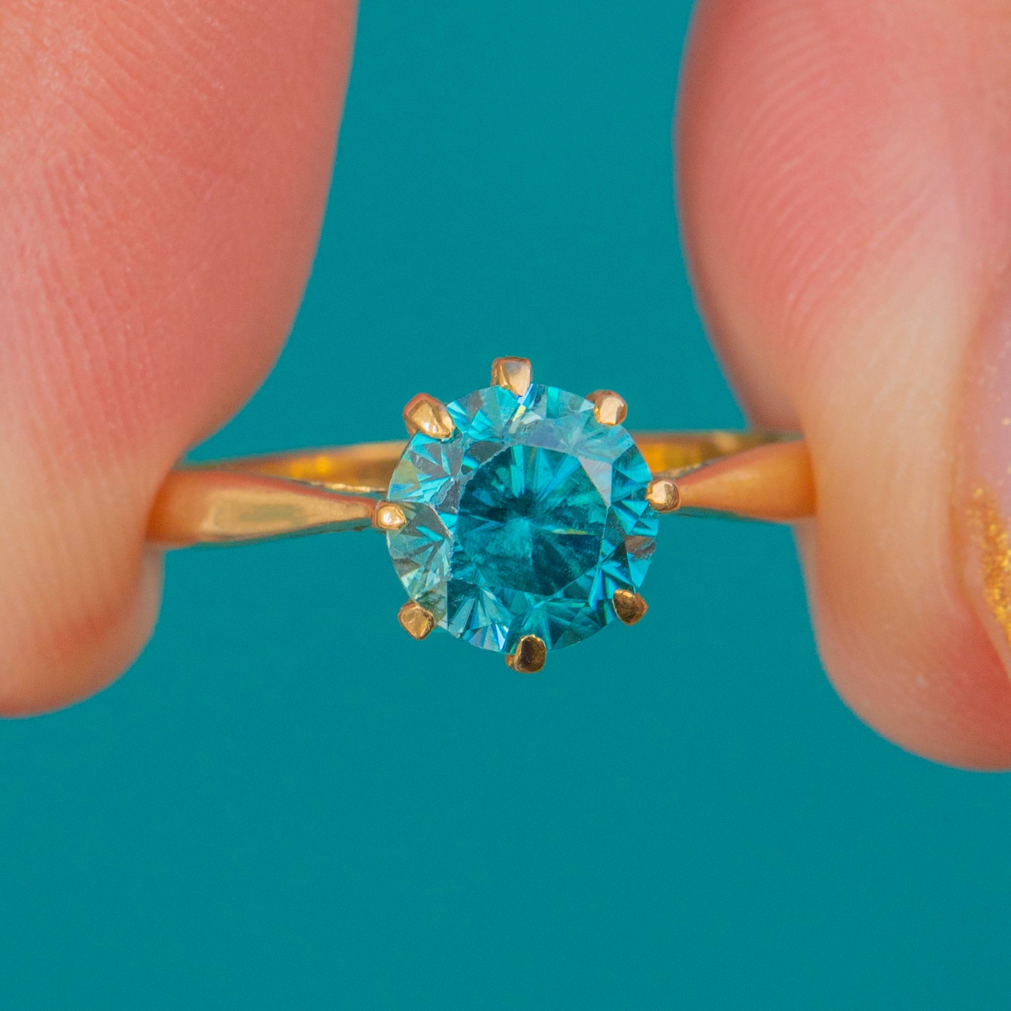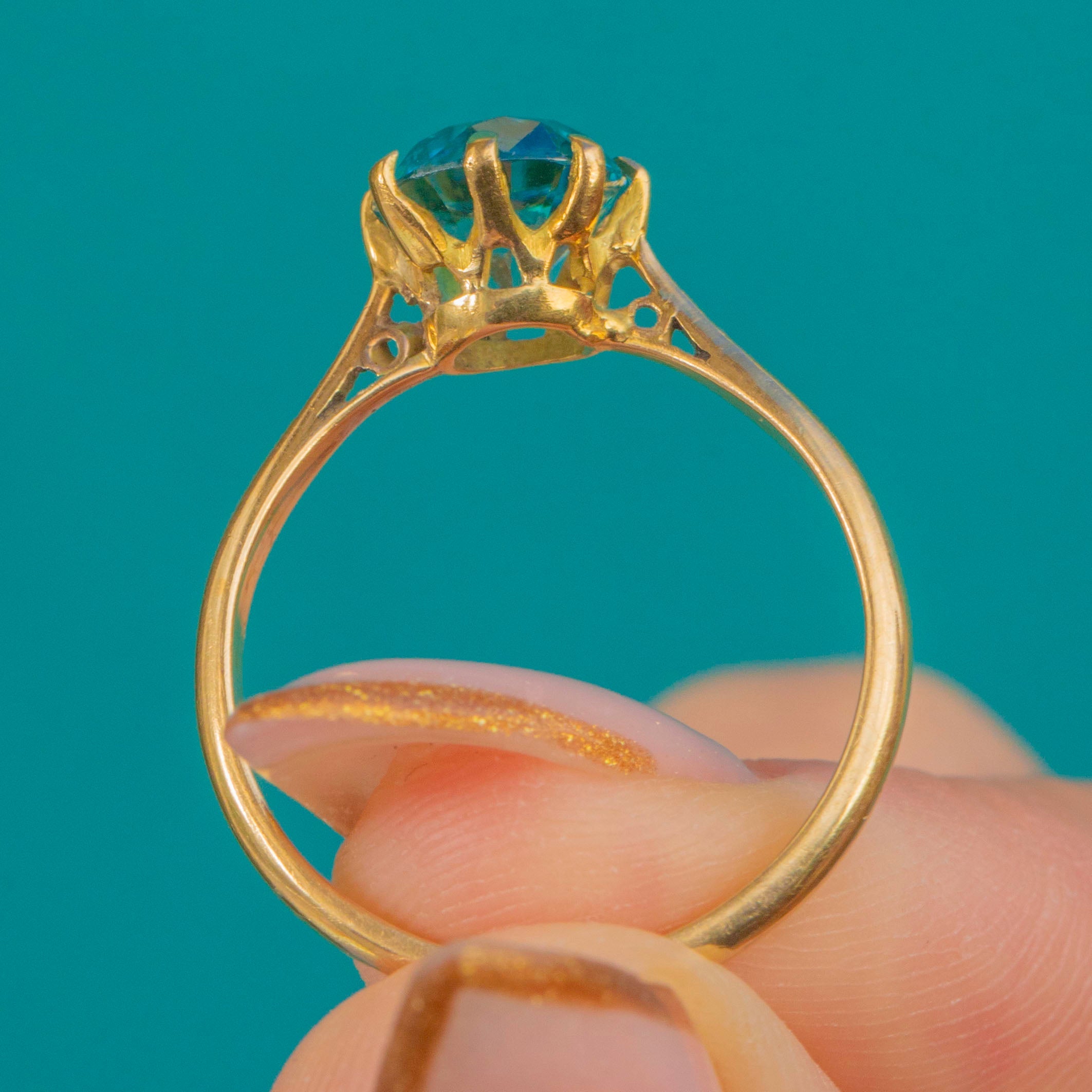 This vibrant Art Deco solitaire ring showcases a dazzling teal-blue Zircon in rich 18ct Gold. The round-cut 10.50ct Zircon sits proudly in a classic coronet-style claw setting, allowing light to flood the stone from every angle so it sparkles brilliantly on the hand.