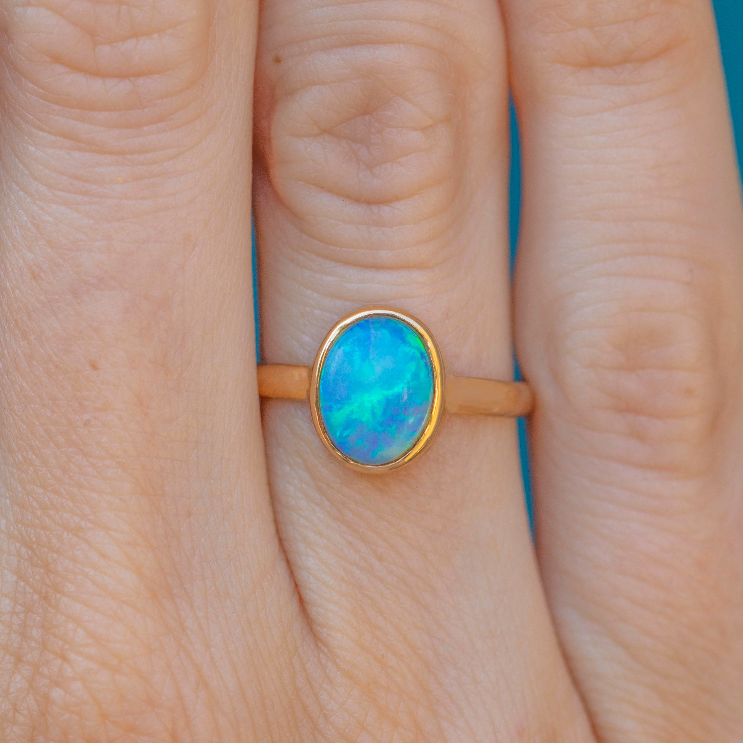 Behold the otherworldly glow of this 18ct Gold Black Opal solitaire bezel-set ring! With the colour palette akin to a peacock feather, her 1.00ct Opal has a vibrant blue core, with bold flashes of zingy green and violet across her smooth cabochon cut.