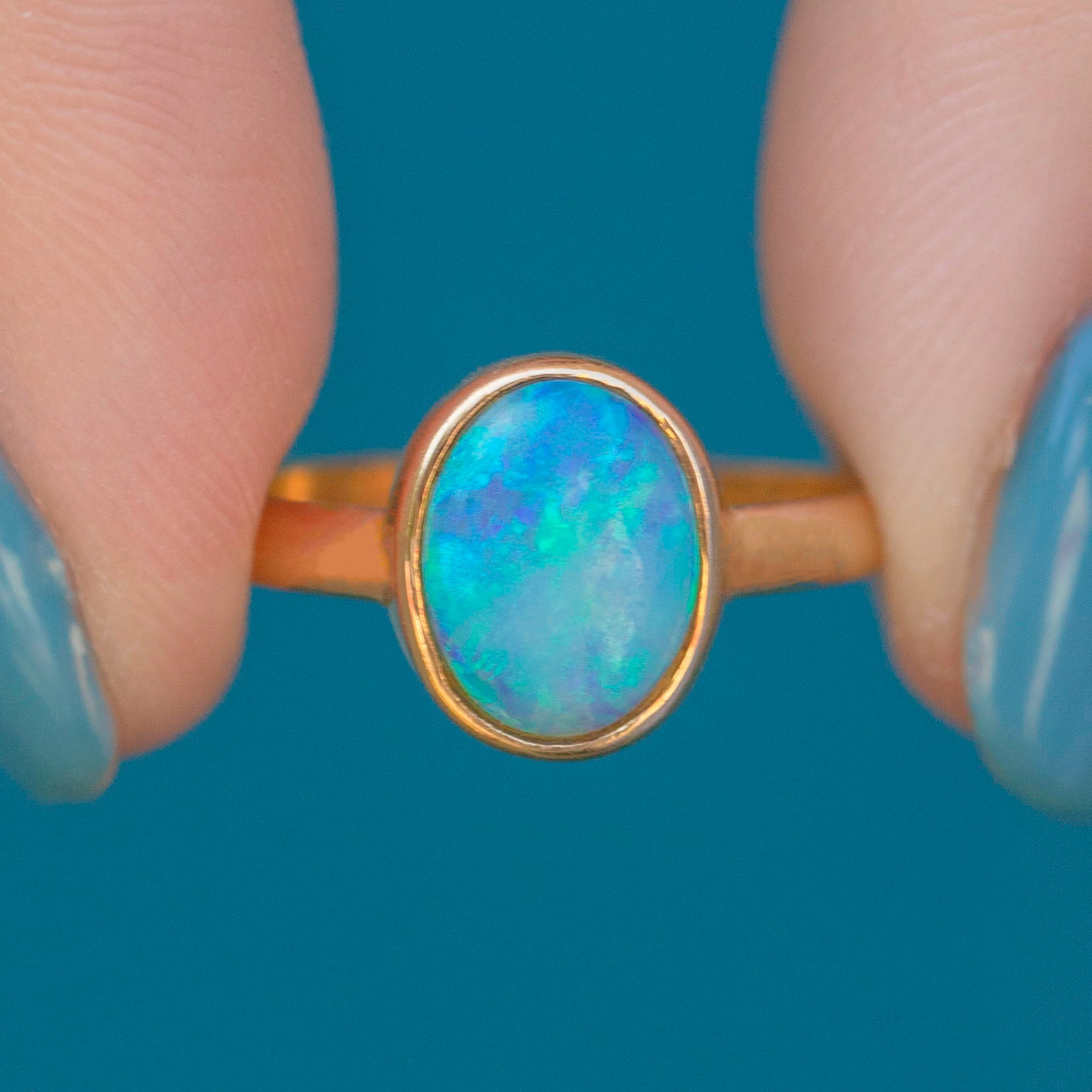 At a size J, she is the perfect size for a pinky ring, but that is not to say she cannot be resized if you think otherwise! Bound together in buttery 18ct Gold, the opulence radiates from this Victorian Opal ring. Complete with a domed setting back, she sits comfortably against your skin, designed with the wearer in mind.