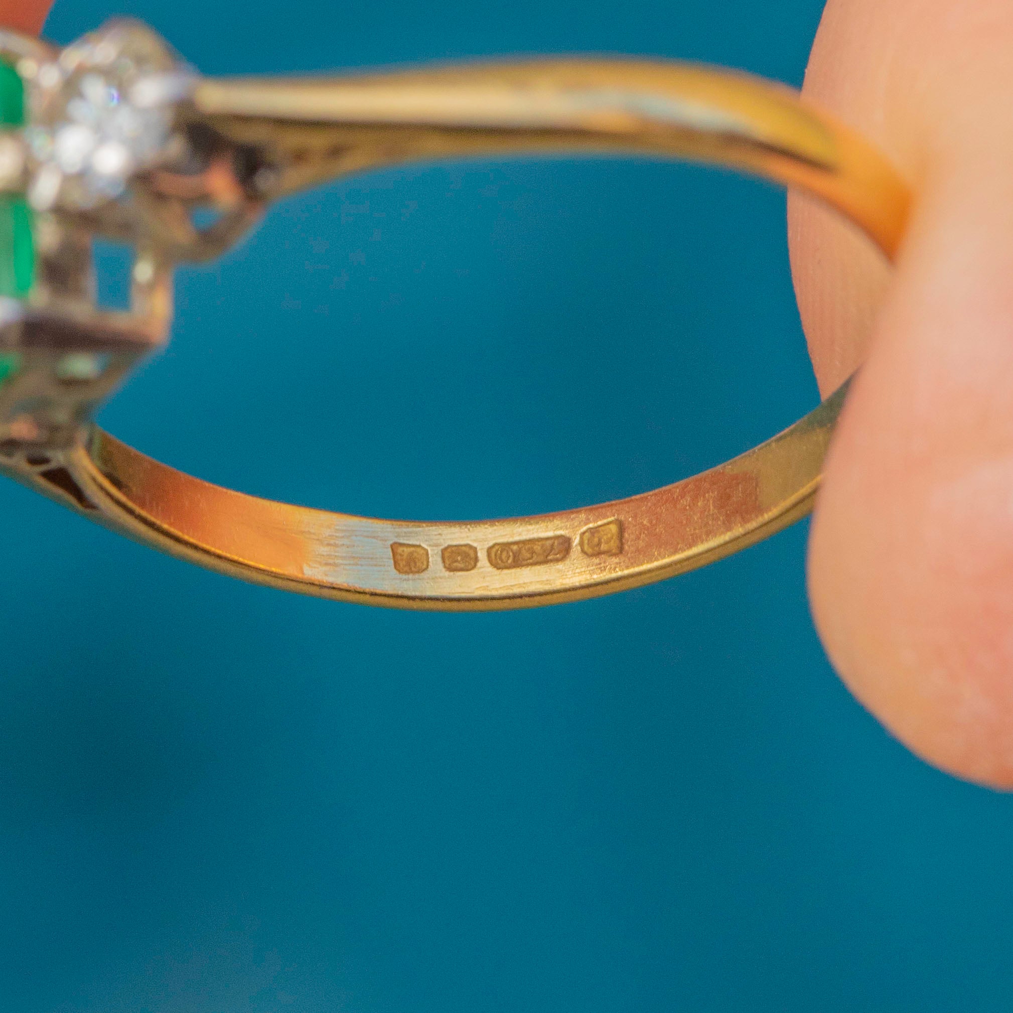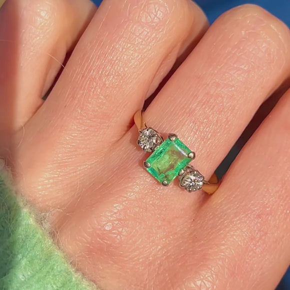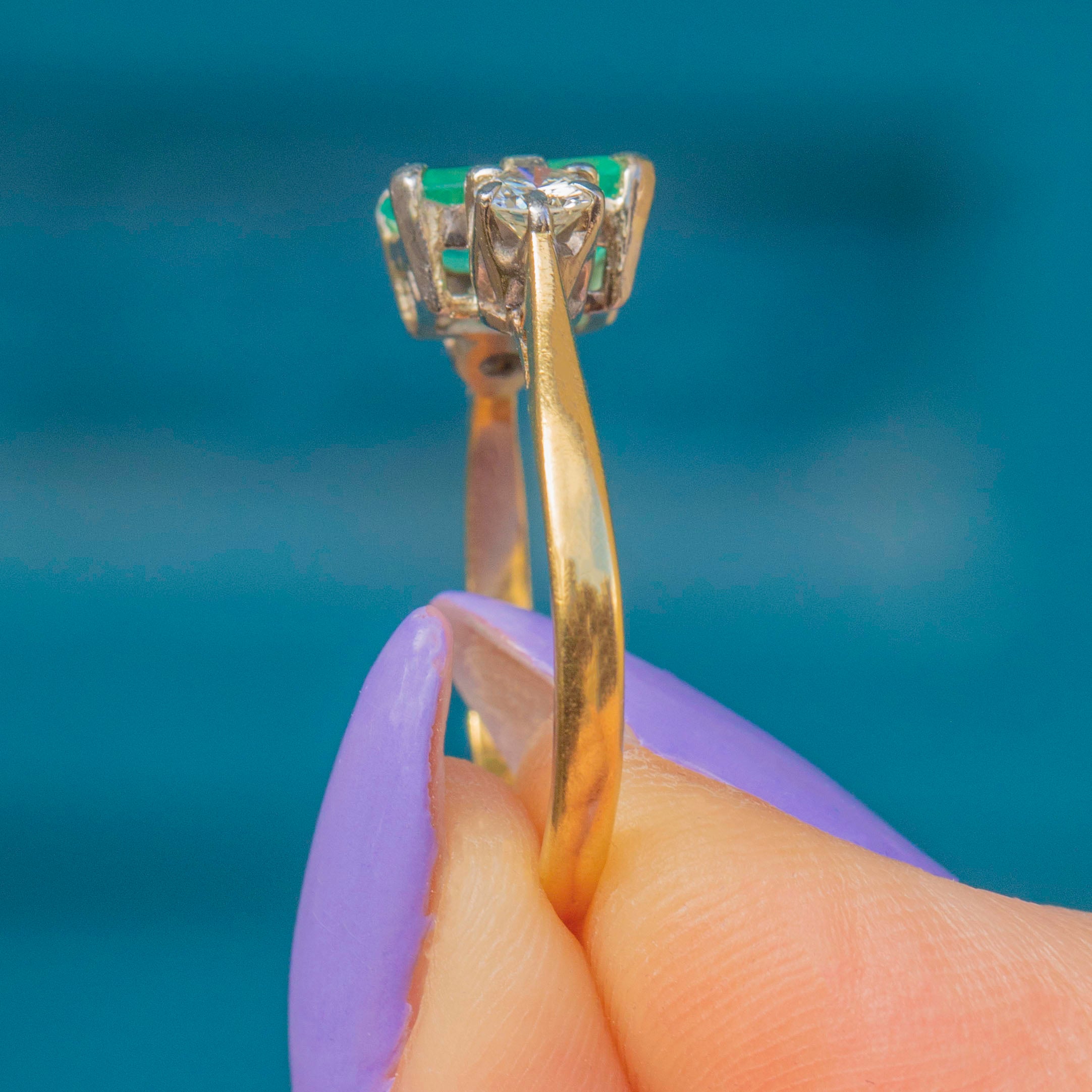 EXCELLENT: This 18ct Gold Emerald Diamond trilogy ring is in excellent condition! This gorgeous piece is like no other, with each gemstone securely set. The 18ct Gold band is hallmarked, and the Platinum settings provide extra strength. The Emerald has some wear and natural inclusions, adding to its unique character, but the Diamonds remain bright and secure. Overall, there is no significant damage to note—she's a beauty!
