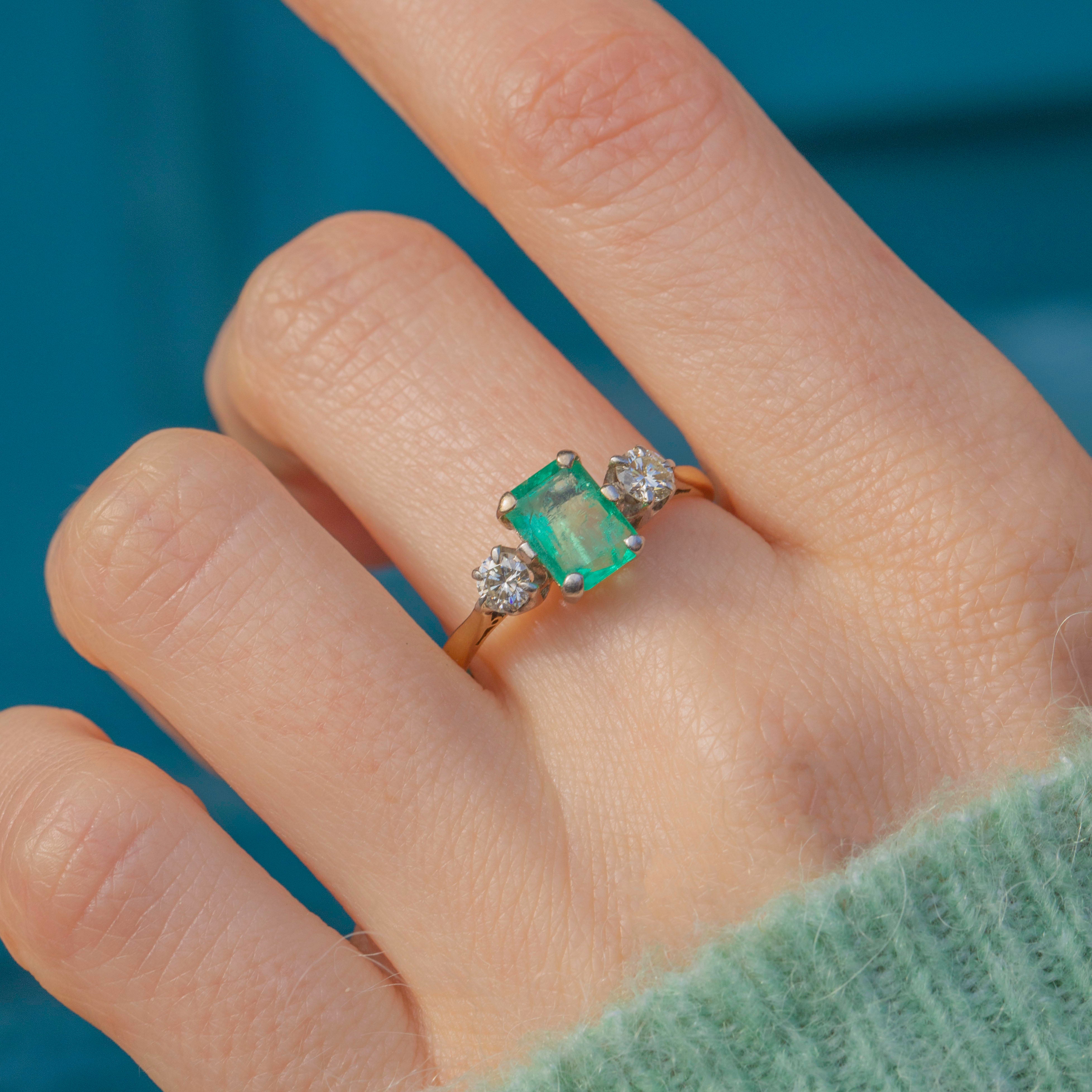 A divine 18ct Gold Emerald and Diamond trilogy ring to adorn your hand! Crafted from an 18ct Gold with Platinum settings, this is a robust piece that you can pop onto your finger for a vibrant pop of colour.