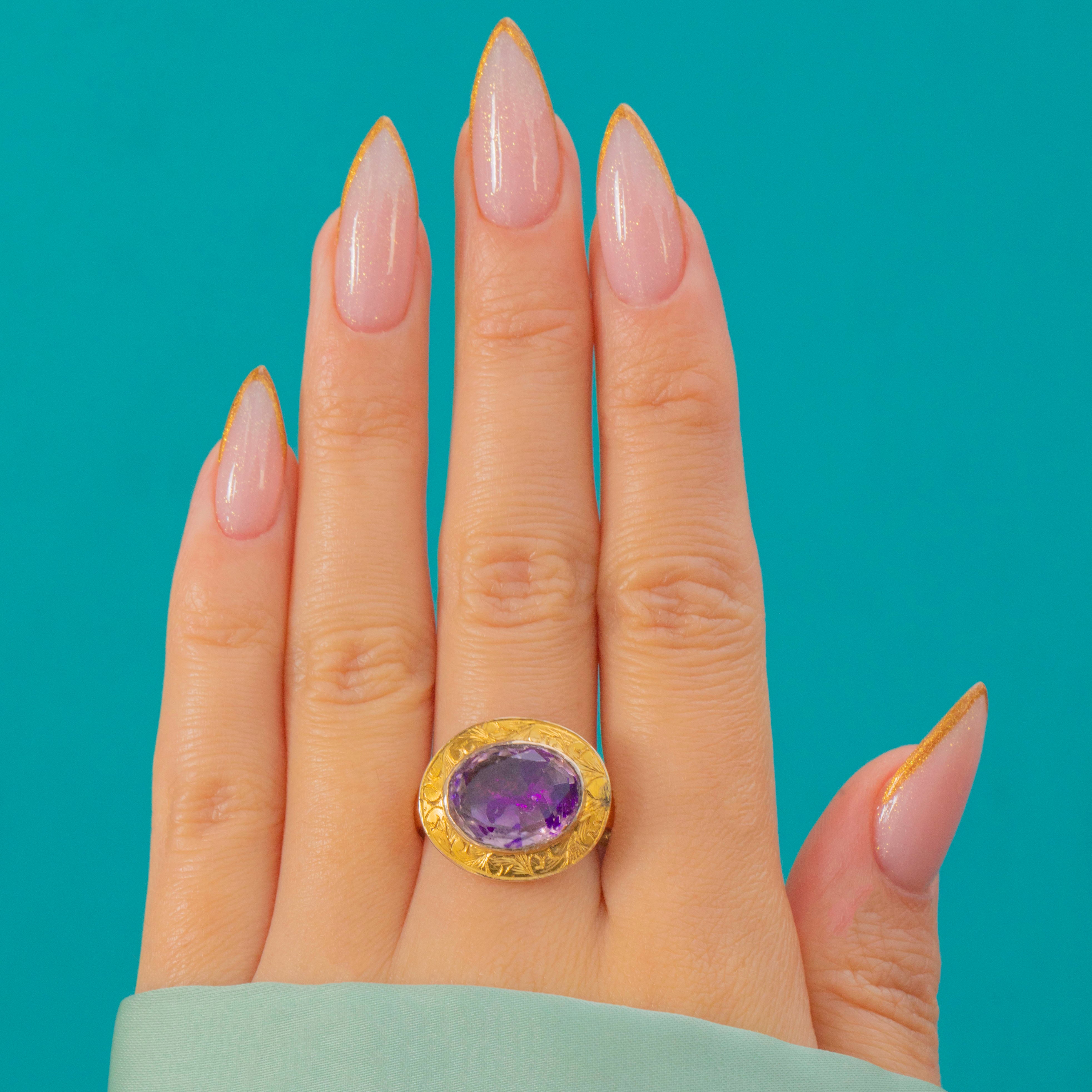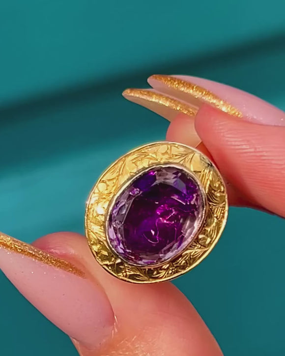 EXCELLENT: The foiled Amethyst shows exceptional colour and brilliance with only the gentle signs of age. The 18ct Gold band is newly made, substantial, and flawlessly polished, providing strength and elegance to this remarkable conversion. A perfect blend of antique artistry and contemporary luxury.