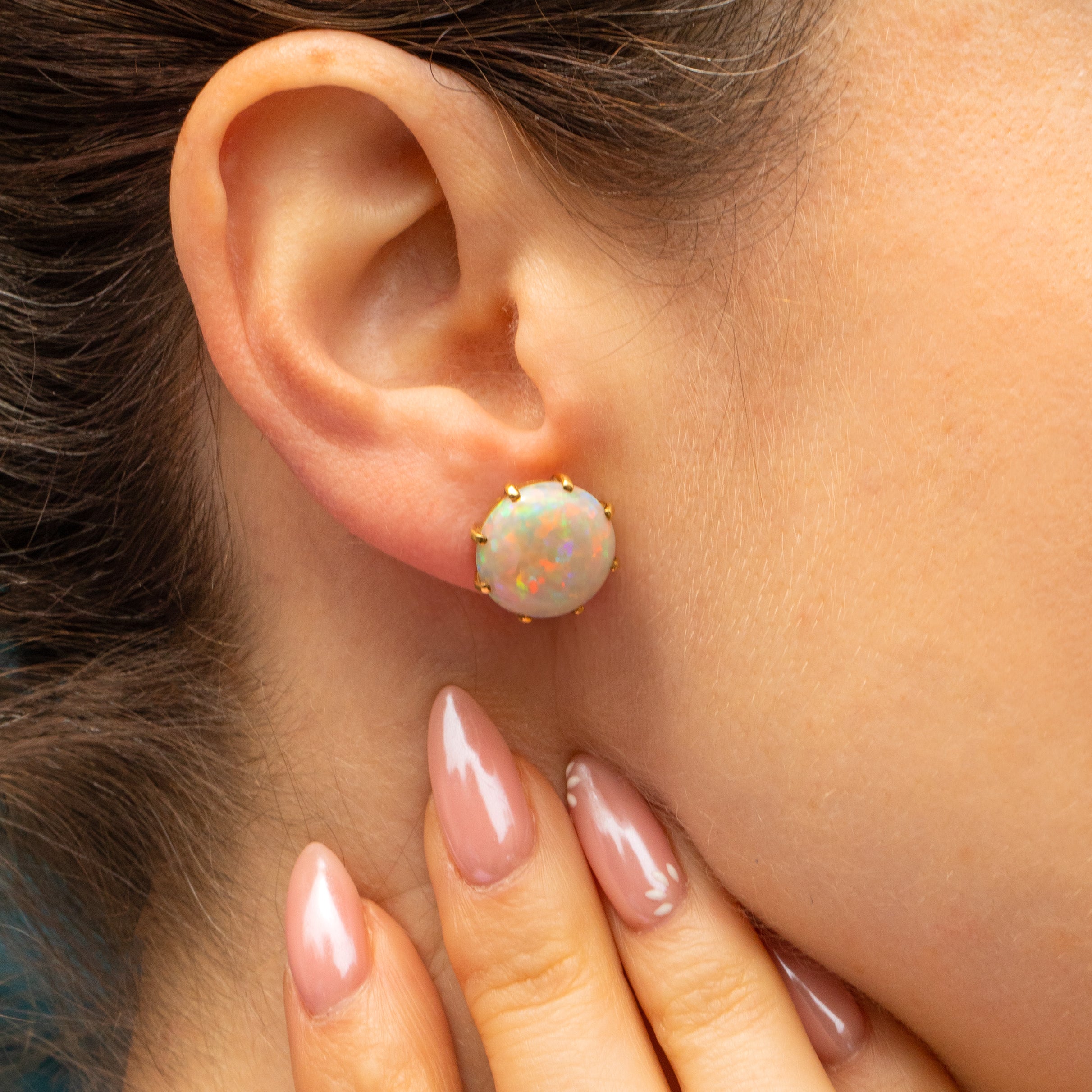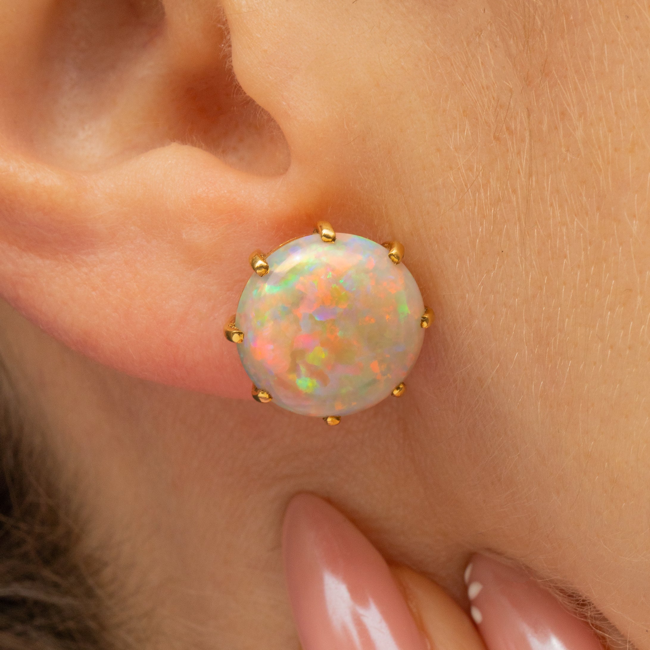 Feast your eyes on these impeccable 18ct Gold Opal stud earrings! Impressive in size, these cabochon-cut Opal earrings have a vibrant presence, looking beautiful in the ear with all colours of the rainbow emanating from their smooth surface.