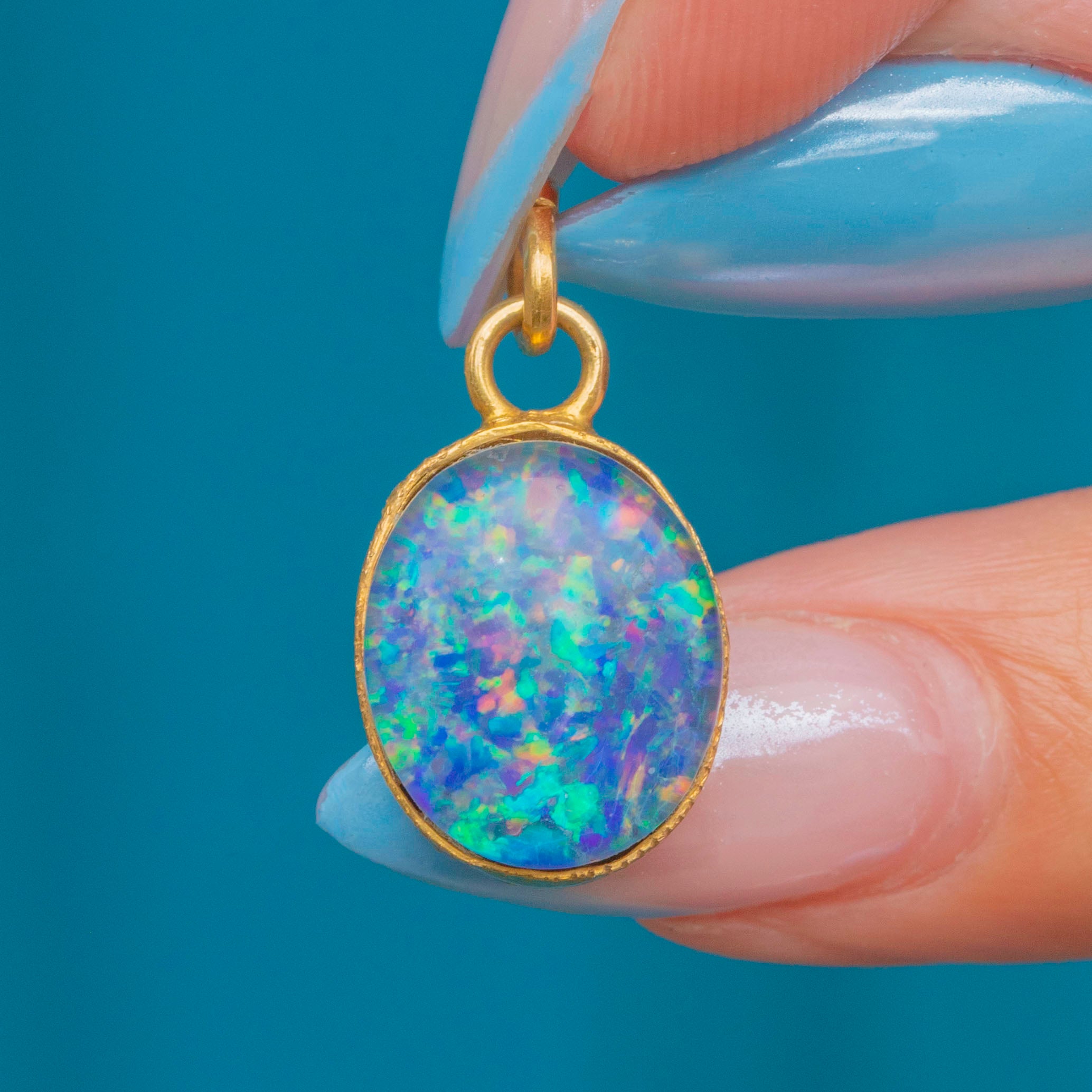 This dainty Opal triplet charm is a wonderful option to add a pop of colour to your attire, its lilac-blue hues interspersed by a kaleidoscope of striking green and orange flashes as the charm catches the light.