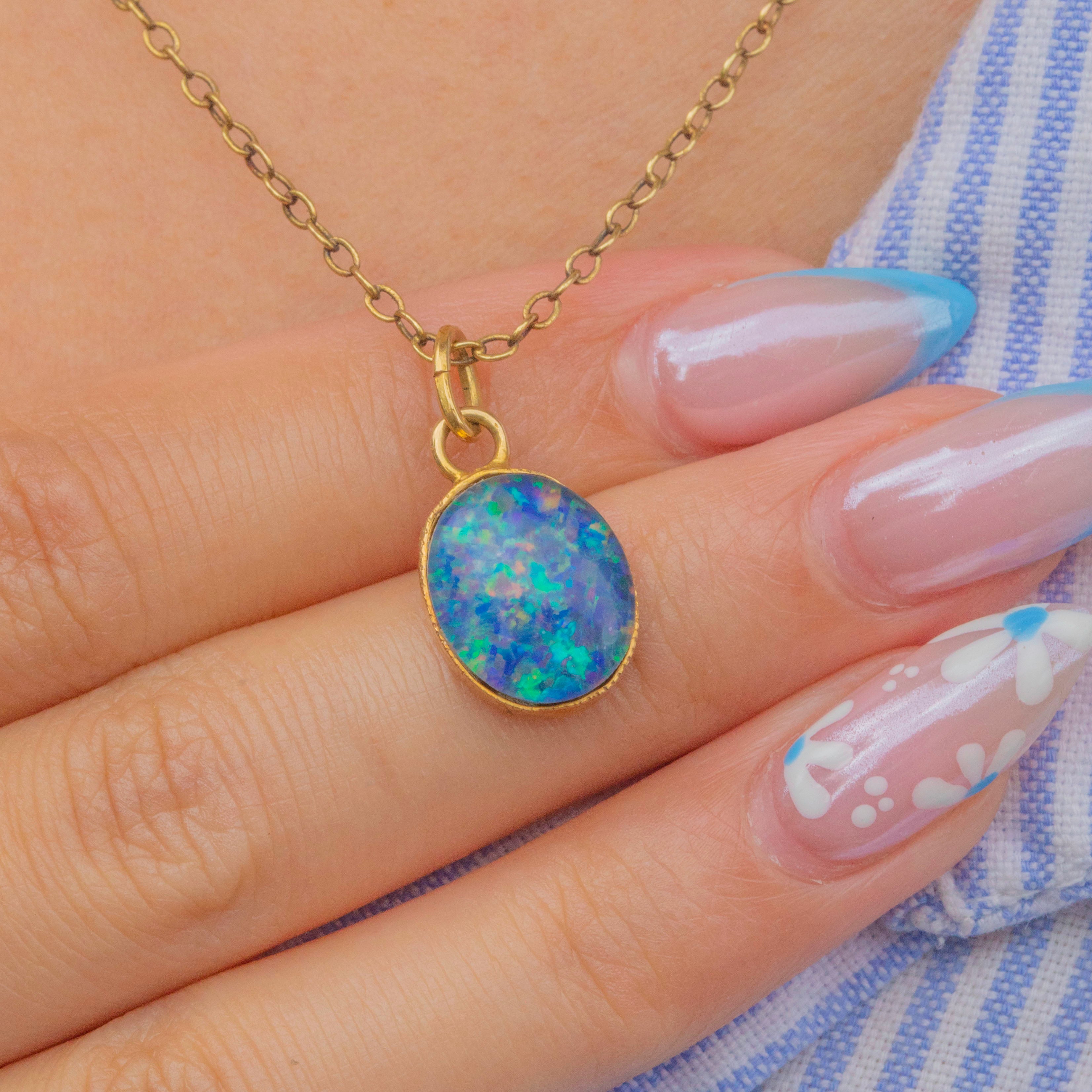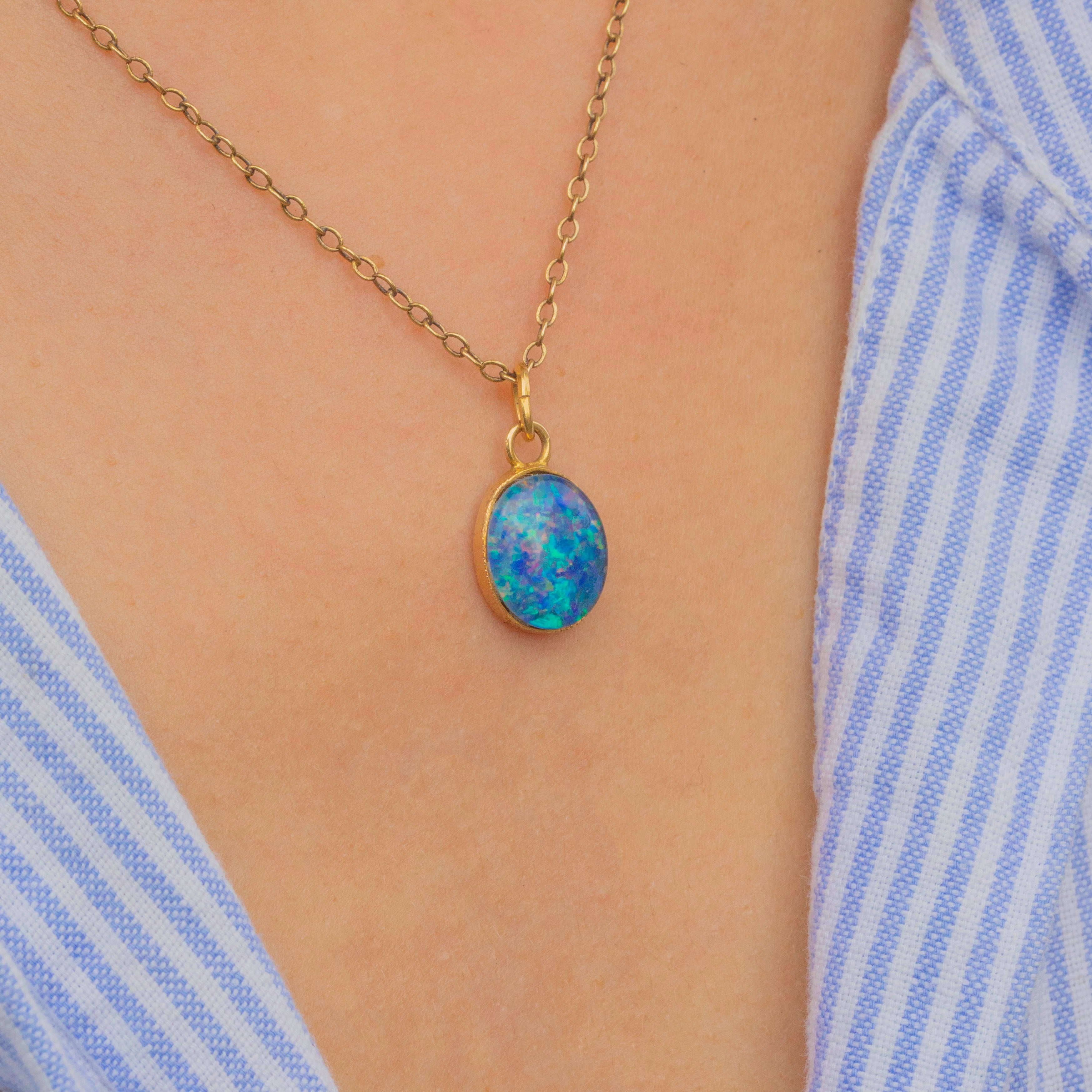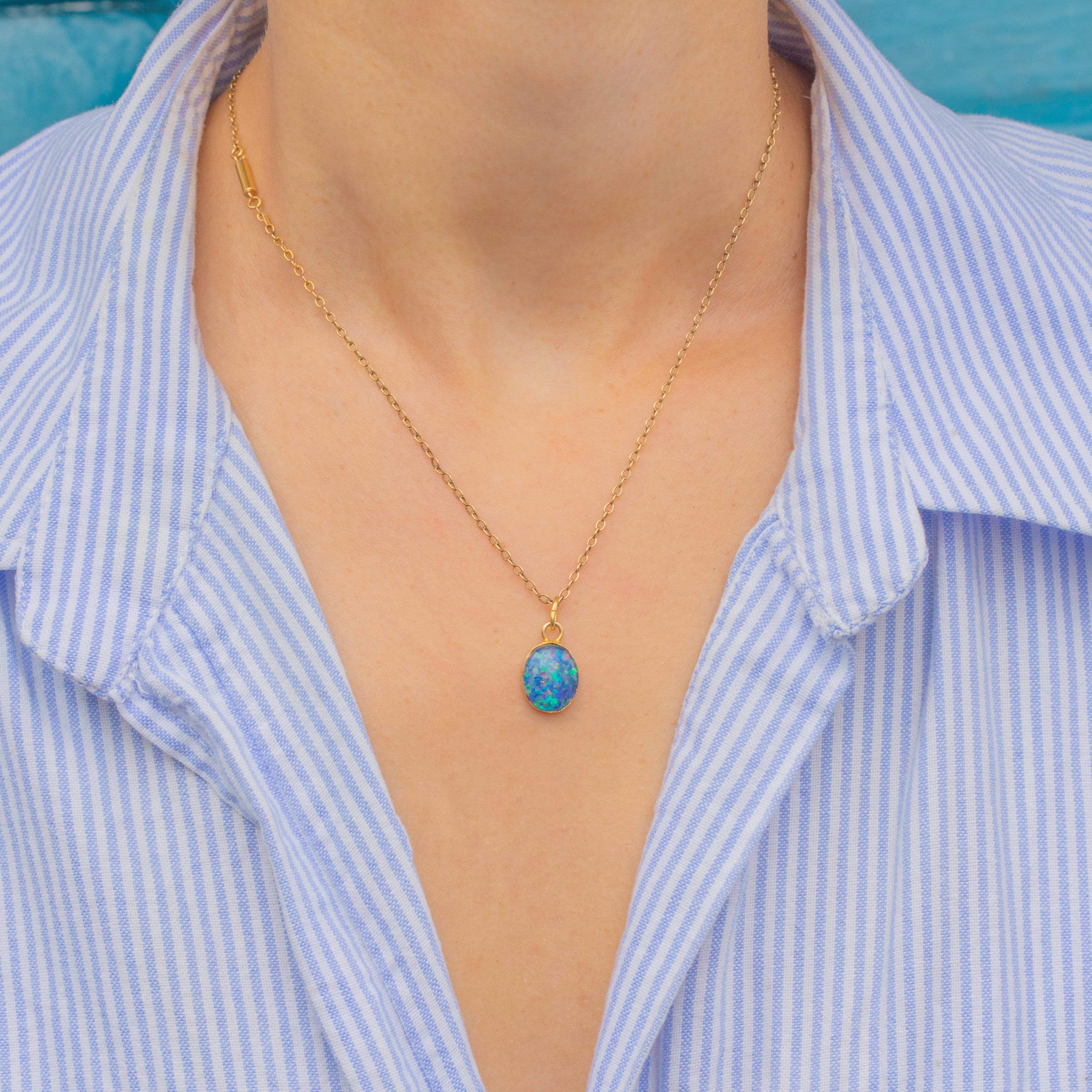 The Opal is encircled by buttery 18ct Gold and, with a smooth back, it will rest delicately on your décolletage when suspended from a fine chain.