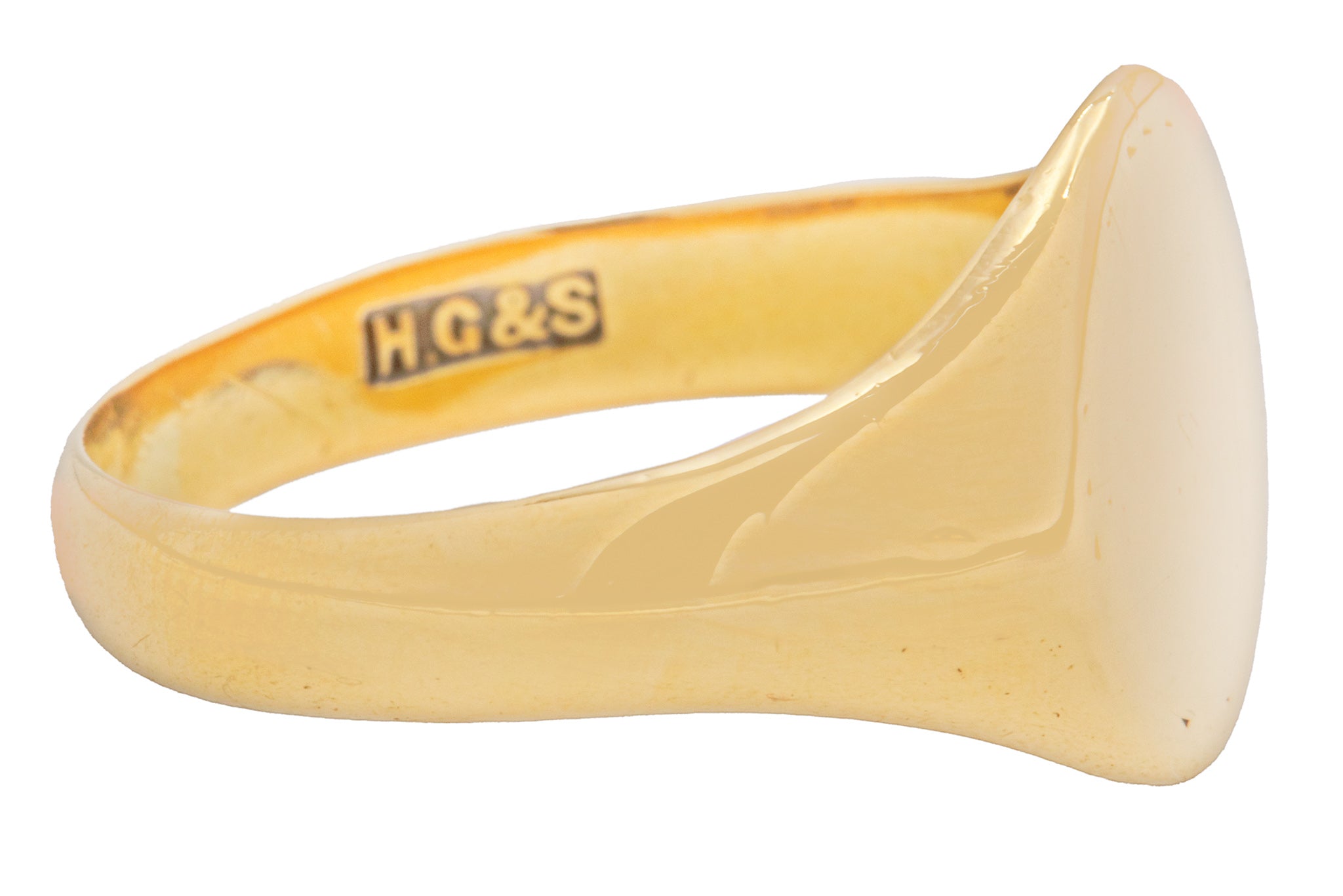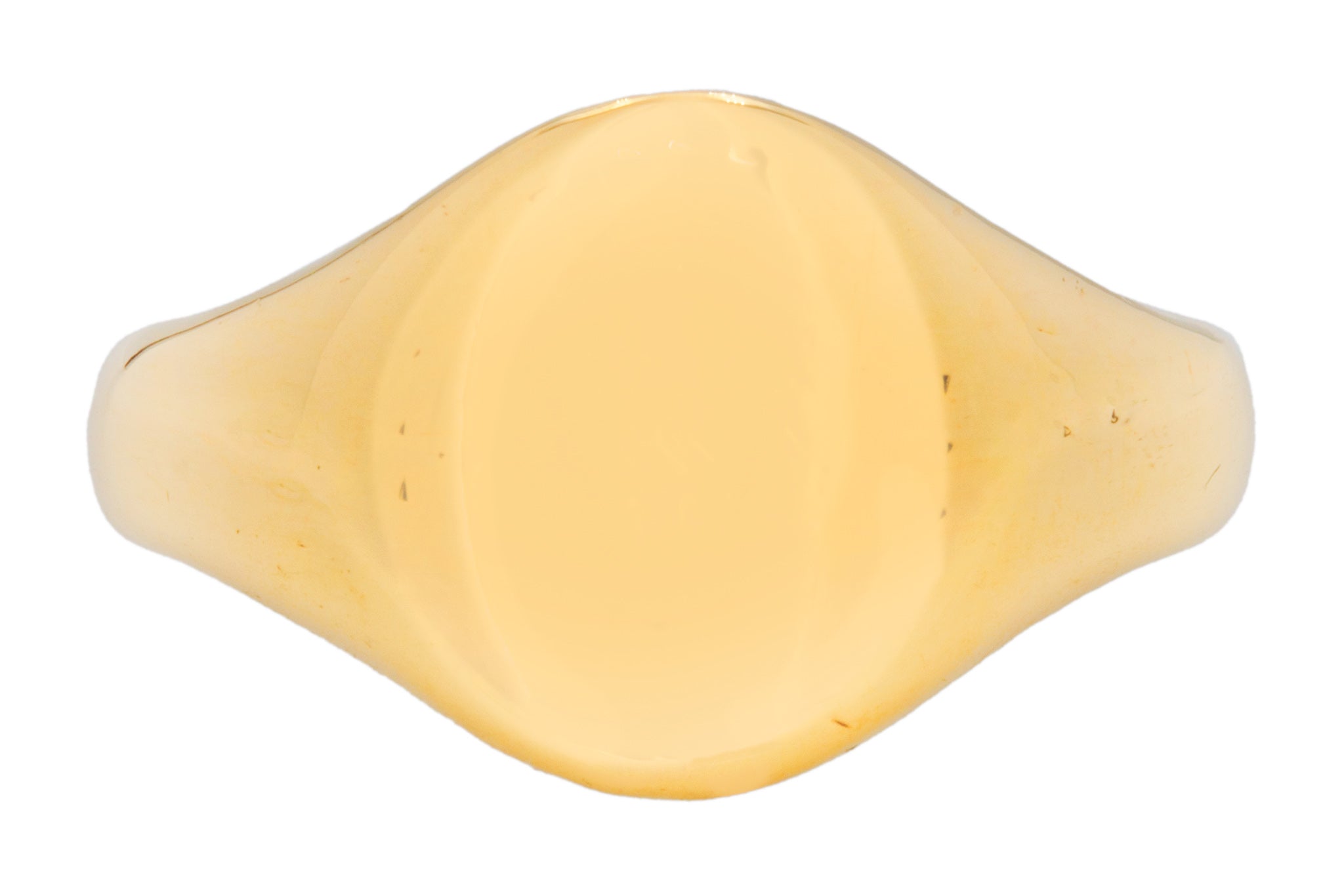 VERY GOOD. This 18ct Gold round signet ring is in very good condition. The inside of the band is fully hallmarked, and the band has a buttery tone overall. There are some faint engravings visible which have worn down over the years, but it's full of character nonetheless. There is an ever so slight and subtle resize mark, but this has been done well and the ring has remained fully intact.
