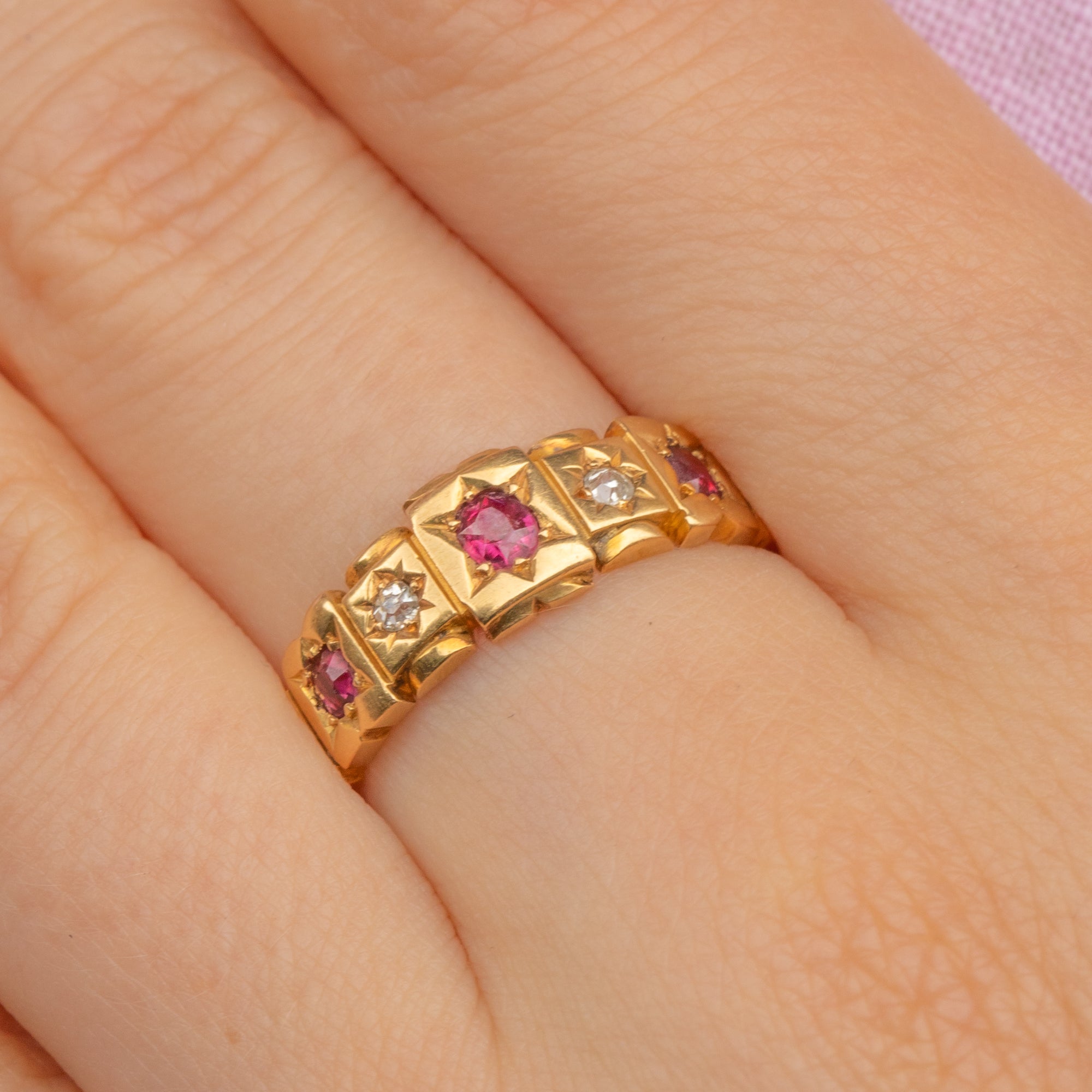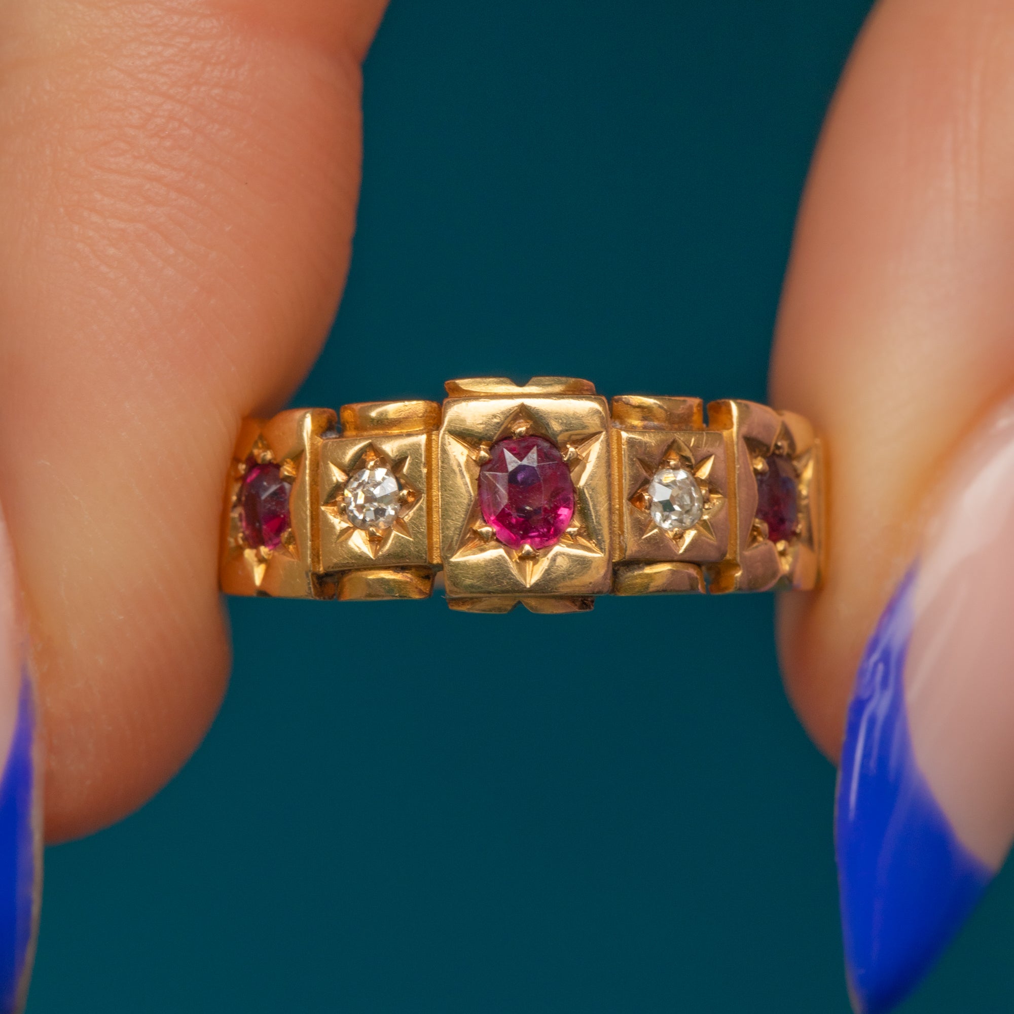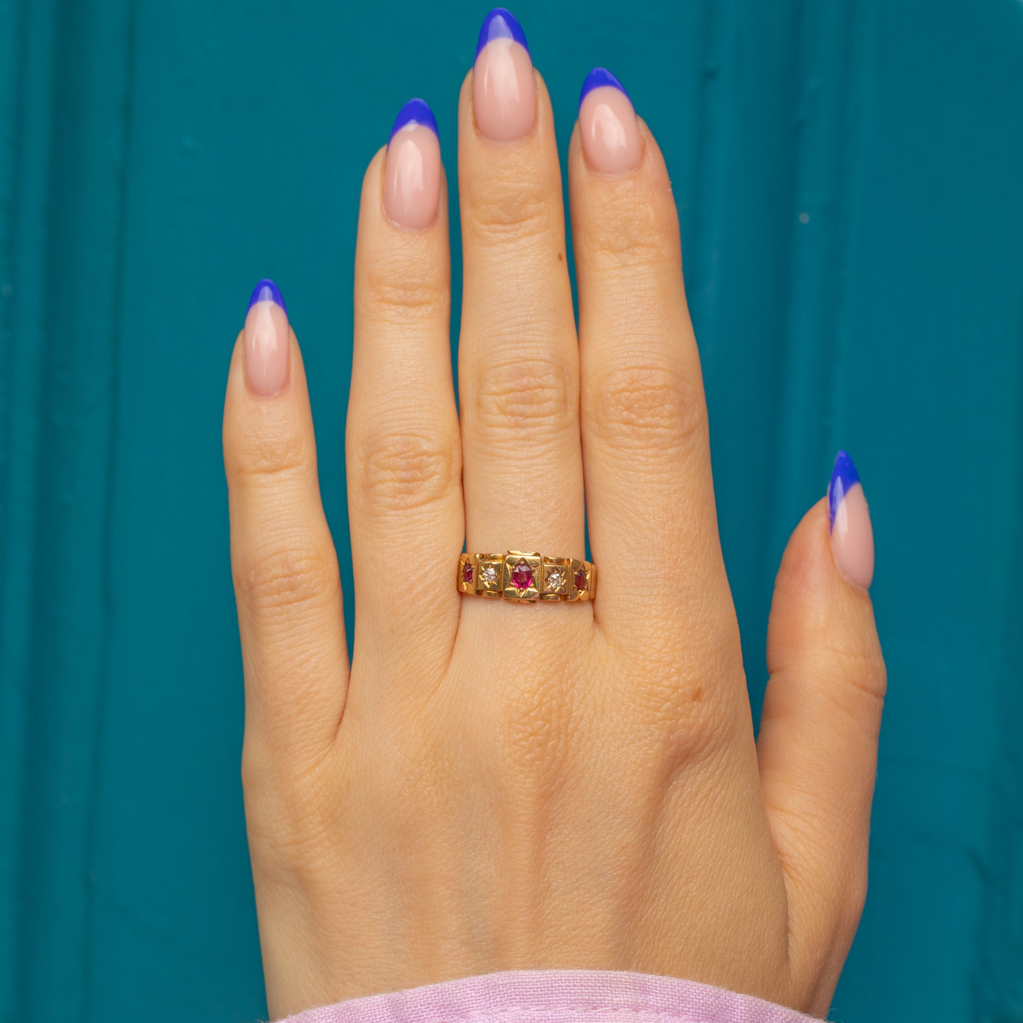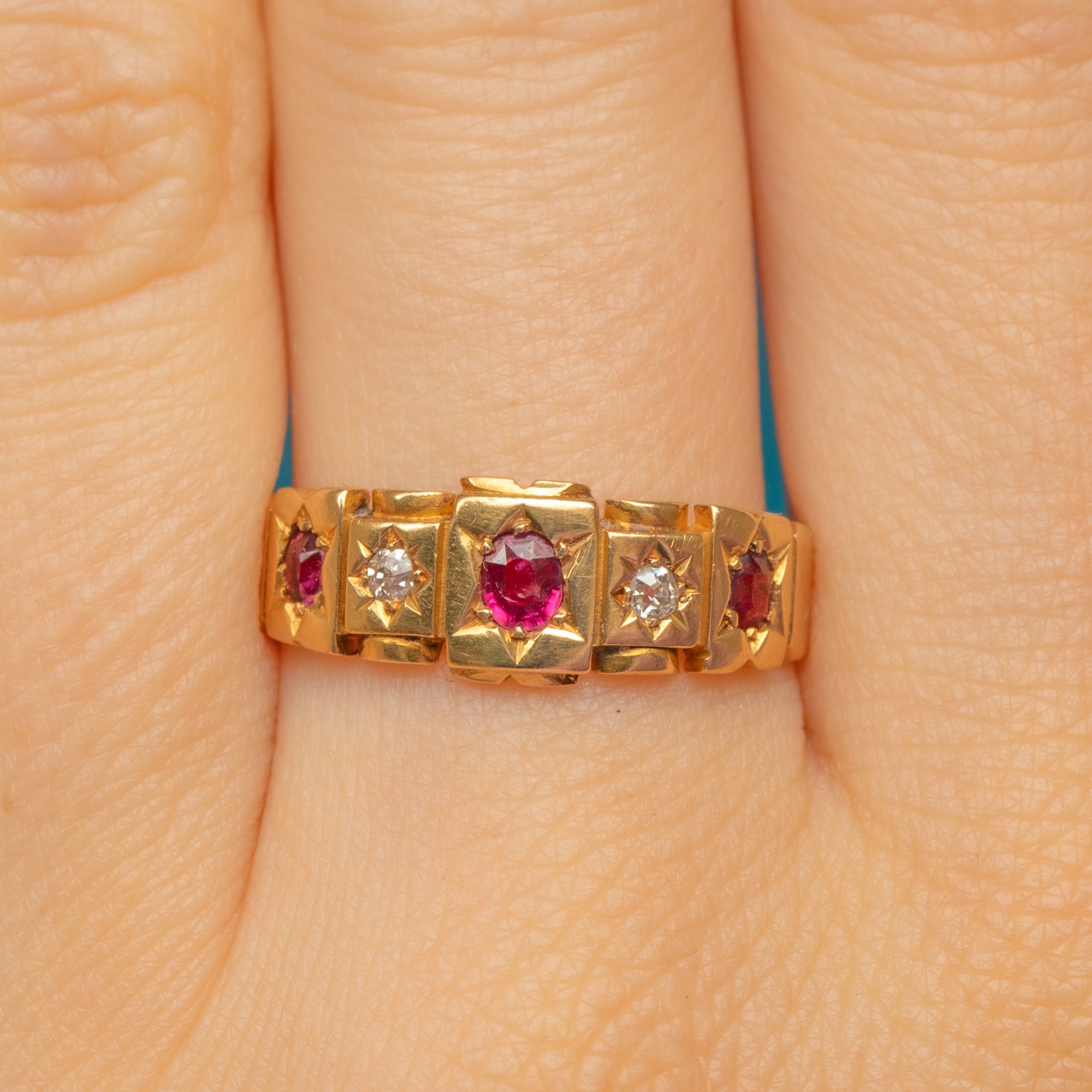 This 18ct Gold Ruby Diamond star-set five stone ring will make a wonderful addition to your antique jewellery collection!