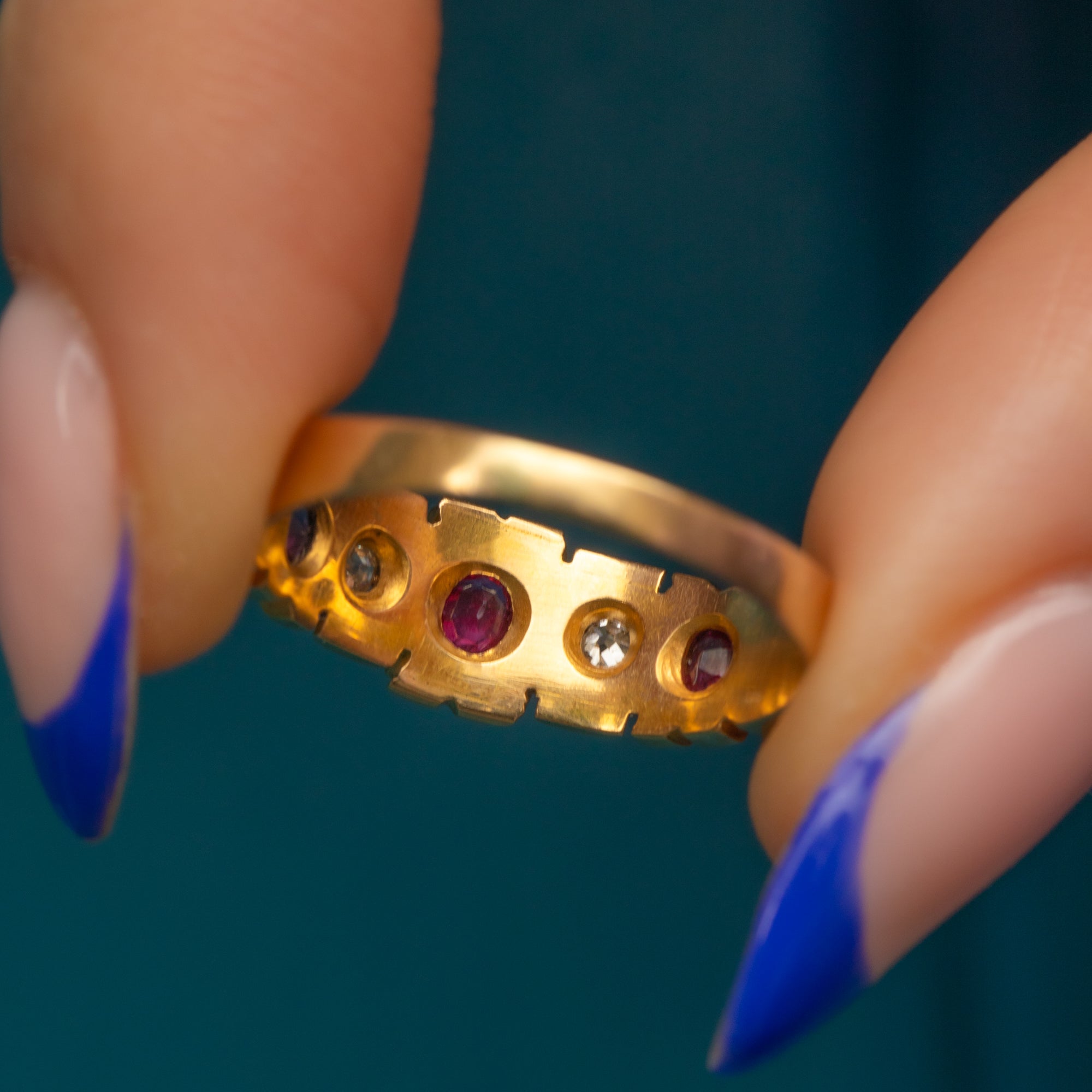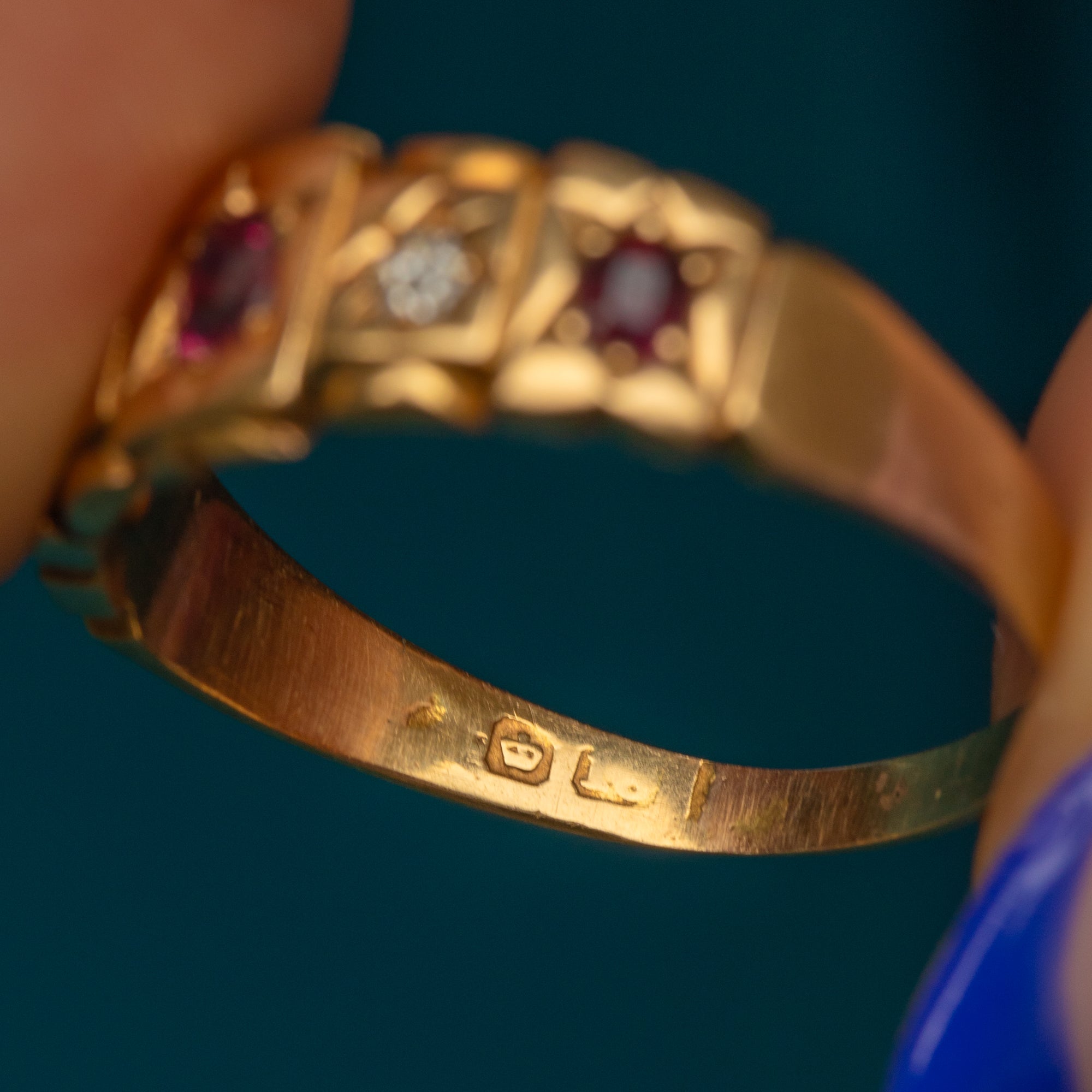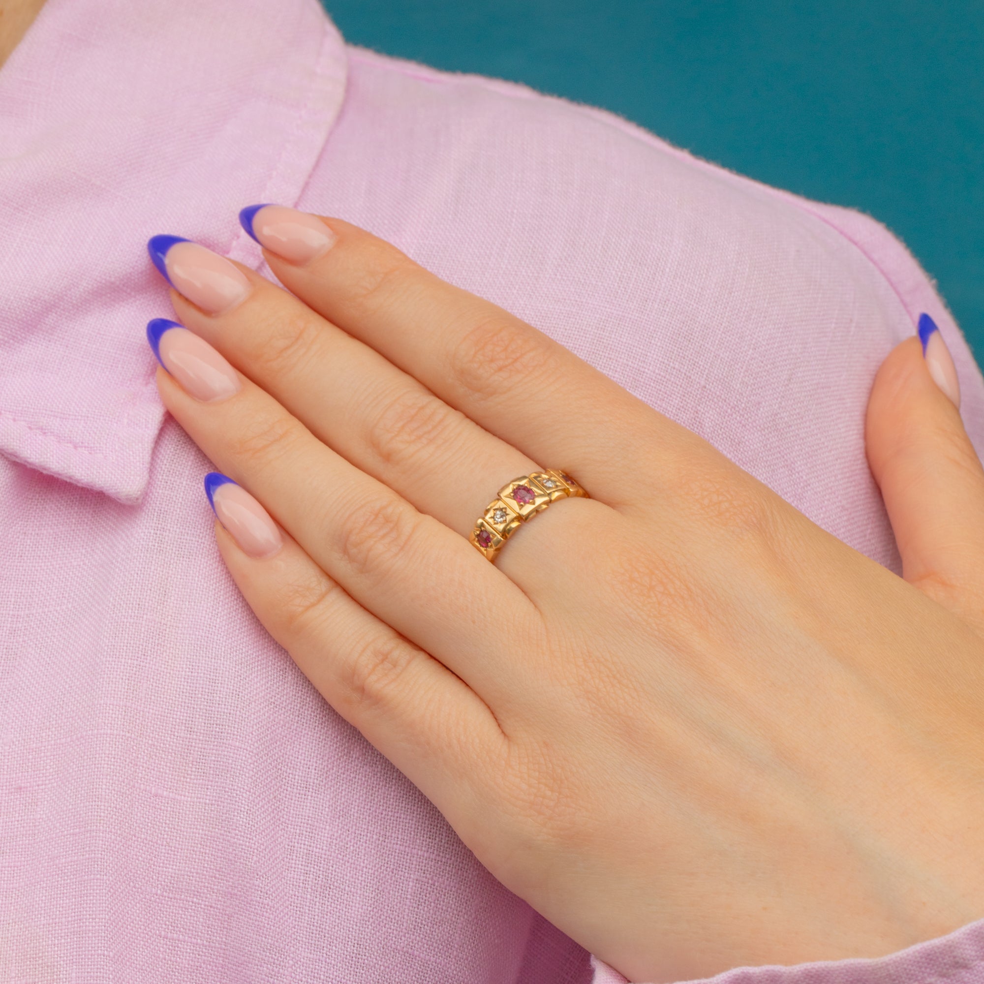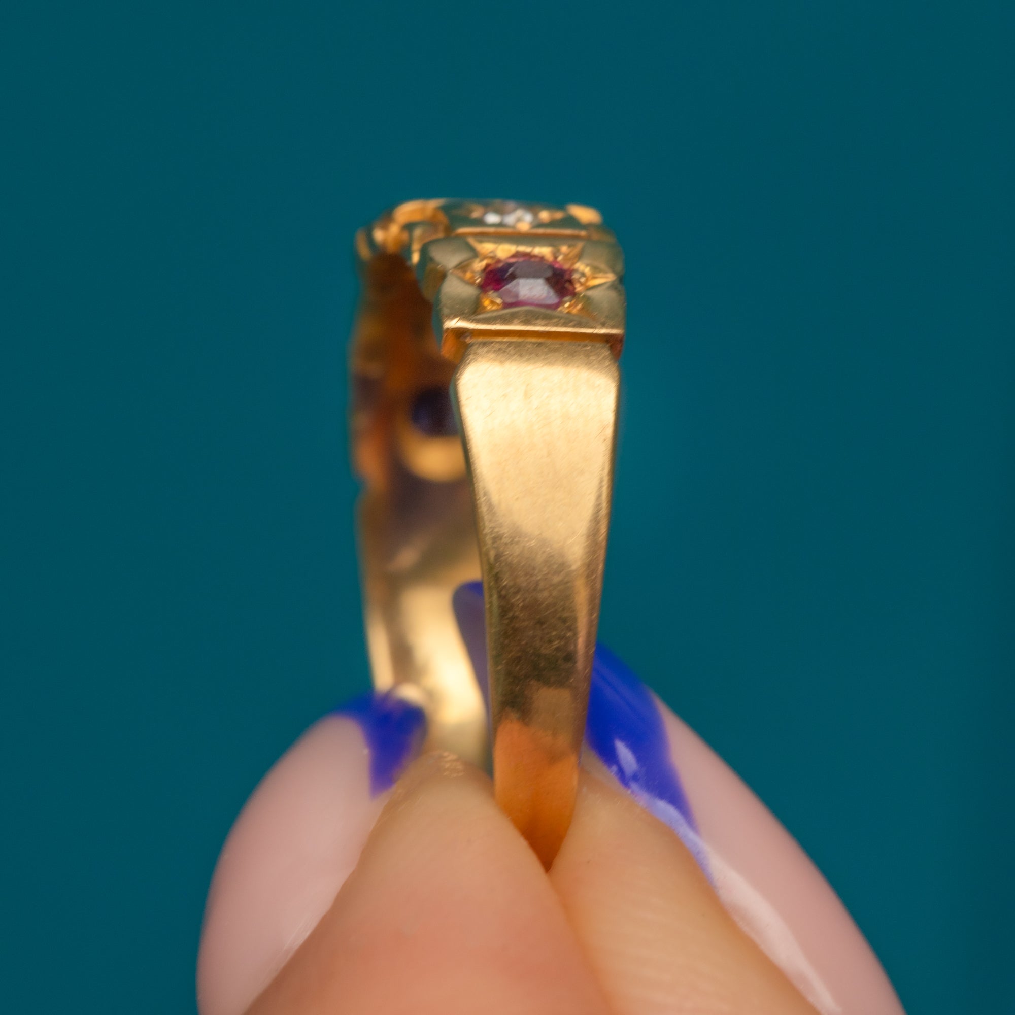 This 18ct Gold Ruby Diamond star-set five stone ring will make a wonderful addition to your antique jewellery collection!