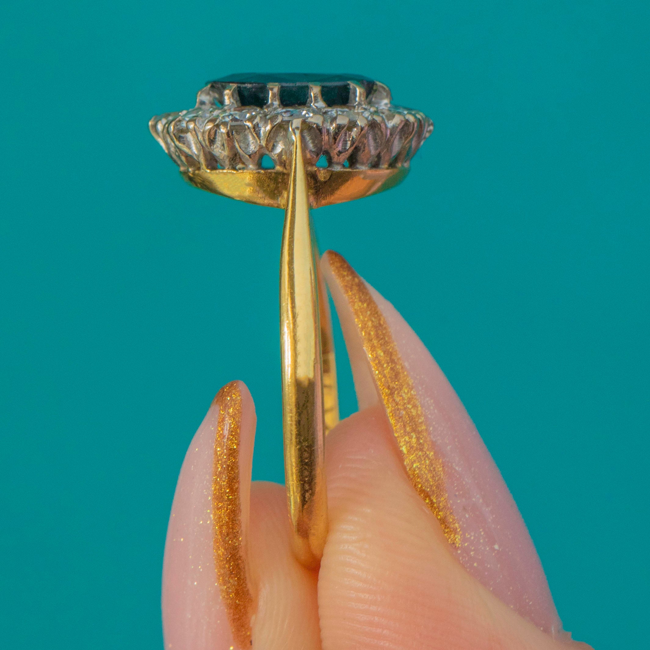 A striking Vintage Sapphire and Diamond ring dating to 1974, crafted in rich 18ct Gold. The centrepiece is a beautifully proportioned oval 2.00ct Sapphire, framed by a halo of twelve bright Diamonds totalling approximately 0.75cts. Bold, elegant and wonderfully glamorous, it’s a timeless late-20th-century design that wears beautifully on the hand.