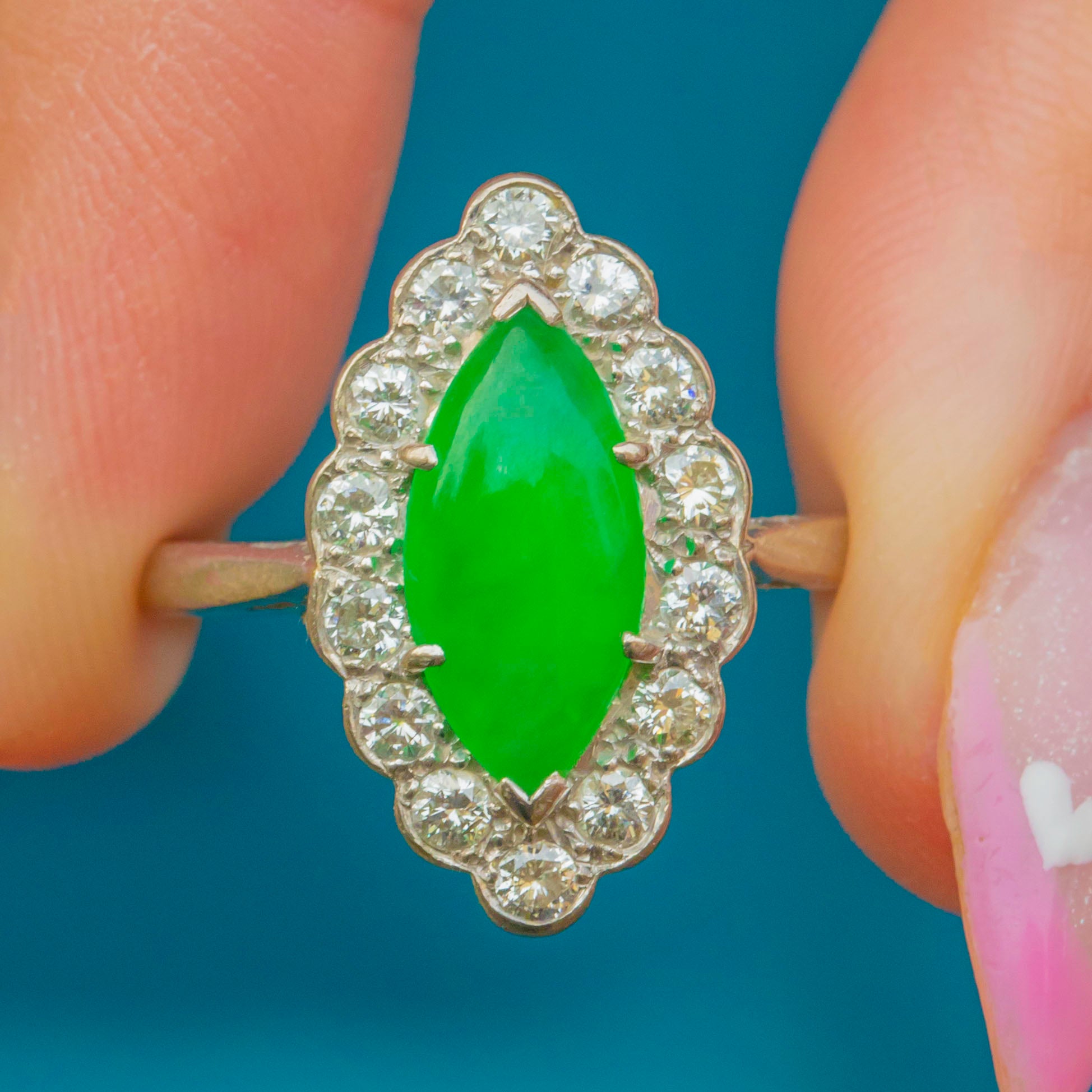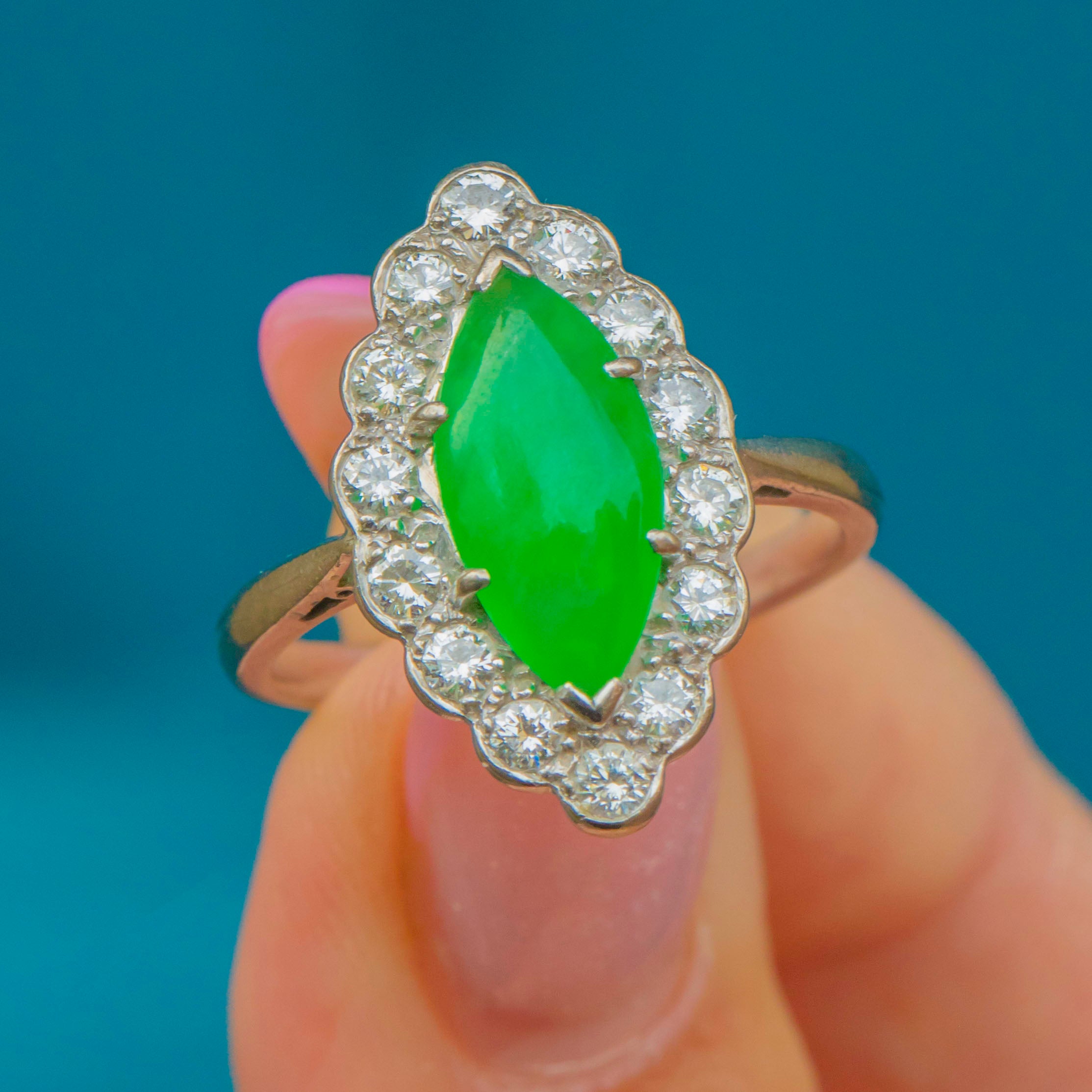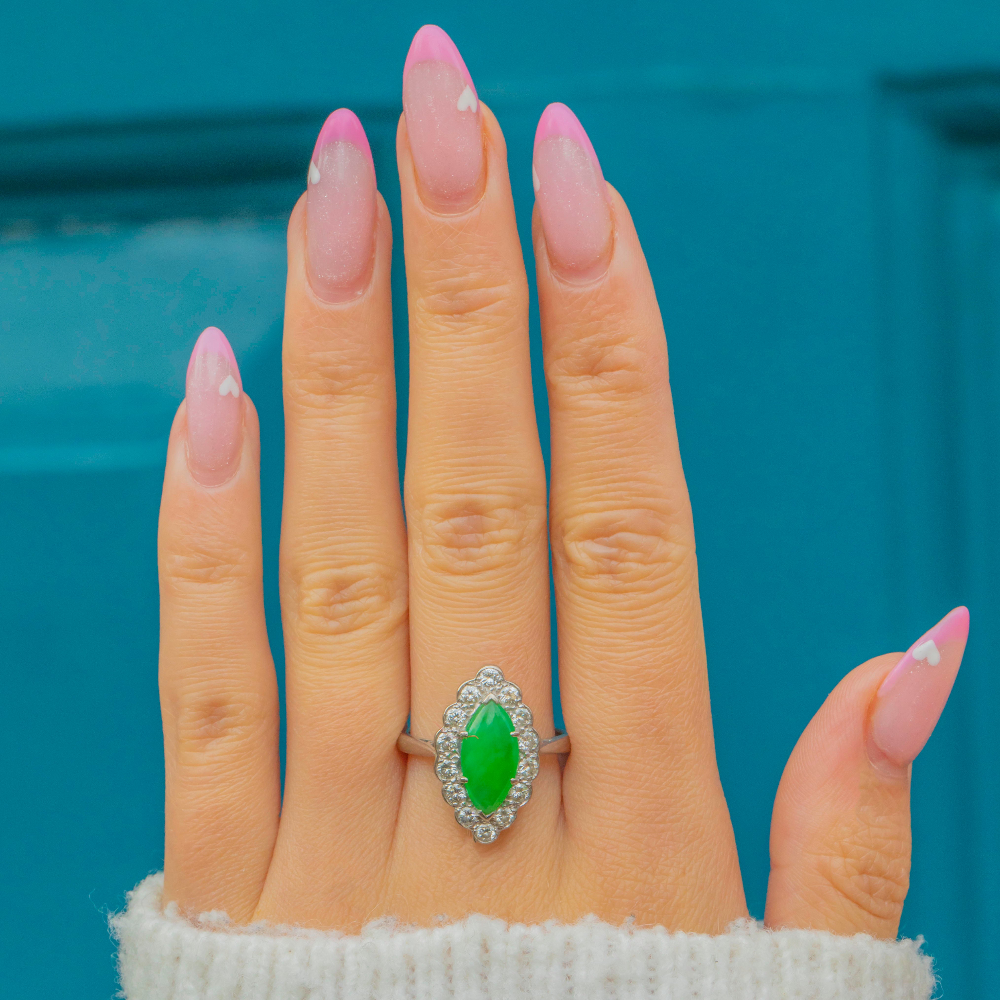 Turn your friends green with envy with this 18ct white Gold Jade Diamond navette ring! A marbling green Jade composed of forest greens and fern is poised at the centre, beautifully complimented by the 0.85ct spread of scintillating Diamonds surrounding her circumference.