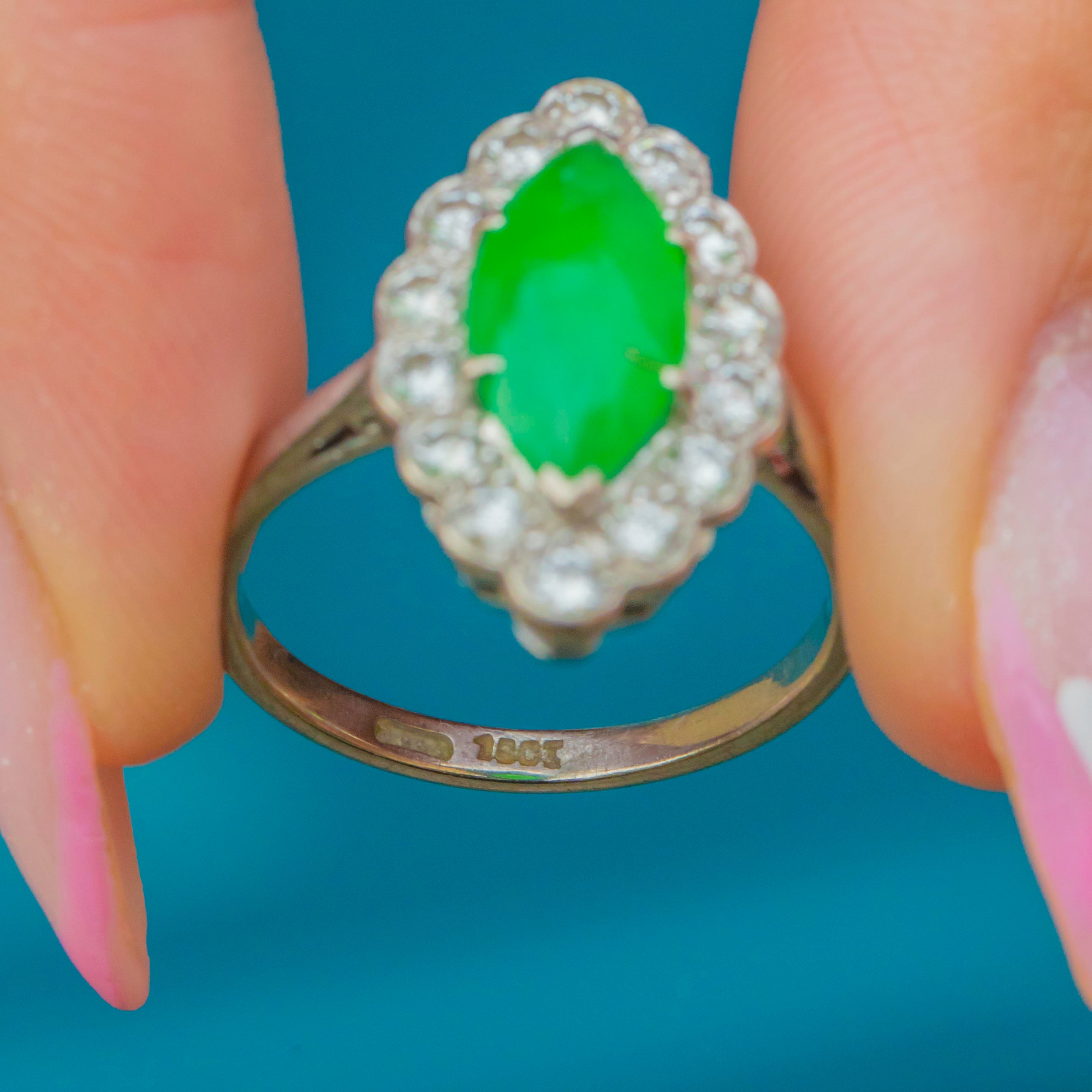 EXCELLENT. This 18ct white Gold Jade Diamond navette ring is in excellent condition! The Jade sits securely in the centre, with all claws present, showcasing a vibrant pop of colour across her smooth cabochon cut. The Diamonds have an unmissable sparkle, with each one present, securely set, and free from fleabites. The 18ct white Gold is in great nick, with a well rounded form to guarantee comfortability. We will be sad to see her go!