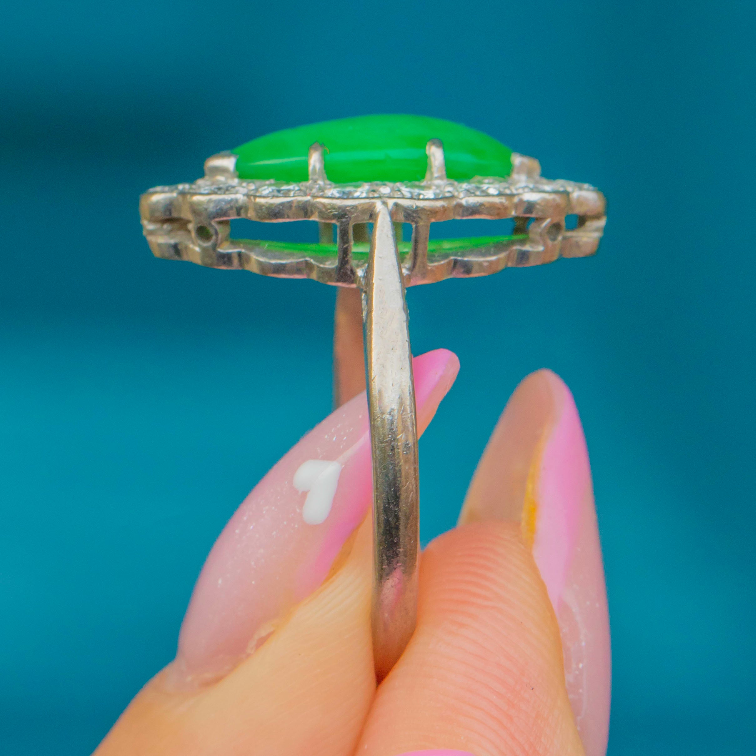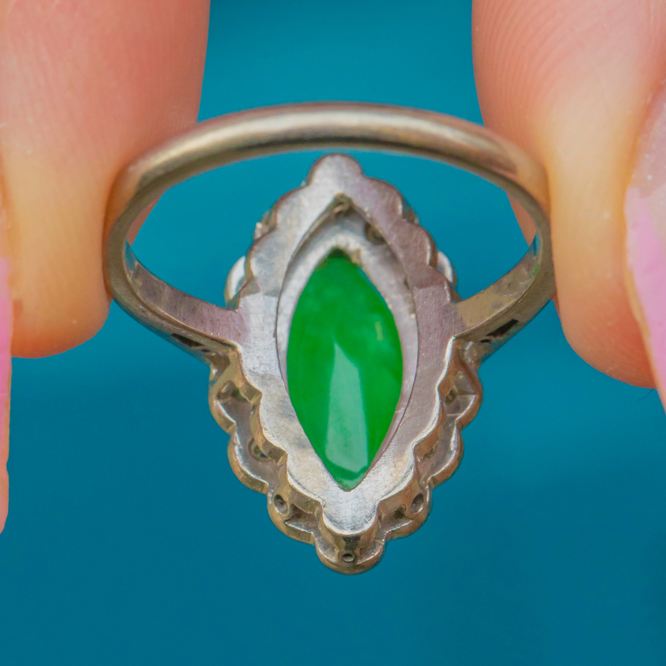 The flattering navette form of this Art Deco Jade ring elongates your finger and provides wonderful coverage. Bound together by splendorous 18ct white Gold, this Art Deco ring glides onto your hand a dream and sits so comfortably, you will never want to take her off!