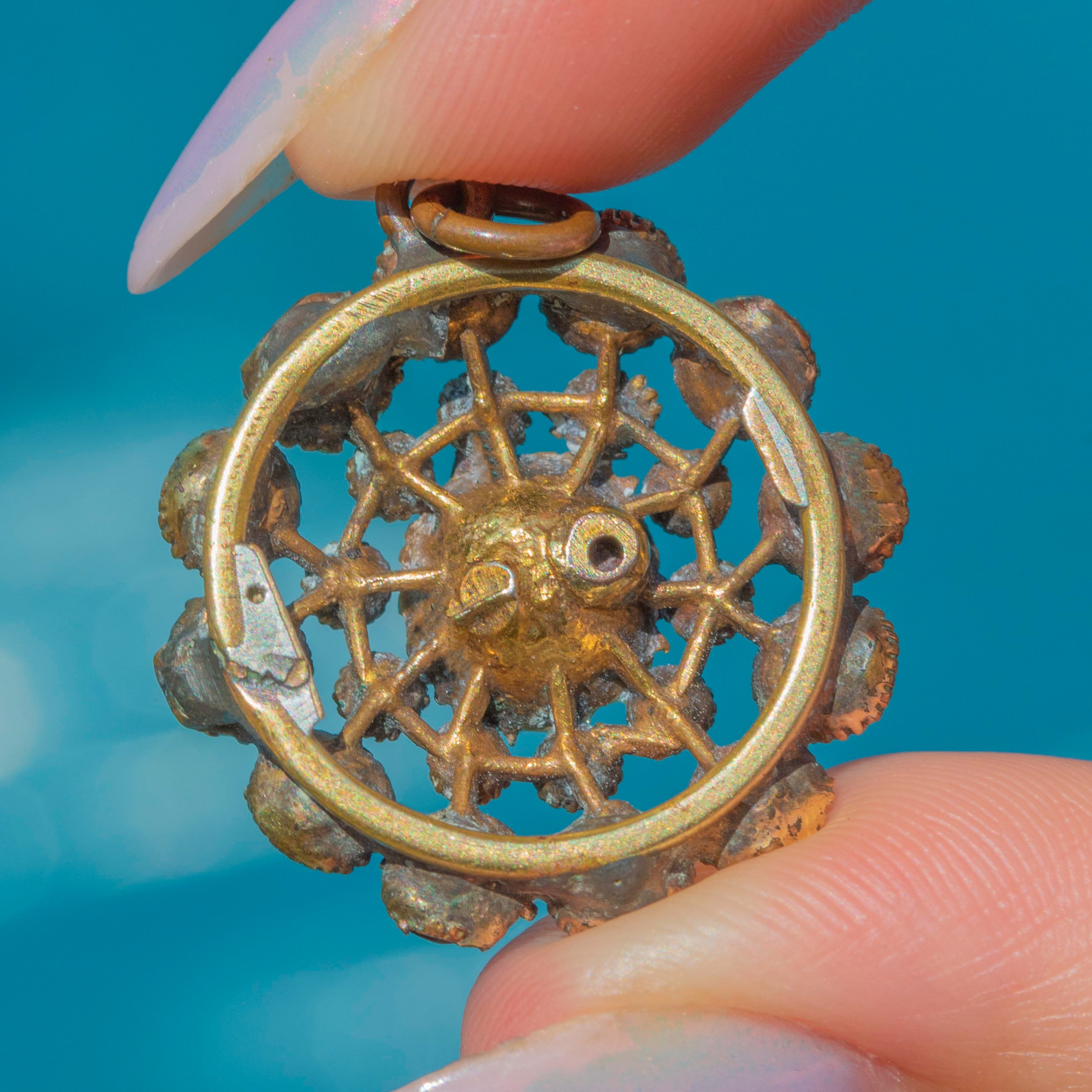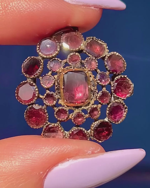 VERY GOOD: This Georgian pendant is in very good condition for a piece of its age. The Garnets have a gorgeous variation in hue and remain securely set. The pendant does show signs of wear, being over 200 years old, including some small chips to the Garnets and wear on the settings, which can be seen in the photos and is in keeping with its age. Starting life as a brooch, this piece has at some point been converted into this highly wearable pendant. The evidence of the conversion is not visible looking front on and does not affect the comfortability of the pendant. With bundles of antique character to be admired, this Georgian Garnet pendant is ready to be worn and enjoyed!