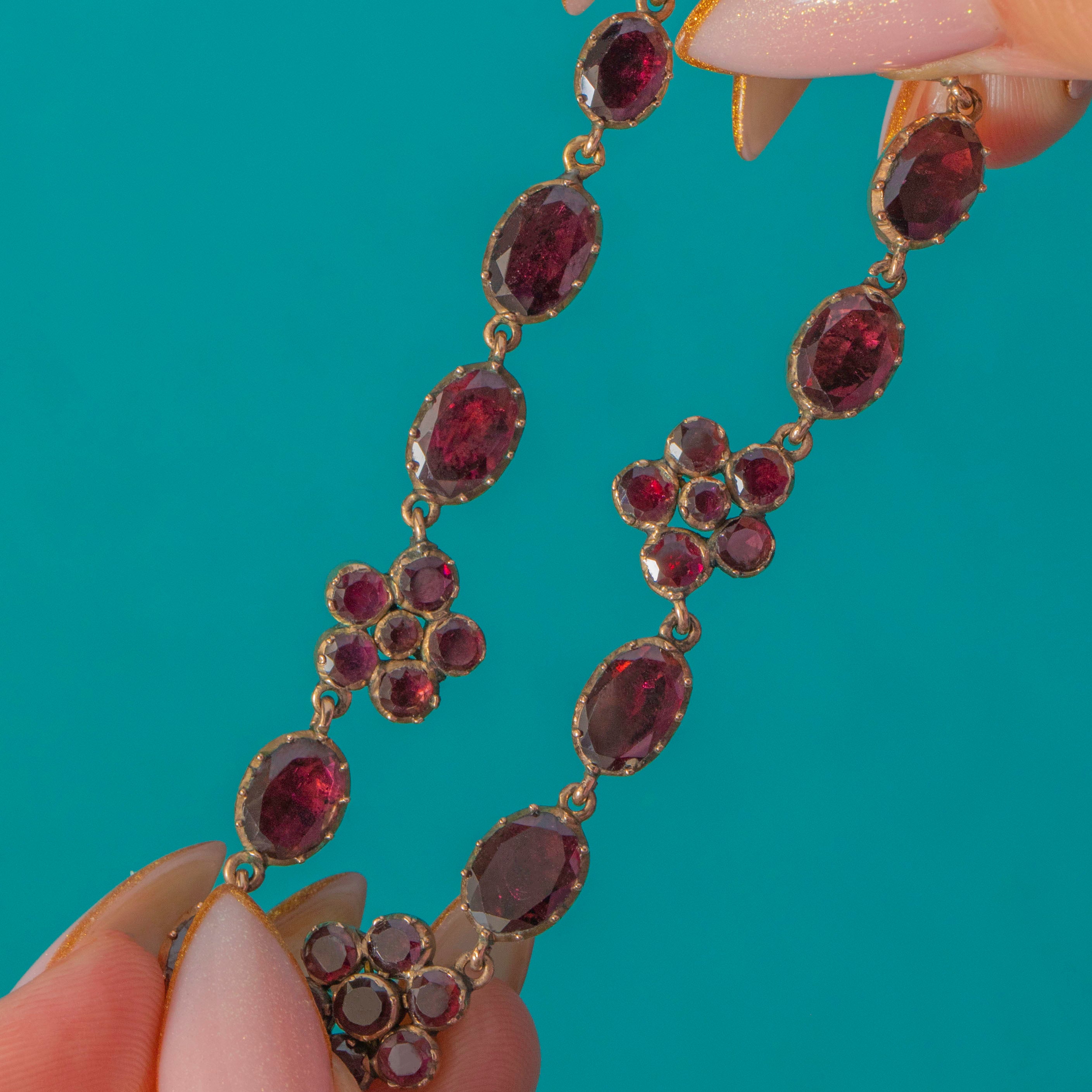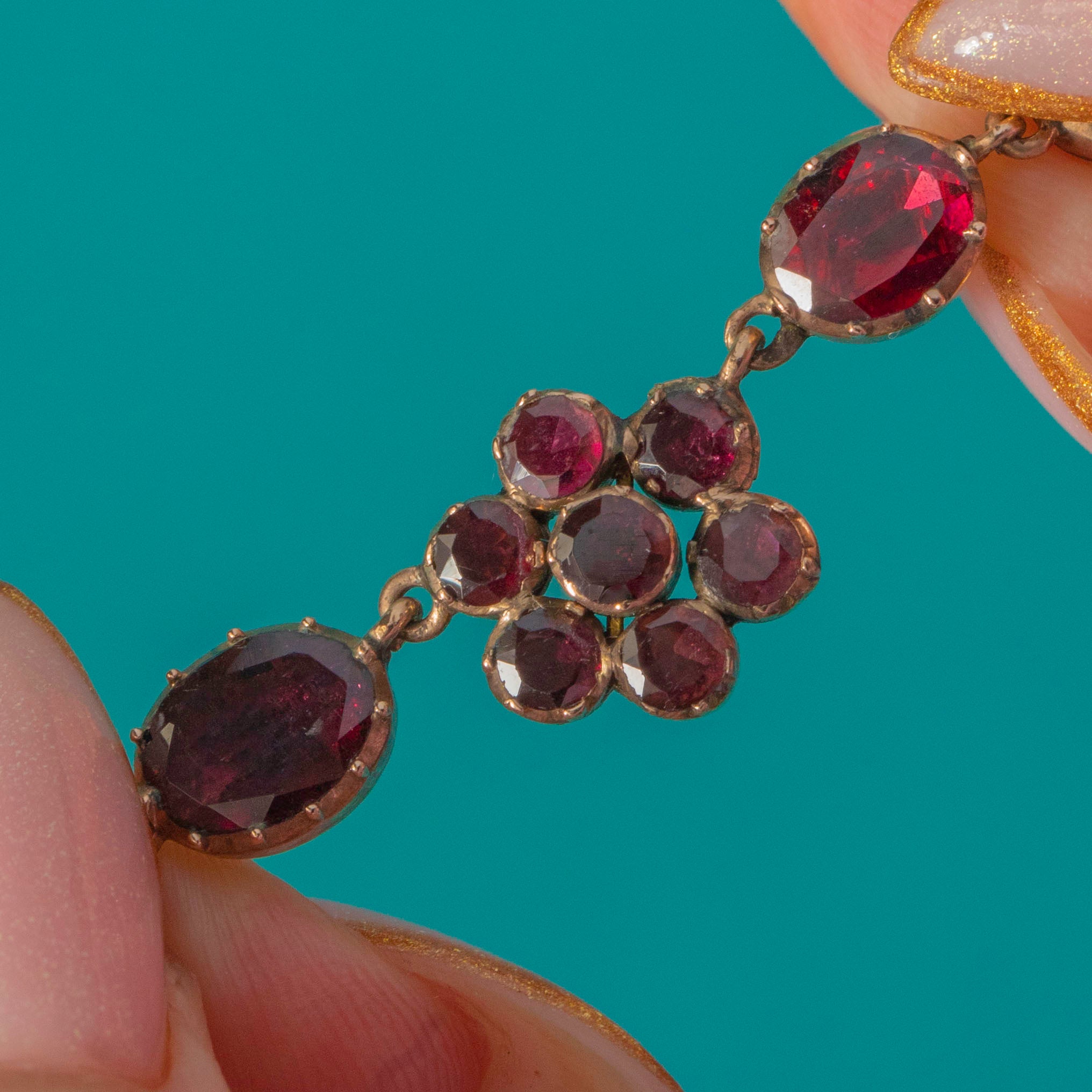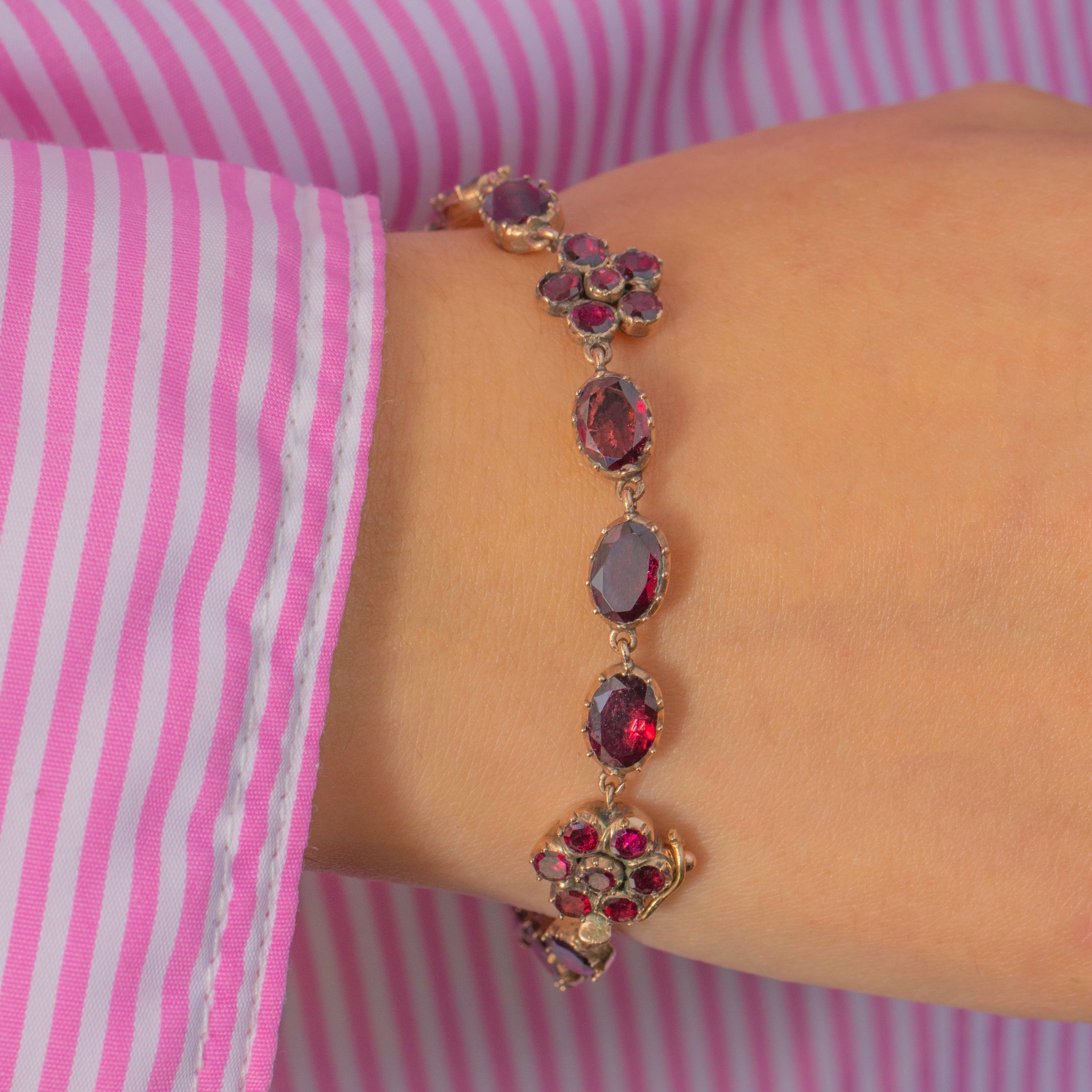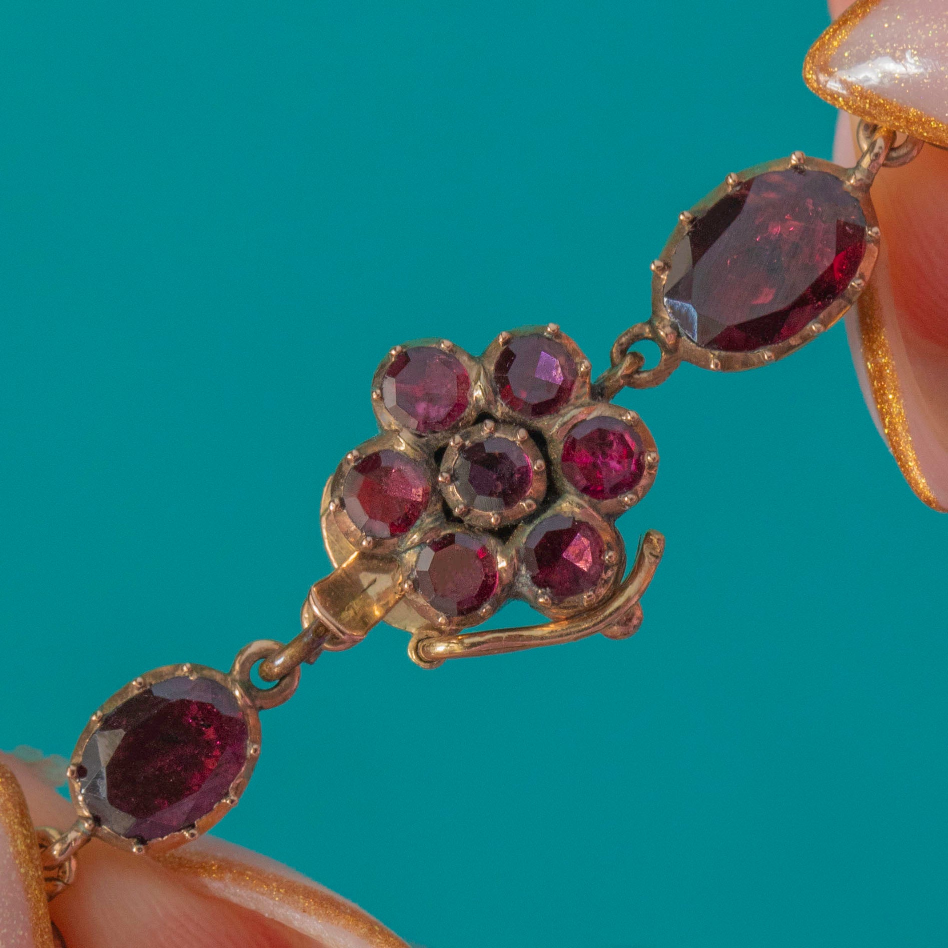 VERY GOOD: This Georgian bracelet is in lovely antique condition with secure connections between each link and luminous foiled Garnets. The gemstones vary slightly in colour but complement one another beautifully. There are a few tiny dings and surface imperfections to the reverse of the closed-back settings, as expected for a piece of this age, but overall it remains in excellent structural and visual condition. The original clasp and safety feature function perfectly.