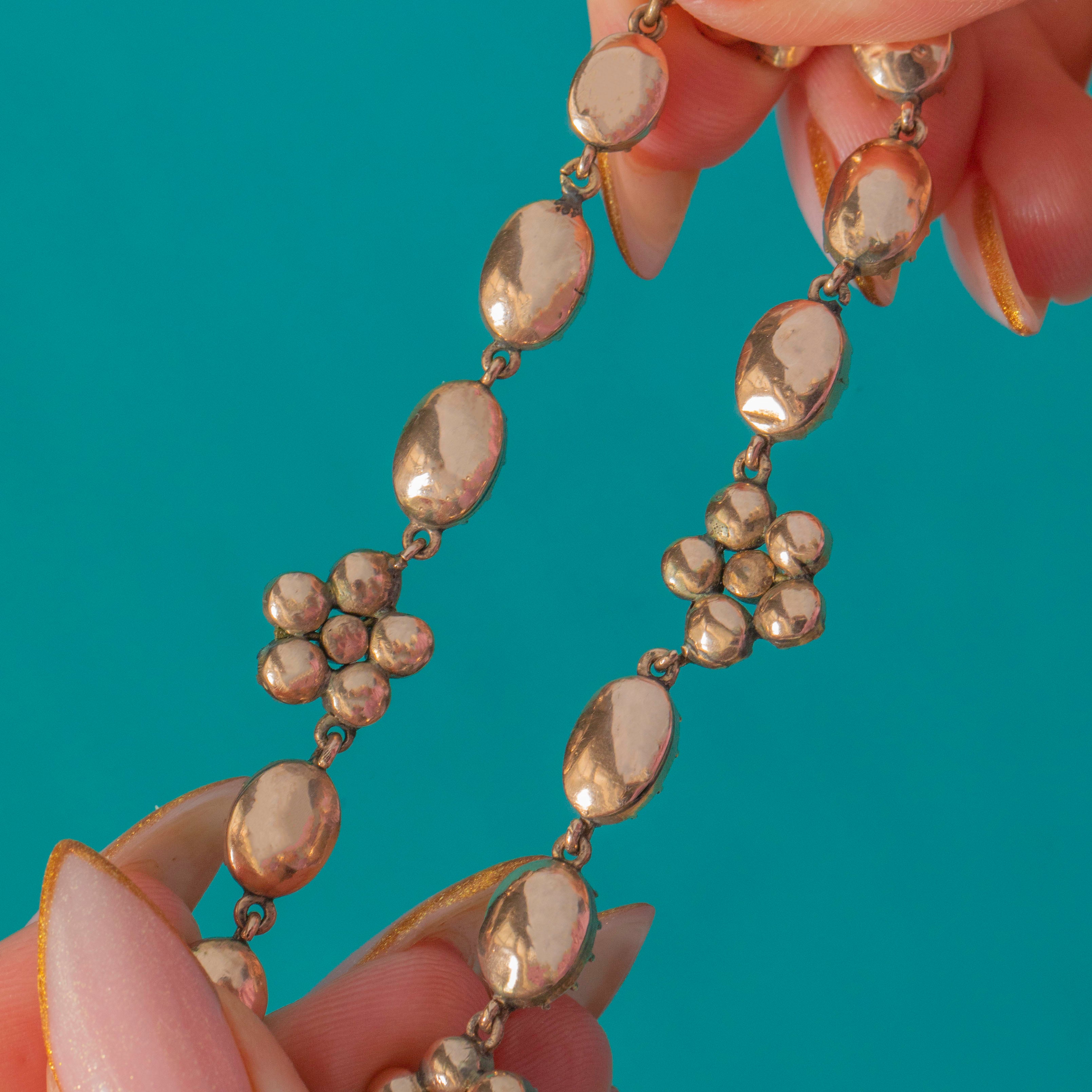 The design culminates in a charming flower-shaped clasp with a safety feature, adding both beauty and practicality. A true collector’s piece, radiating warmth, craftsmanship, and Georgian grace.