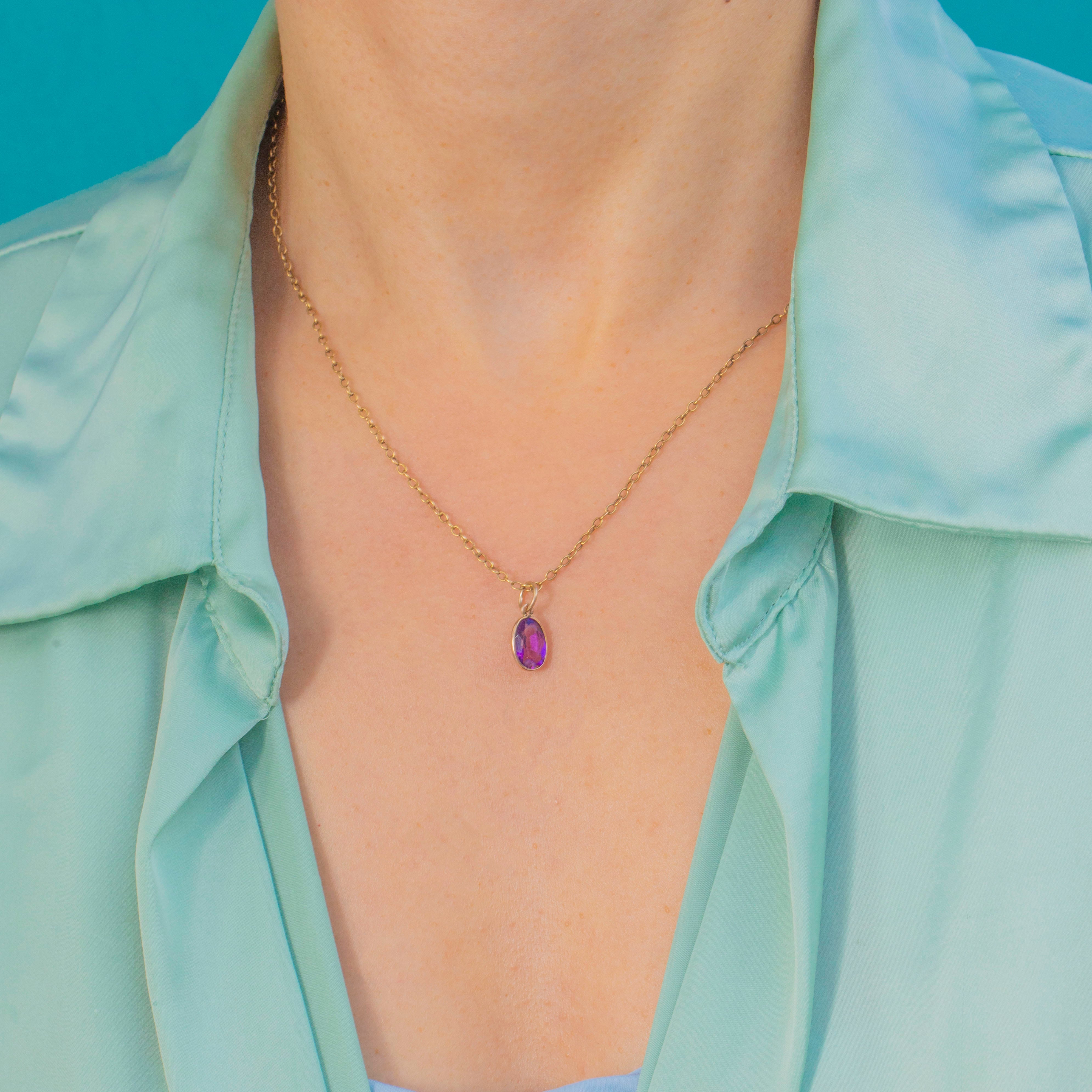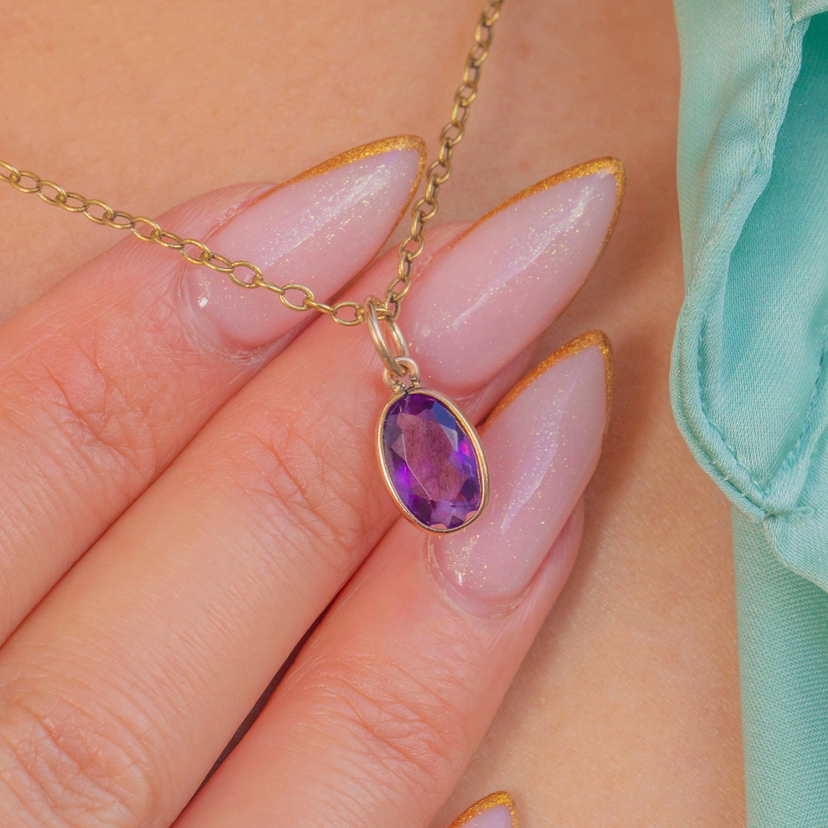 This sleek 9ct Gold charm showcases a lush oval Amethyst in a minimalist bezel, letting that vivid purple glow take centre stage. The stone has gorgeous internal flashes and a rich colour that looks beautiful worn alone or layered with your favourite pendants.