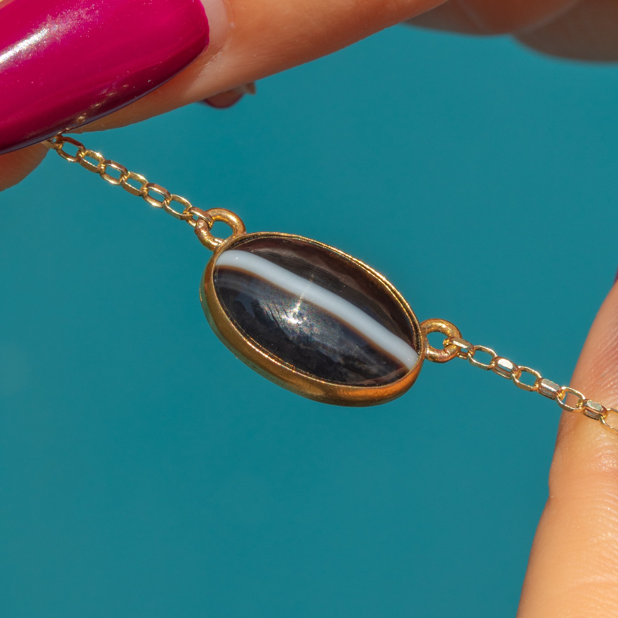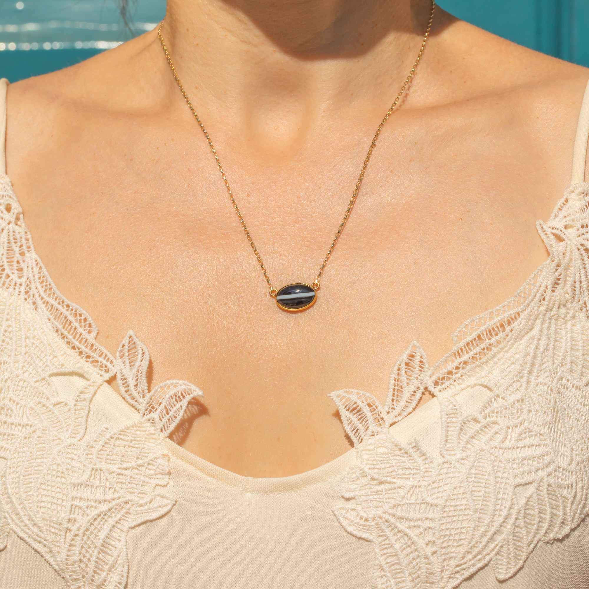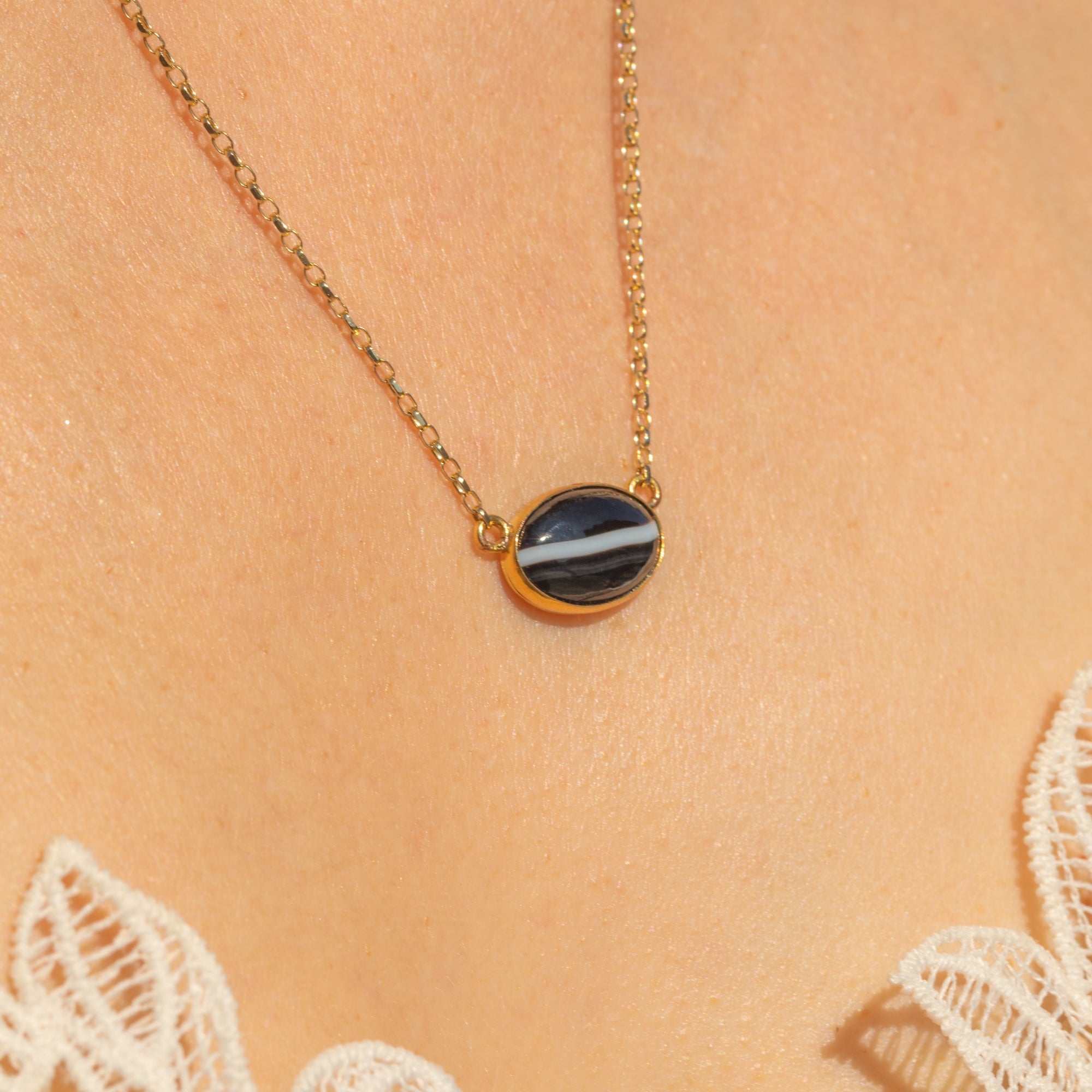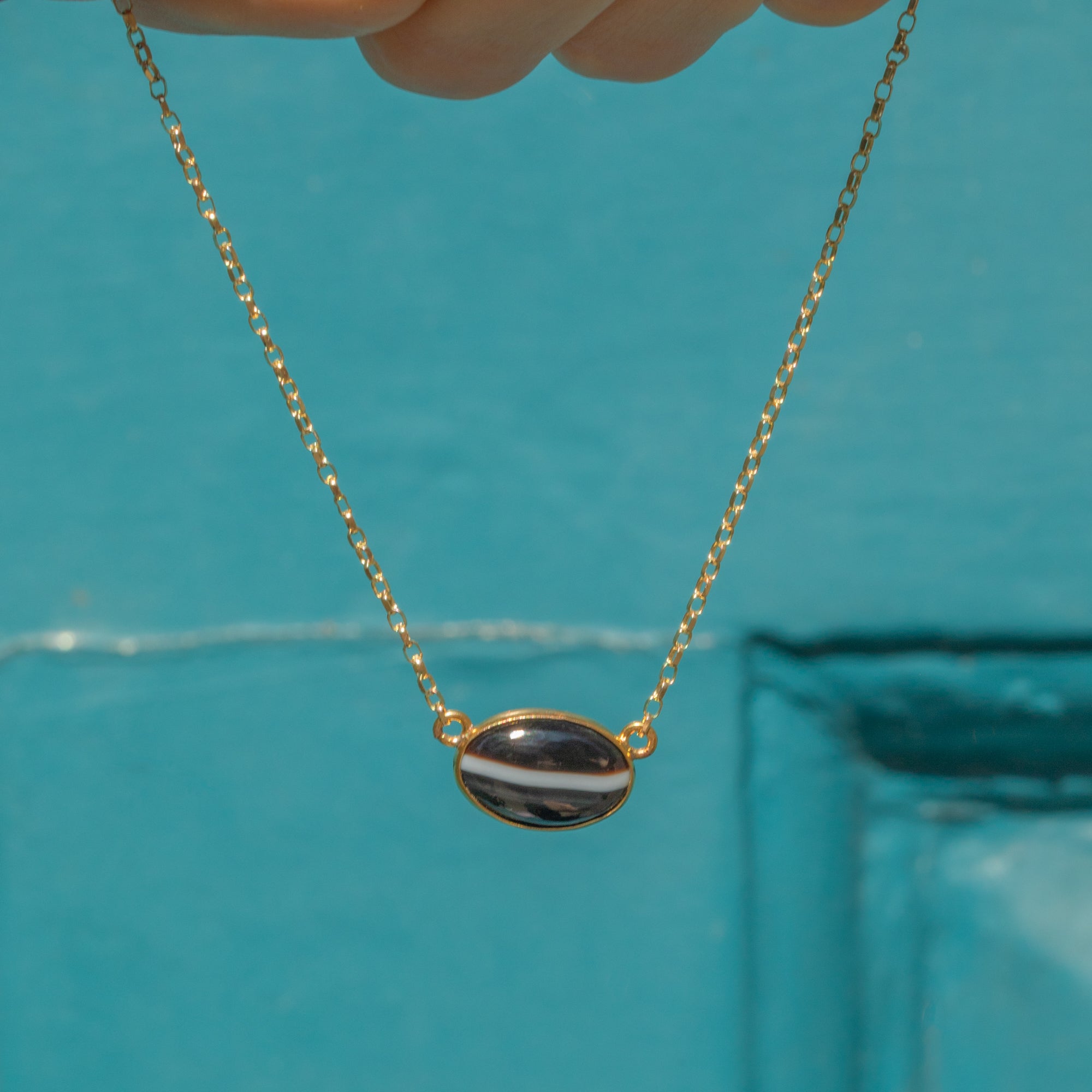 This bright and glossy 9ct Gold necklace suspends a striking Banded Agate cabochon, its earthy tones decorated beautifully by its distinctive white banding for which the gemstone is so revered.