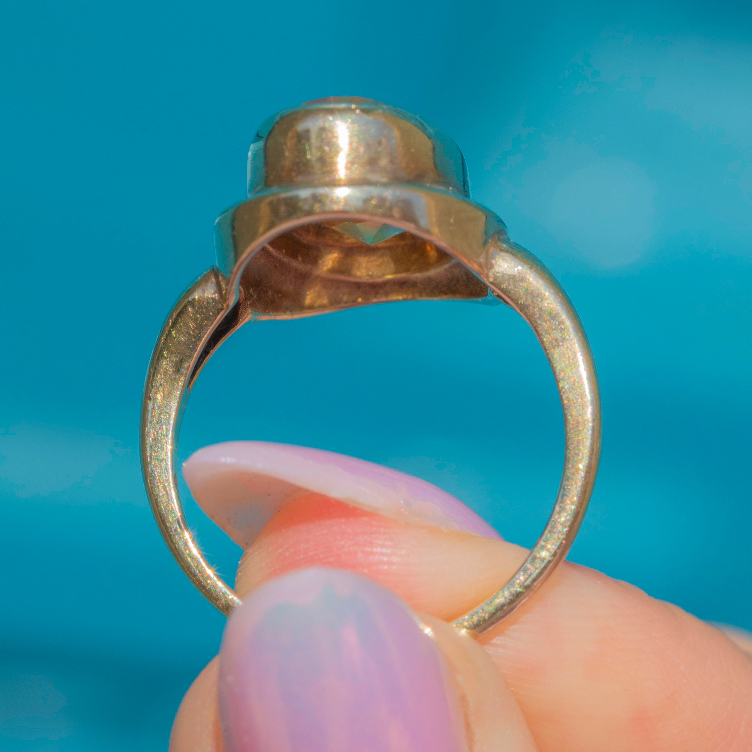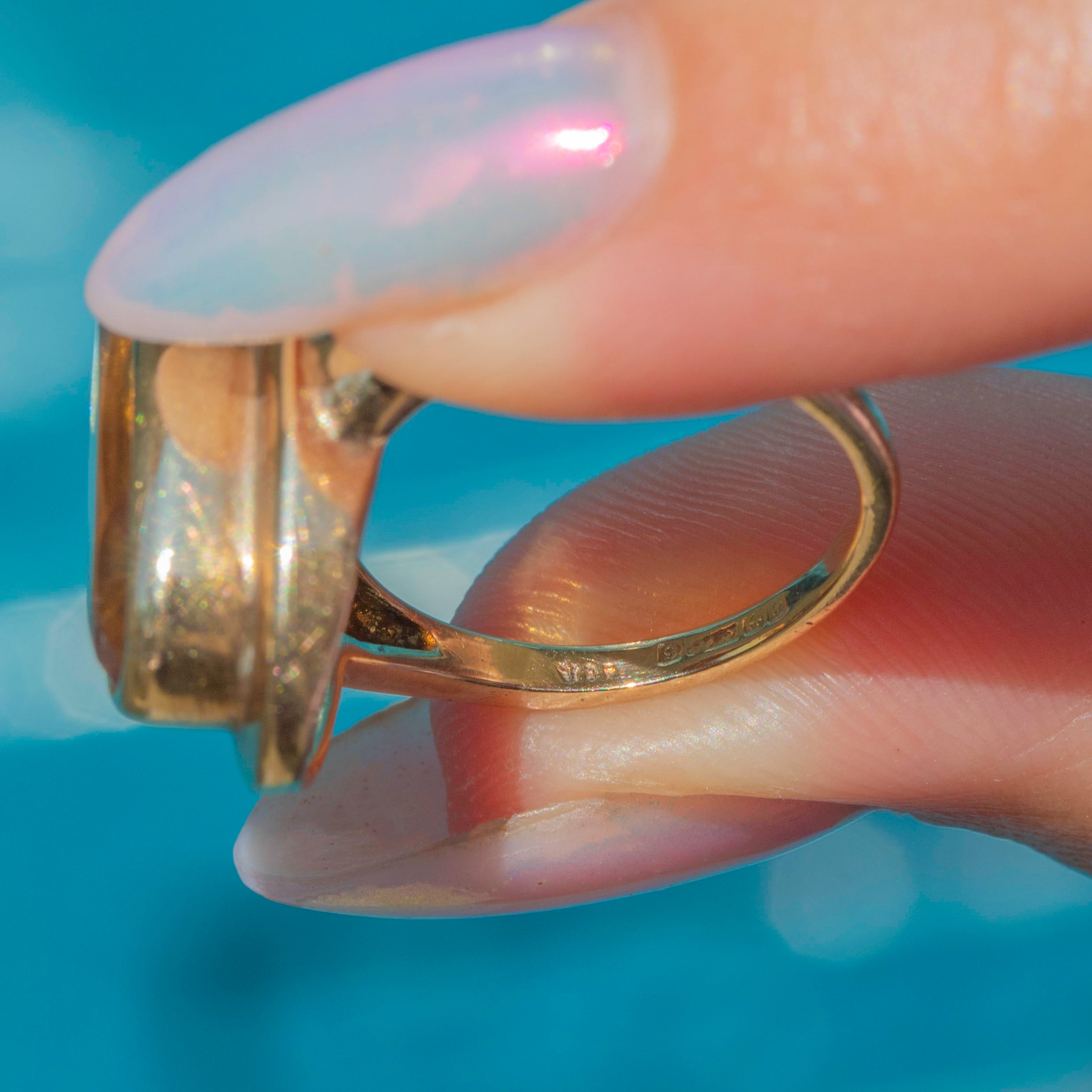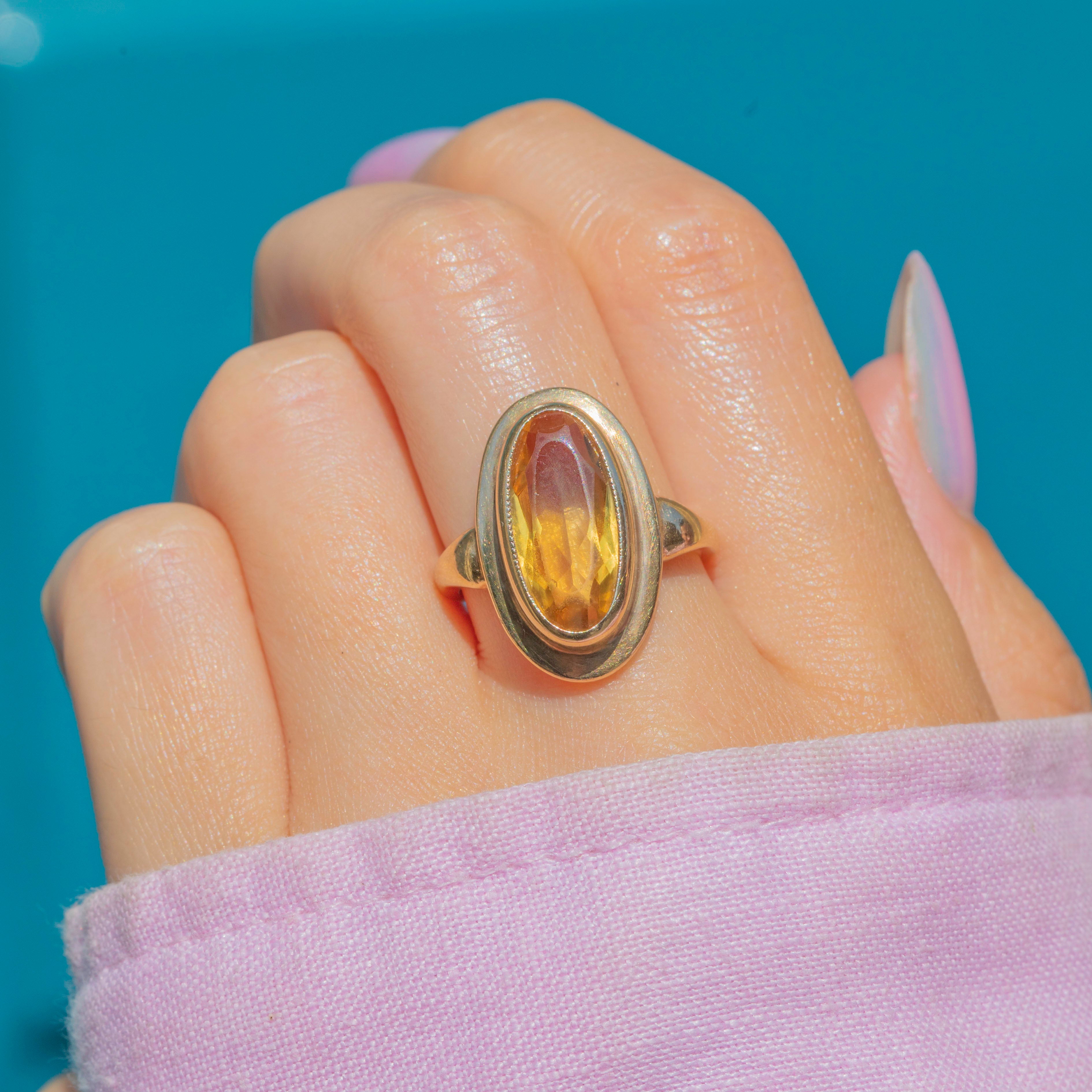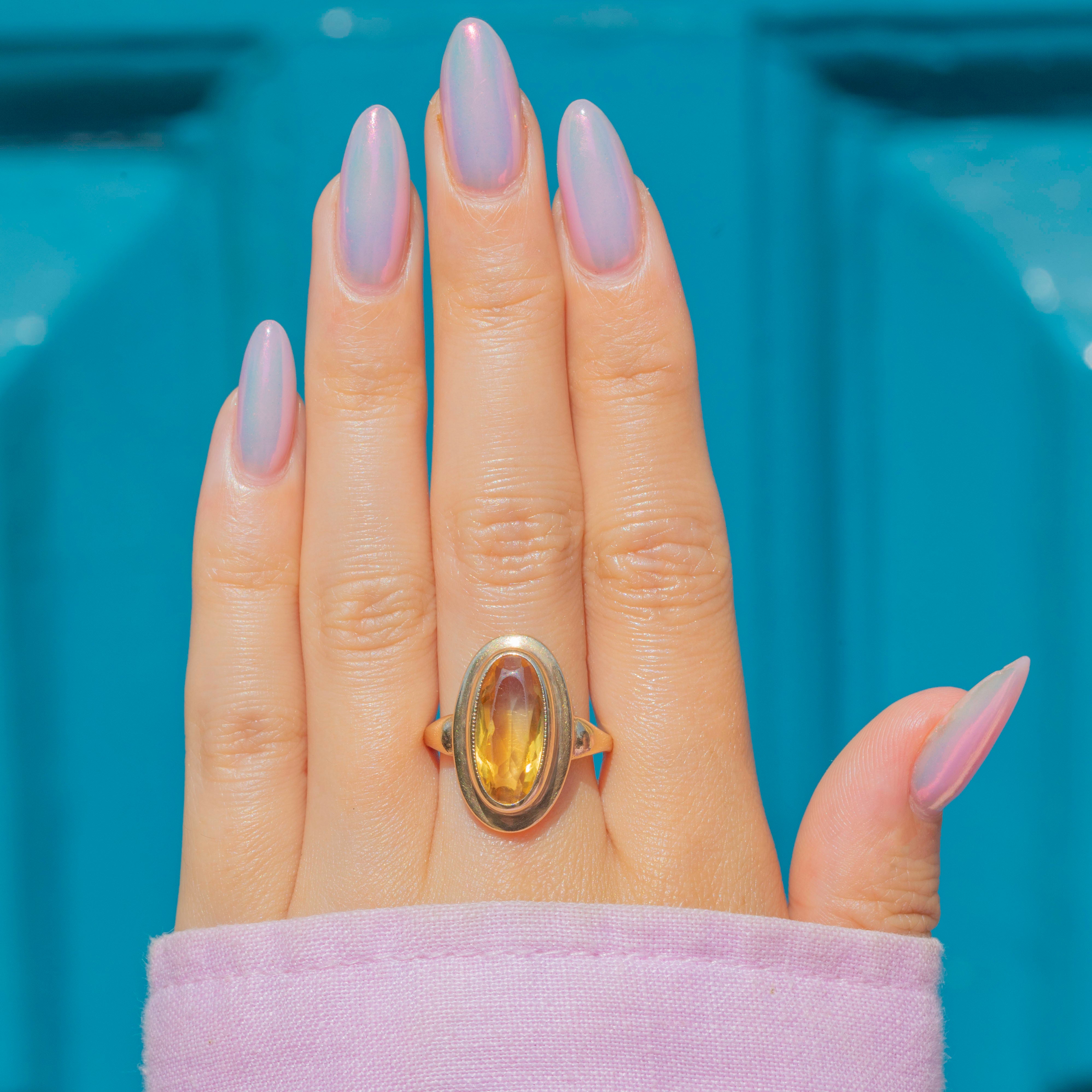 This ring is a striking vintage piece, centred by an oval faceted 1.85ct Citrine, pouring honey nectar hues from her intricate facets. The Citrine is hugged by a glossy bezel and set upon a sturdy band, allowing you to wear this chunky delight comfortably.