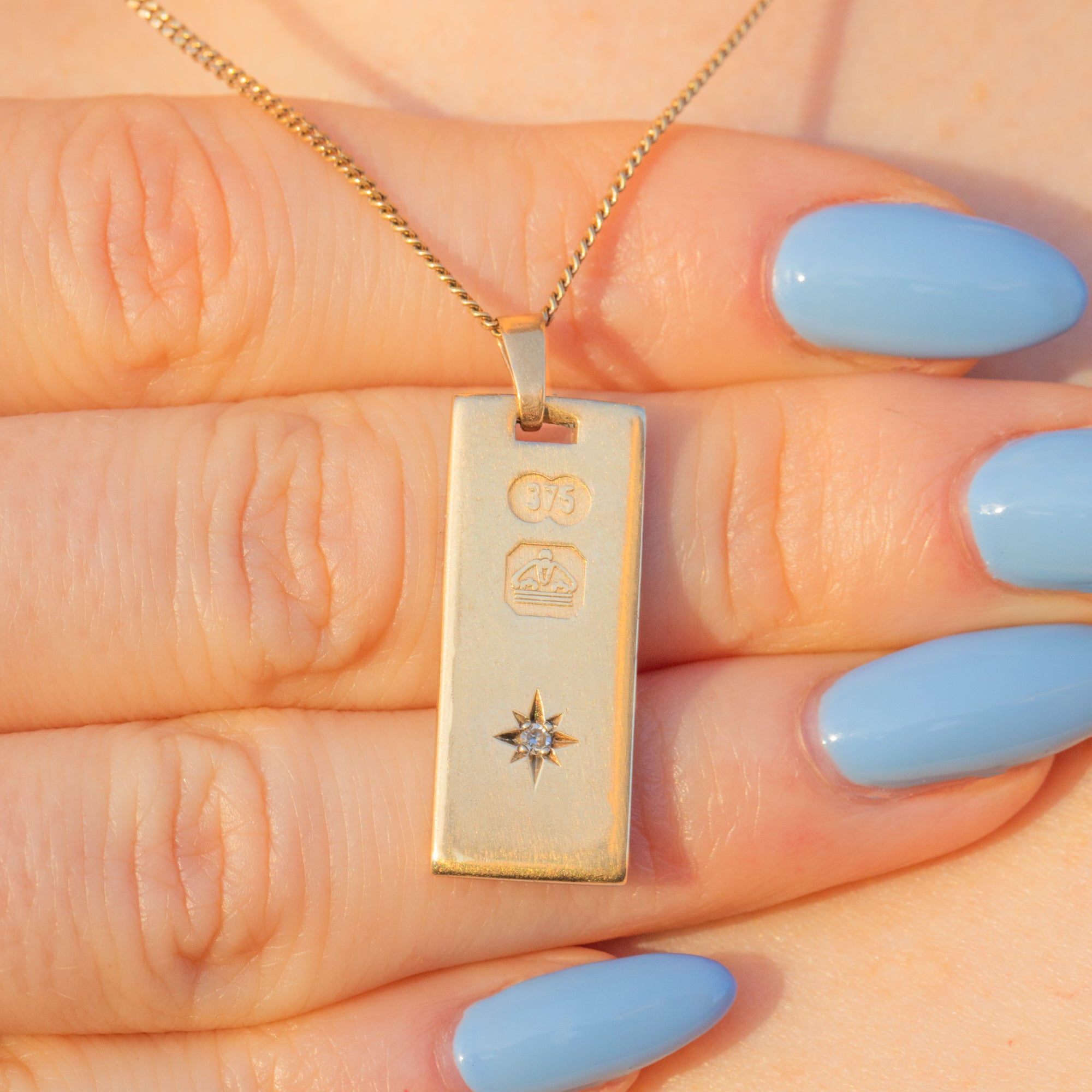 Add a touch of celestial charm to your collection with this 9ct Gold Diamond star-set ignot pendant!