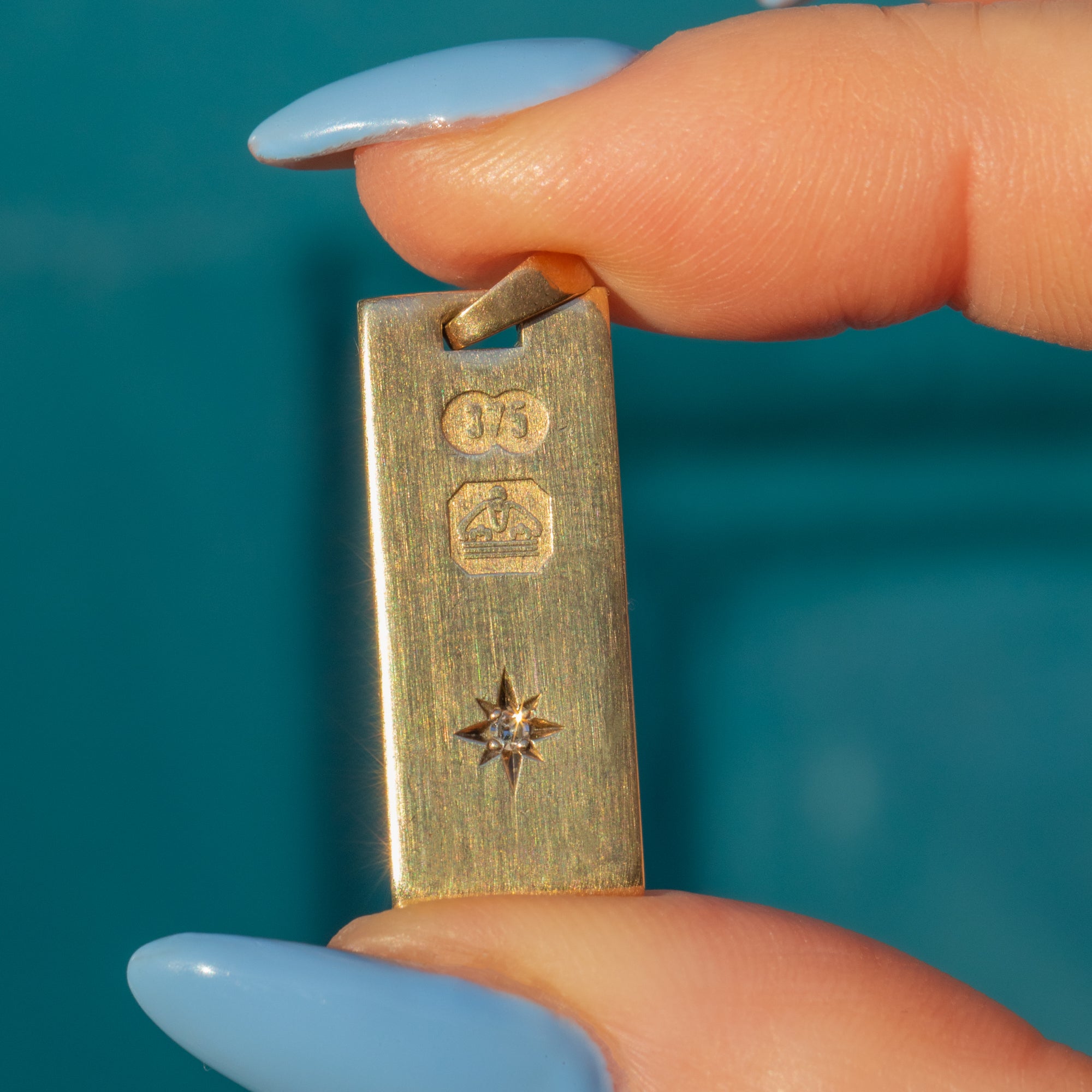 EXCELLENT. This 9ct Gold Diamond-set ingot pendant is in excellent condition. Her Diamond is securely set within her star setting, providing a sparkling accent. The Gold is bright and buttery and the chunky vintage stamps have remained defined. This celestial Diamond star set pendant will rest delicately from a fine chain and make a great versatile addition to your collection.