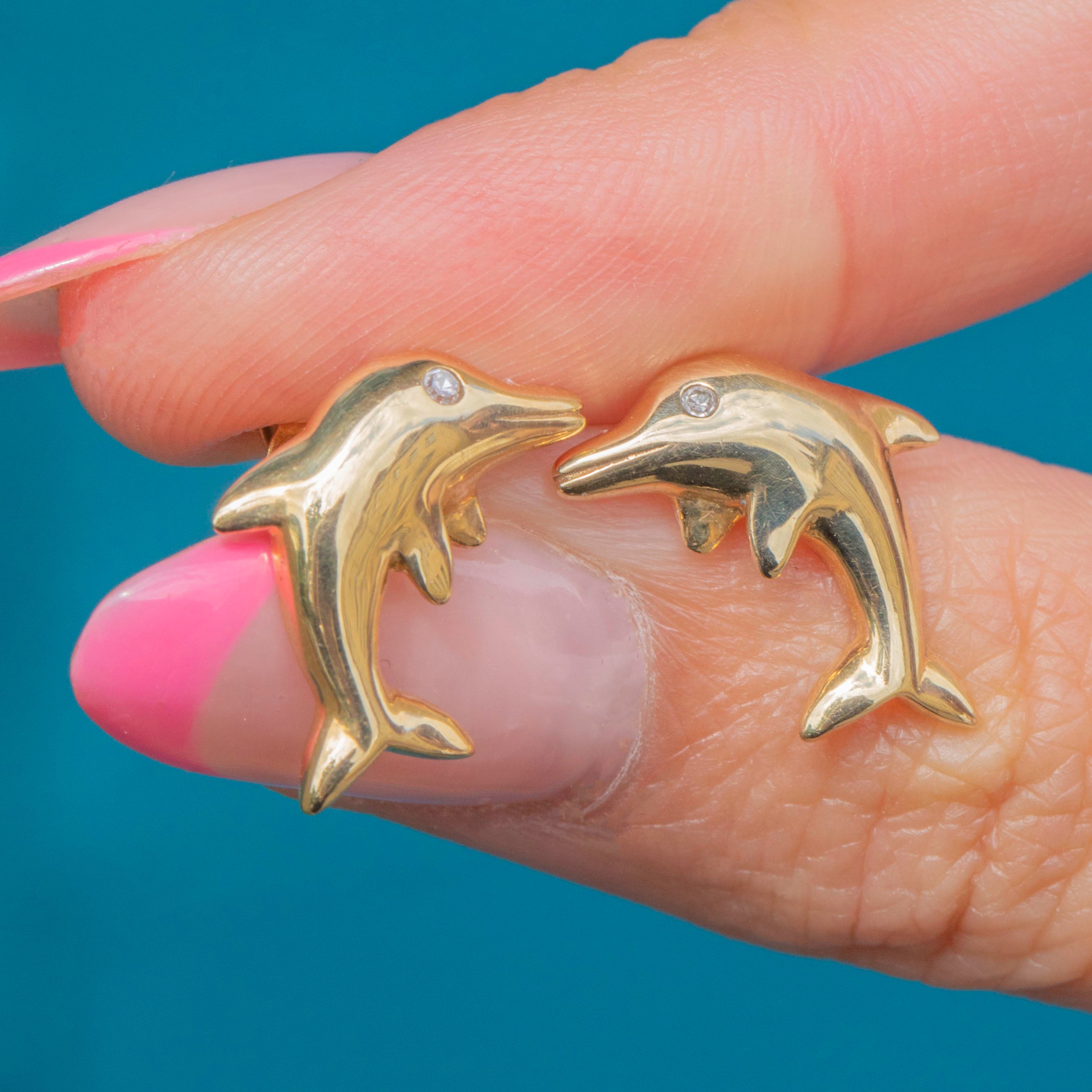 VERY GOOD-EXCELLENT: These 9ct Gold and Diamond dolphin earrings are in great condition. Each earring has been crafted wonderfully, with a lovely glossy sheen. There are some minor dings to the Gold, though this is difficult to spot without a loupe. With her Diamonds securely set, these vintage studs are a must-have!