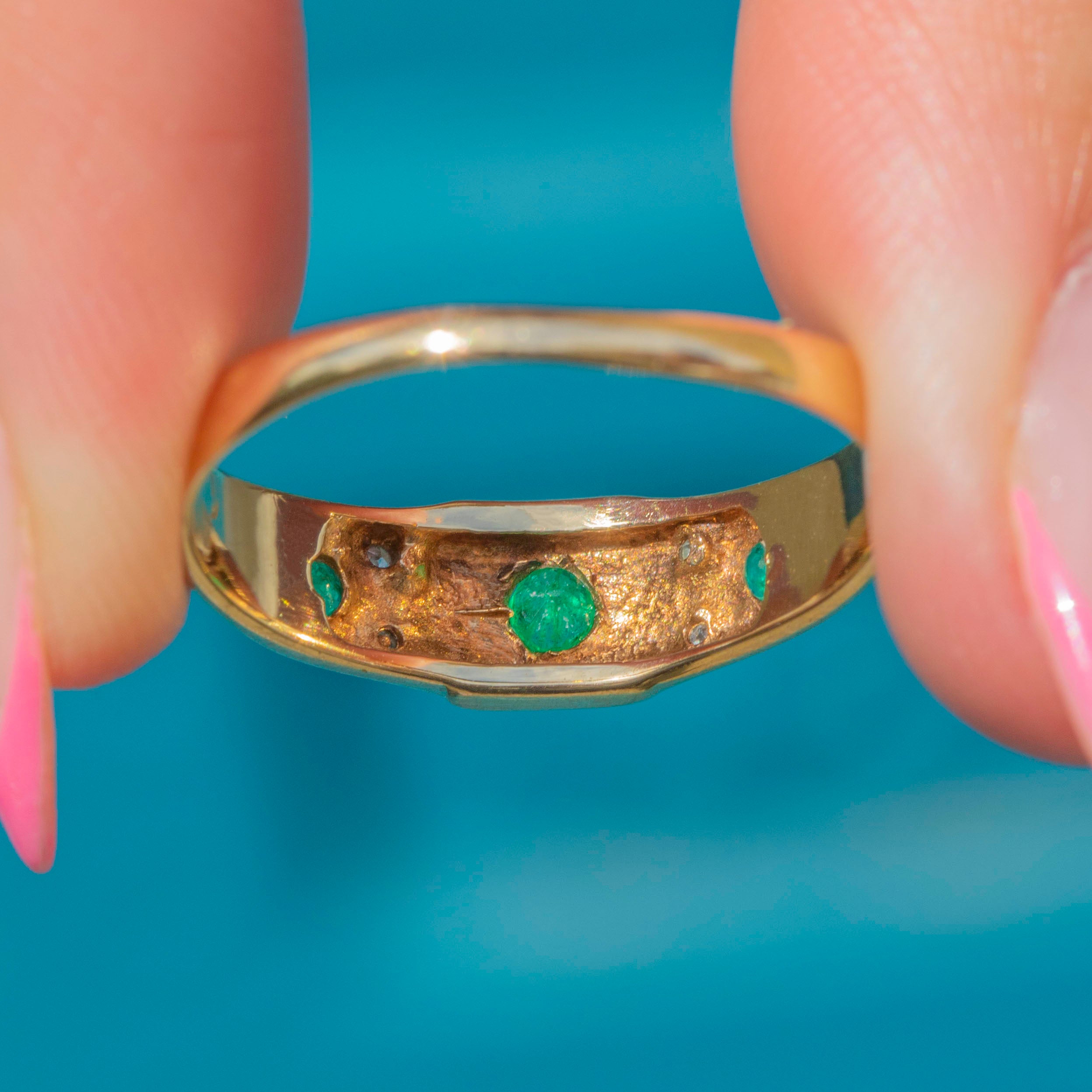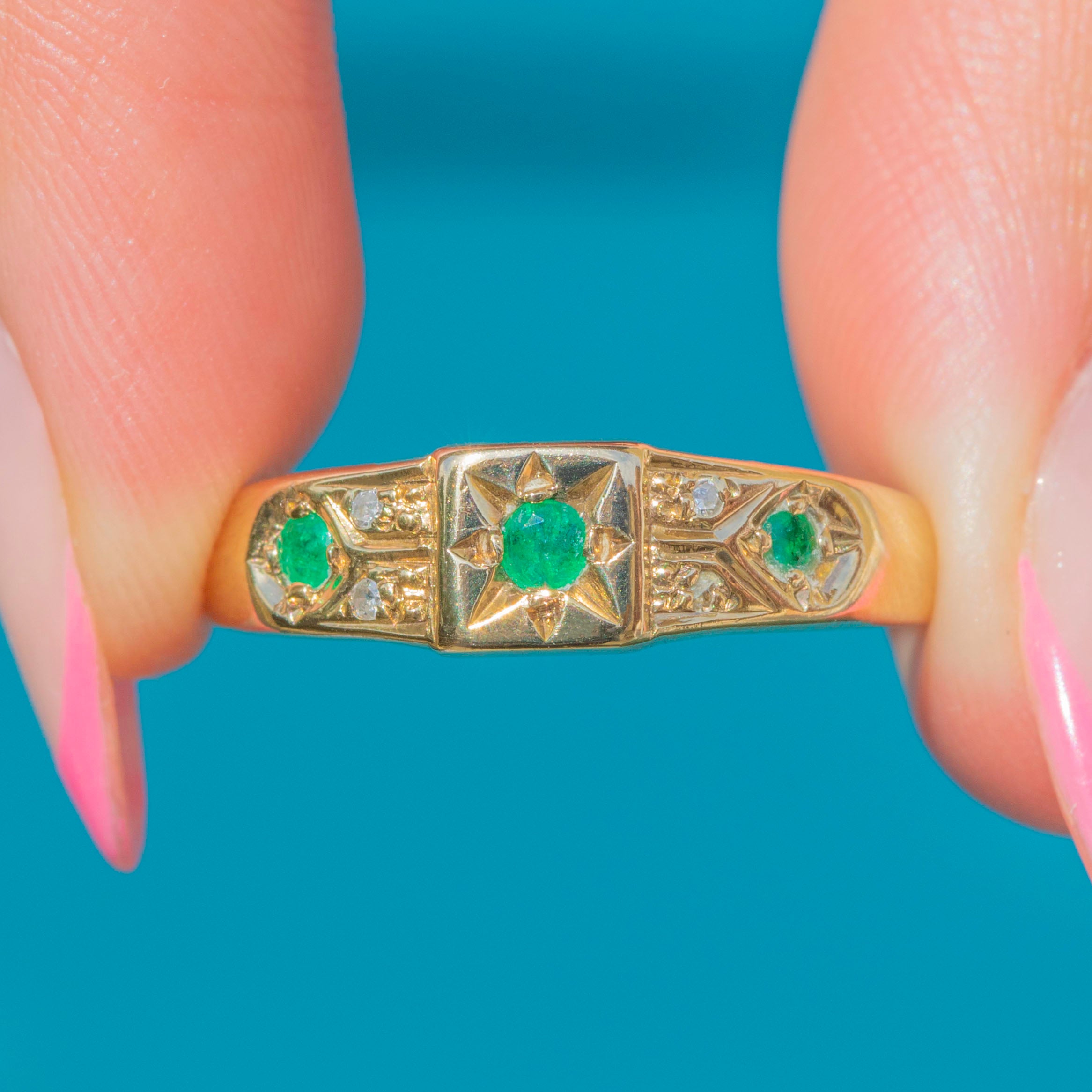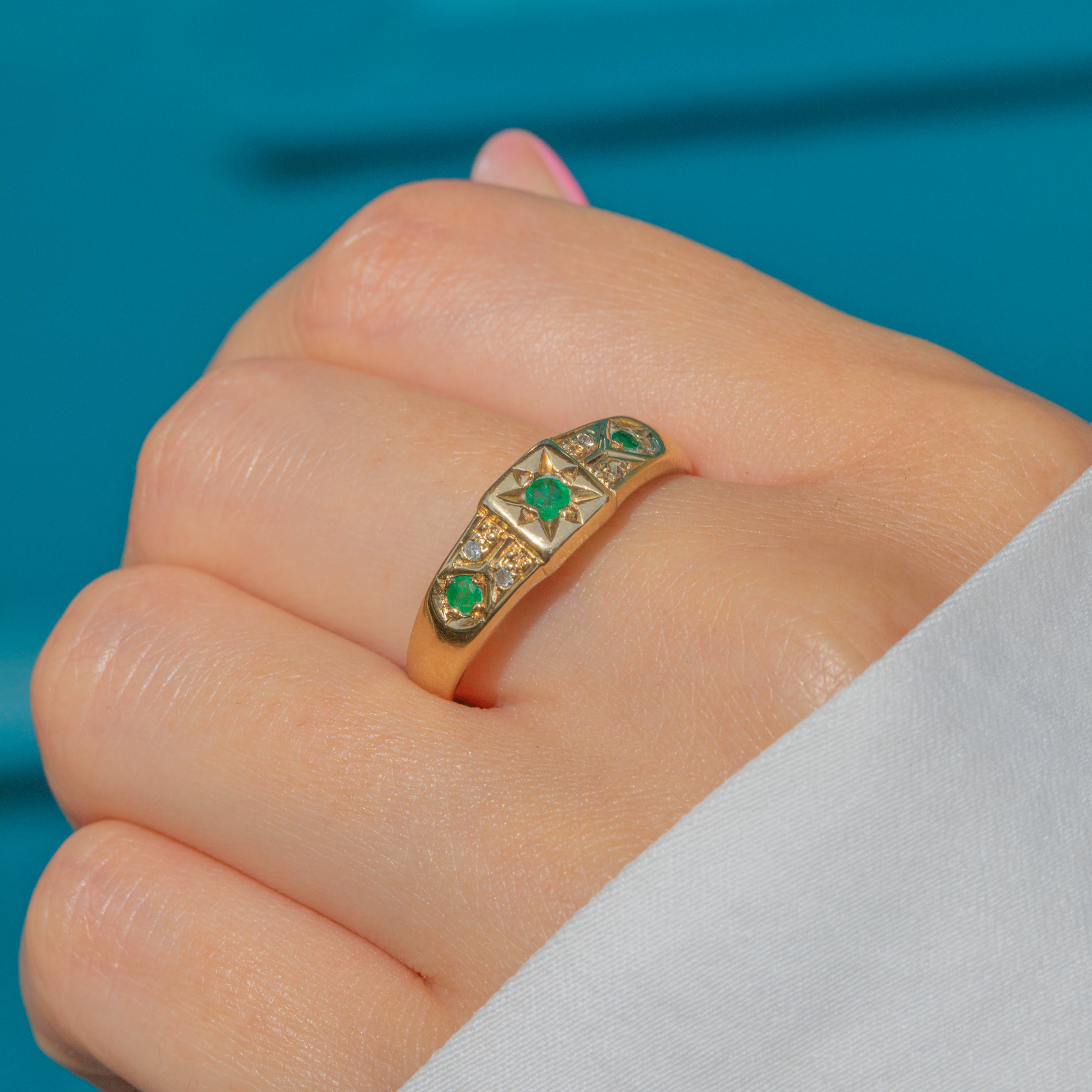 This vintage gypsy ring is crafted from glossy 9ct Gold and inlaid with three vibrant Emeralds, each displayed within charming star settings. They are flanked by four scintillating Diamonds, adding a gorgeous twinkle and ensuring this ring impresses from every angle!