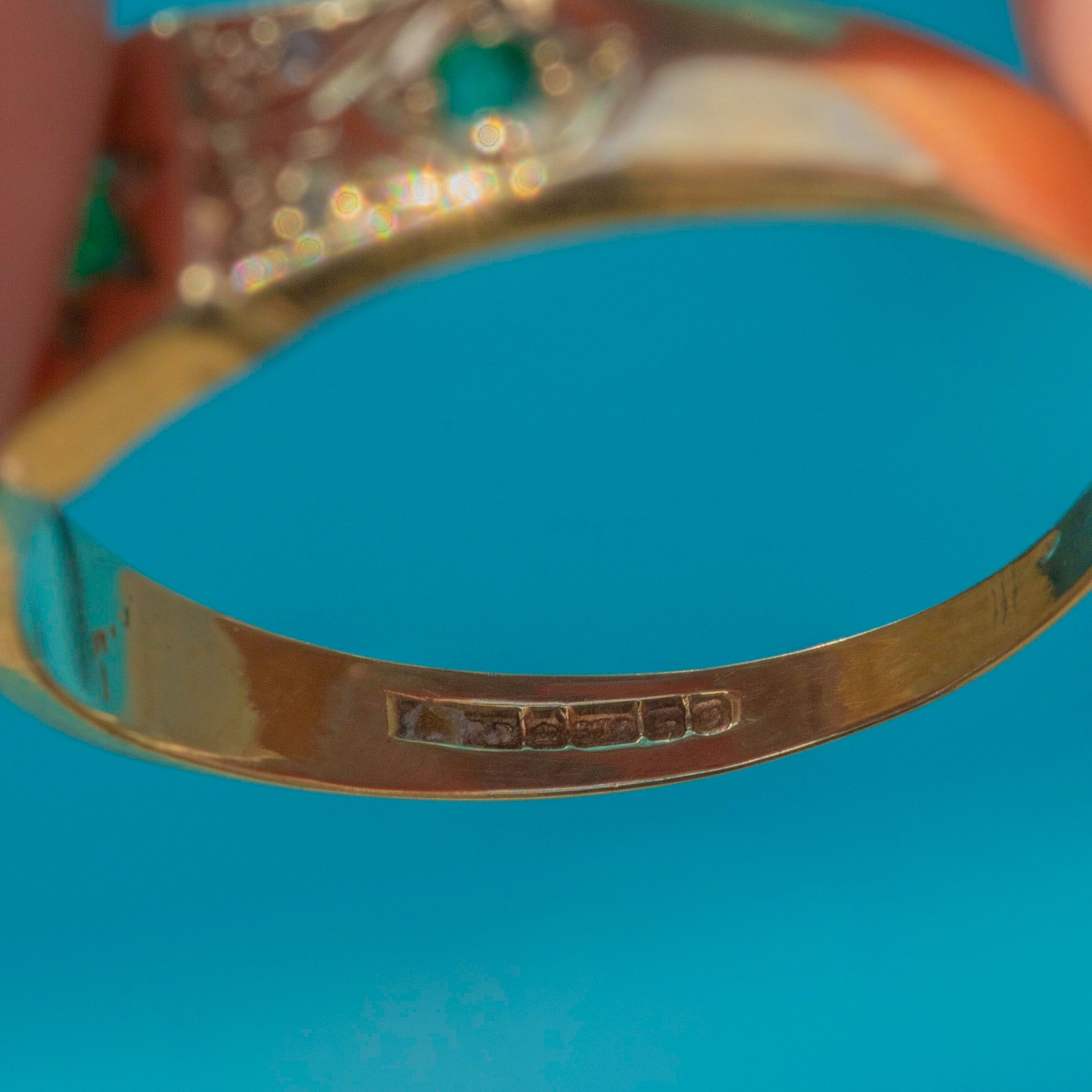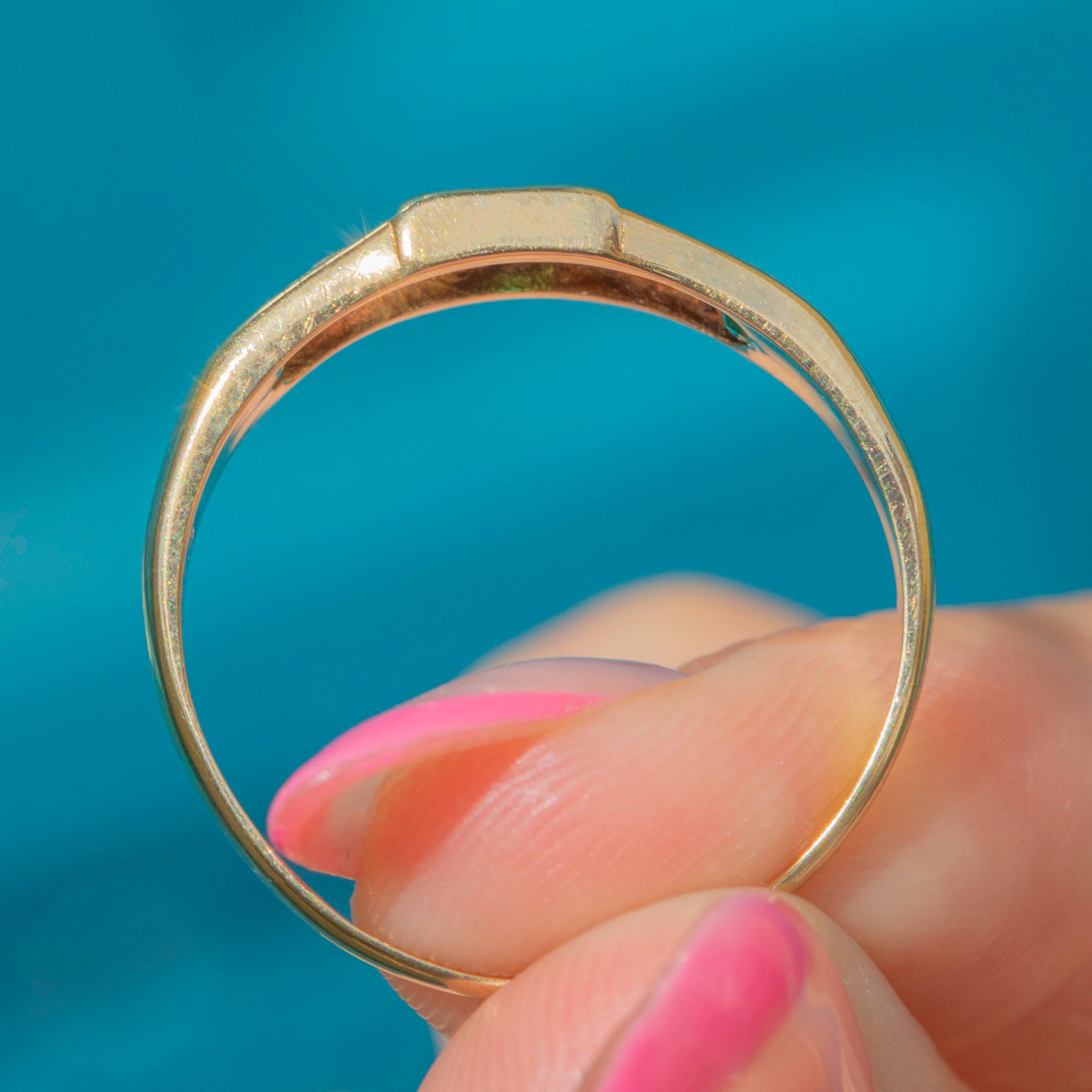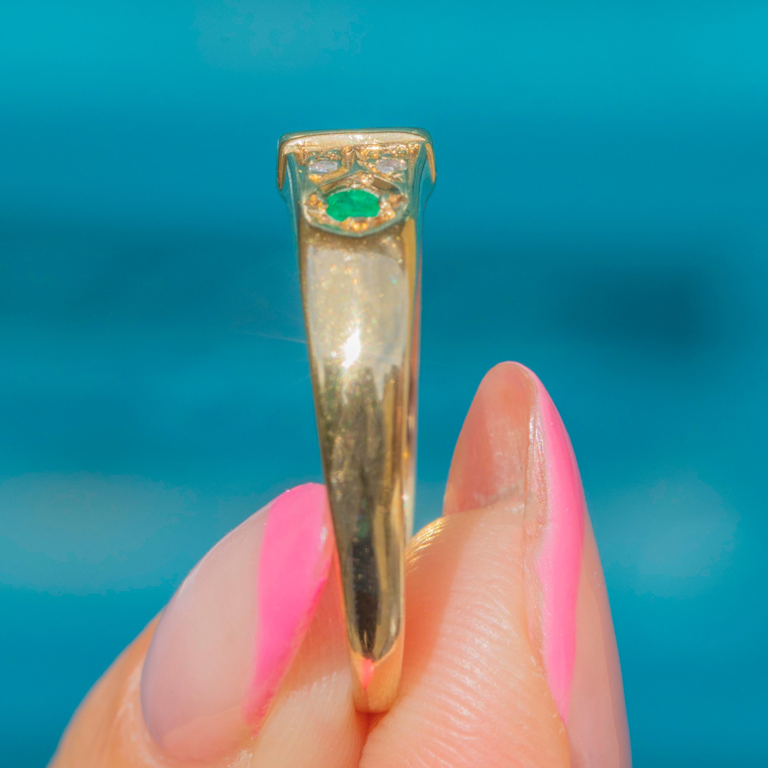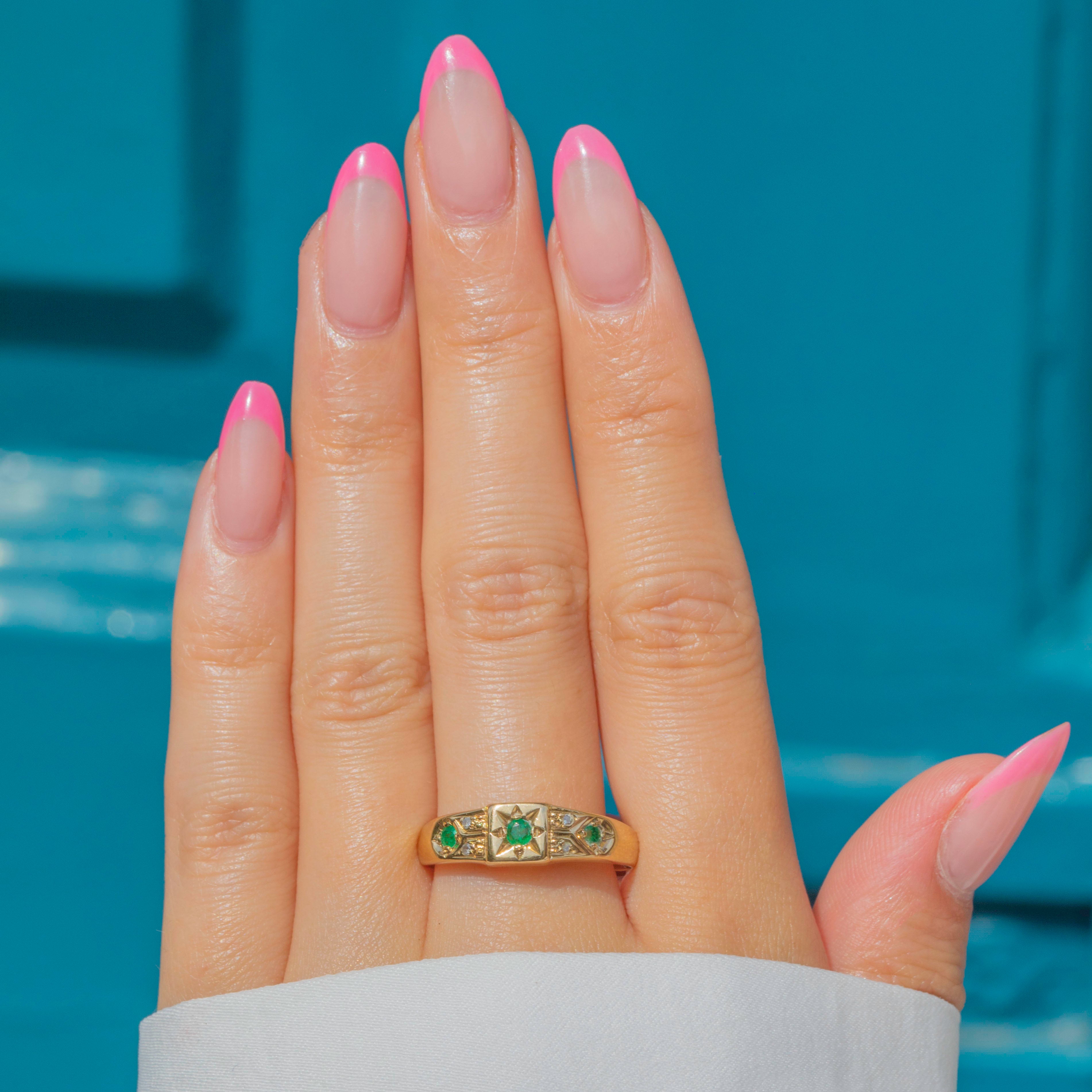 This vintage gypsy ring is crafted from glossy 9ct Gold and inlaid with three vibrant Emeralds, each displayed within charming star settings. They are flanked by four scintillating Diamonds, adding a gorgeous twinkle and ensuring this ring impresses from every angle!
