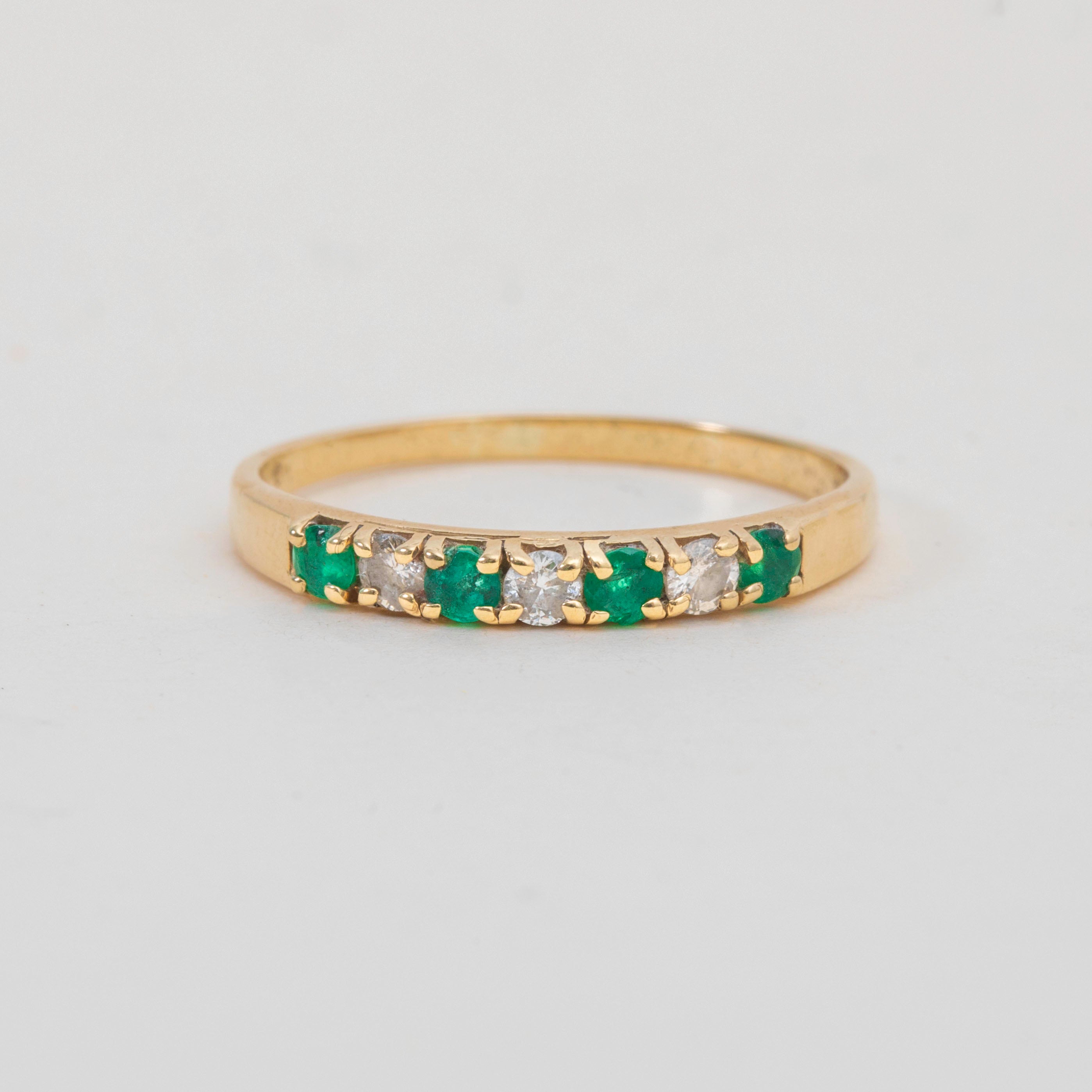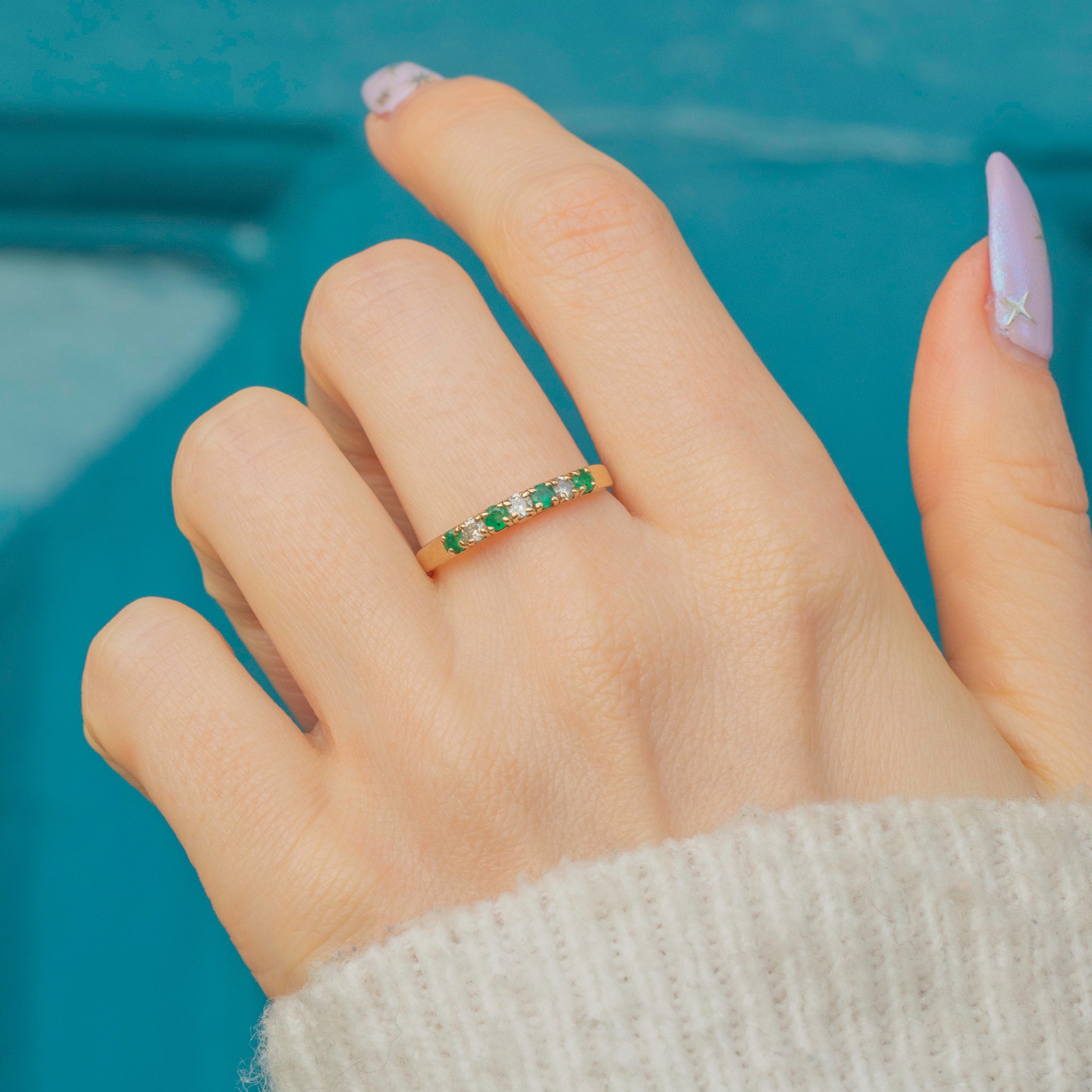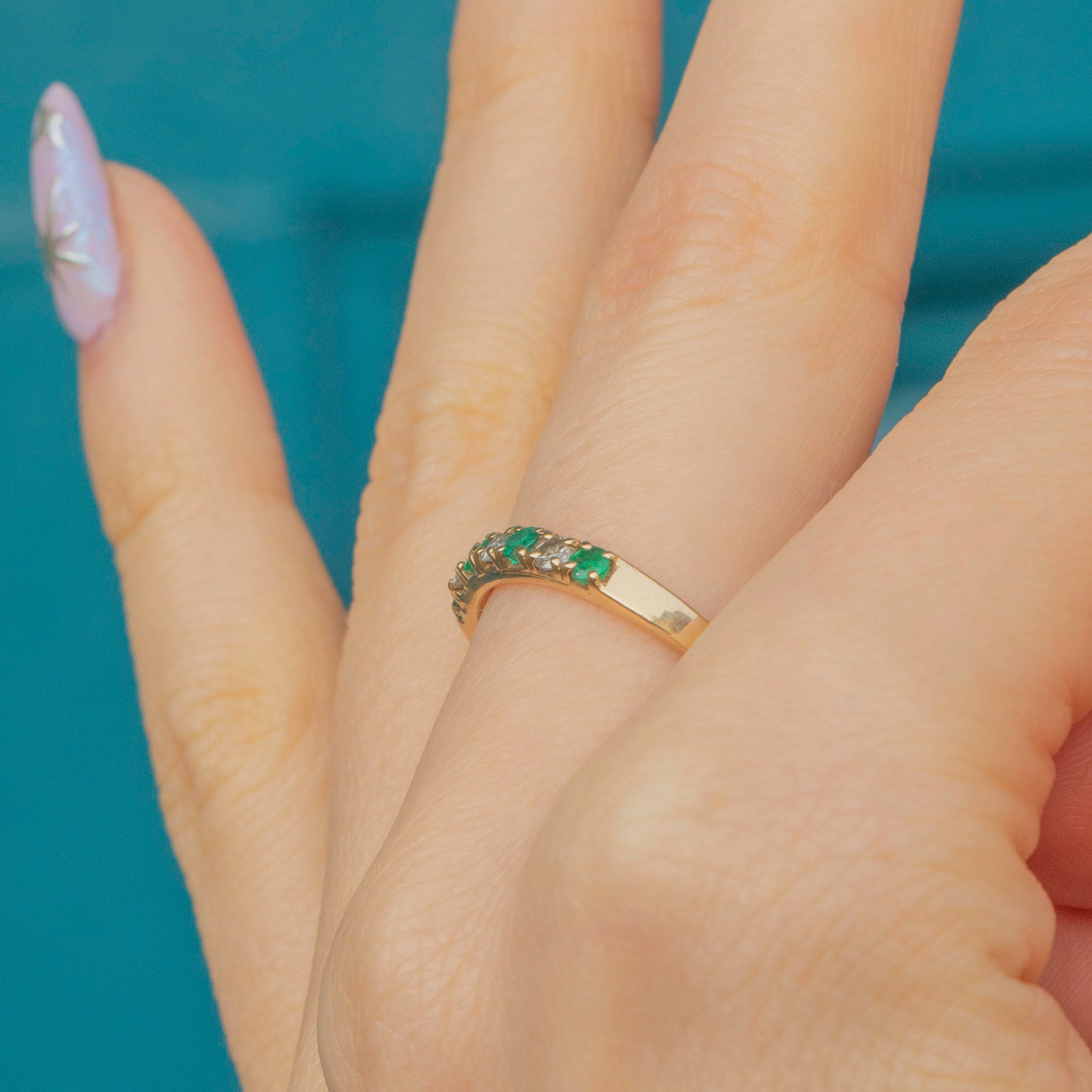 VERY GOOD-EXCELLENT. This 9ct Gold Emerald Diamond half eternity ring is in fabulous condition, with all gemstones securely set. There is some wear, particularly to one of the Emeralds and one of the other Emeralds has a few natural inclusions - however, this is only noticeable under the inspection of a loupe. The hallmarks remain clear, and the gold band has a smooth finish with minimal surface wear.