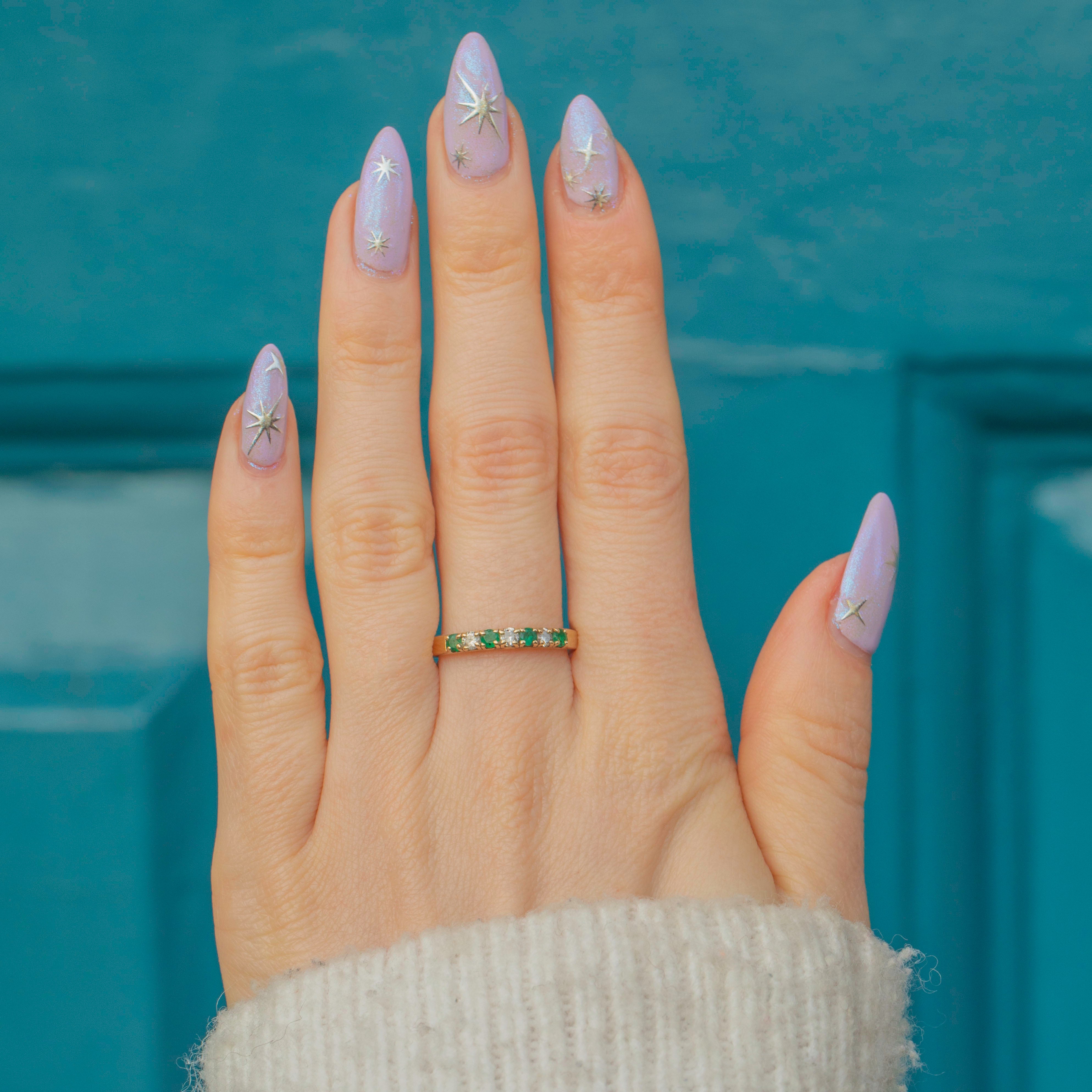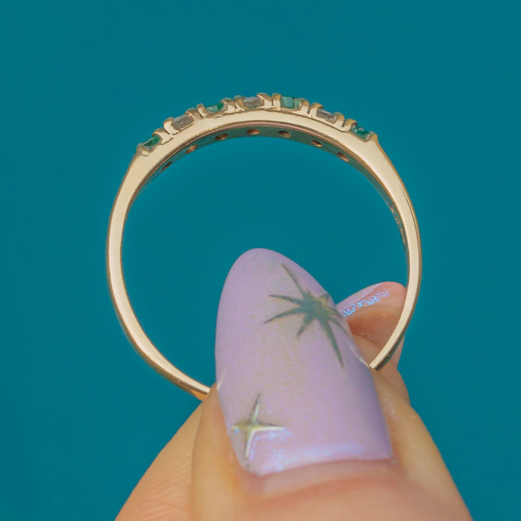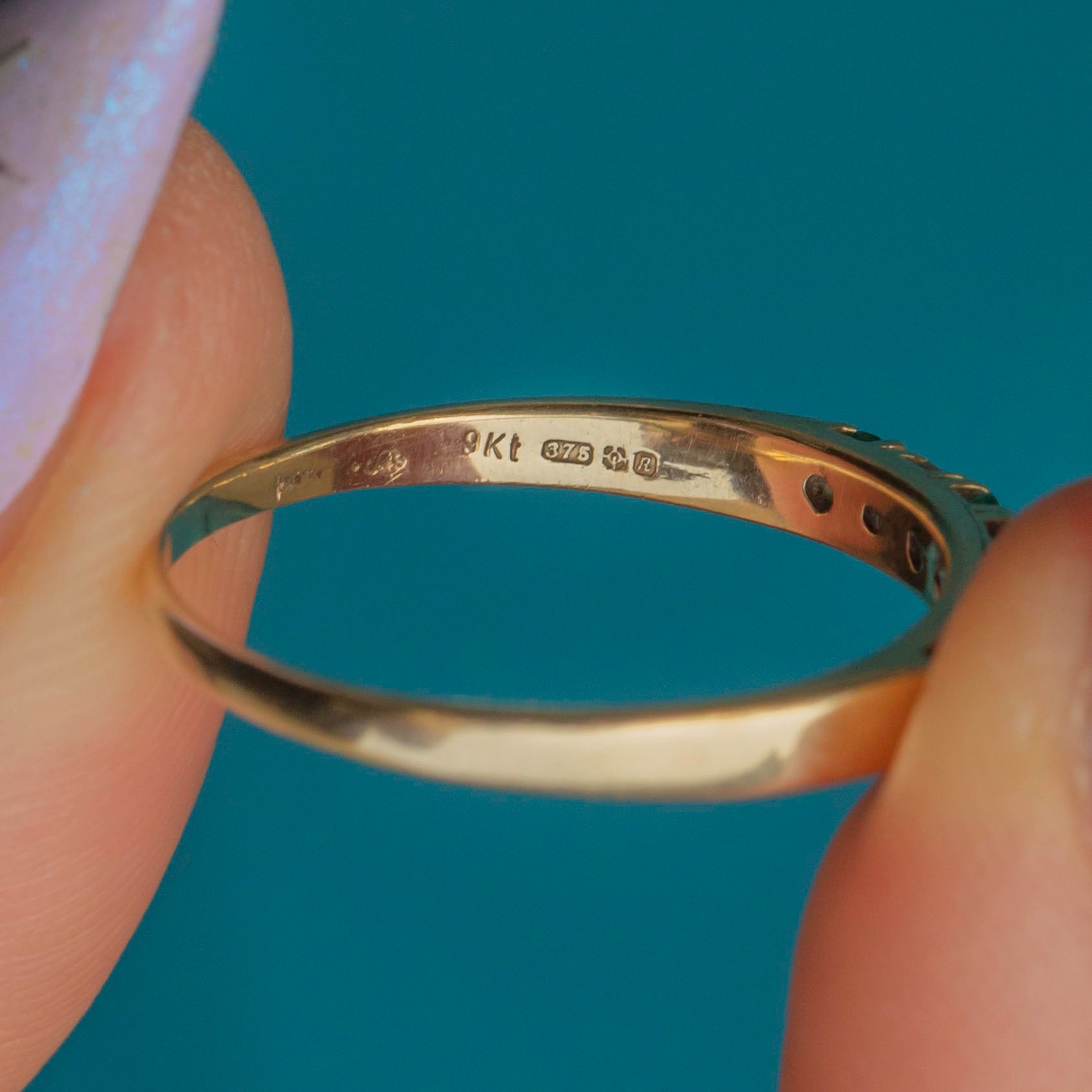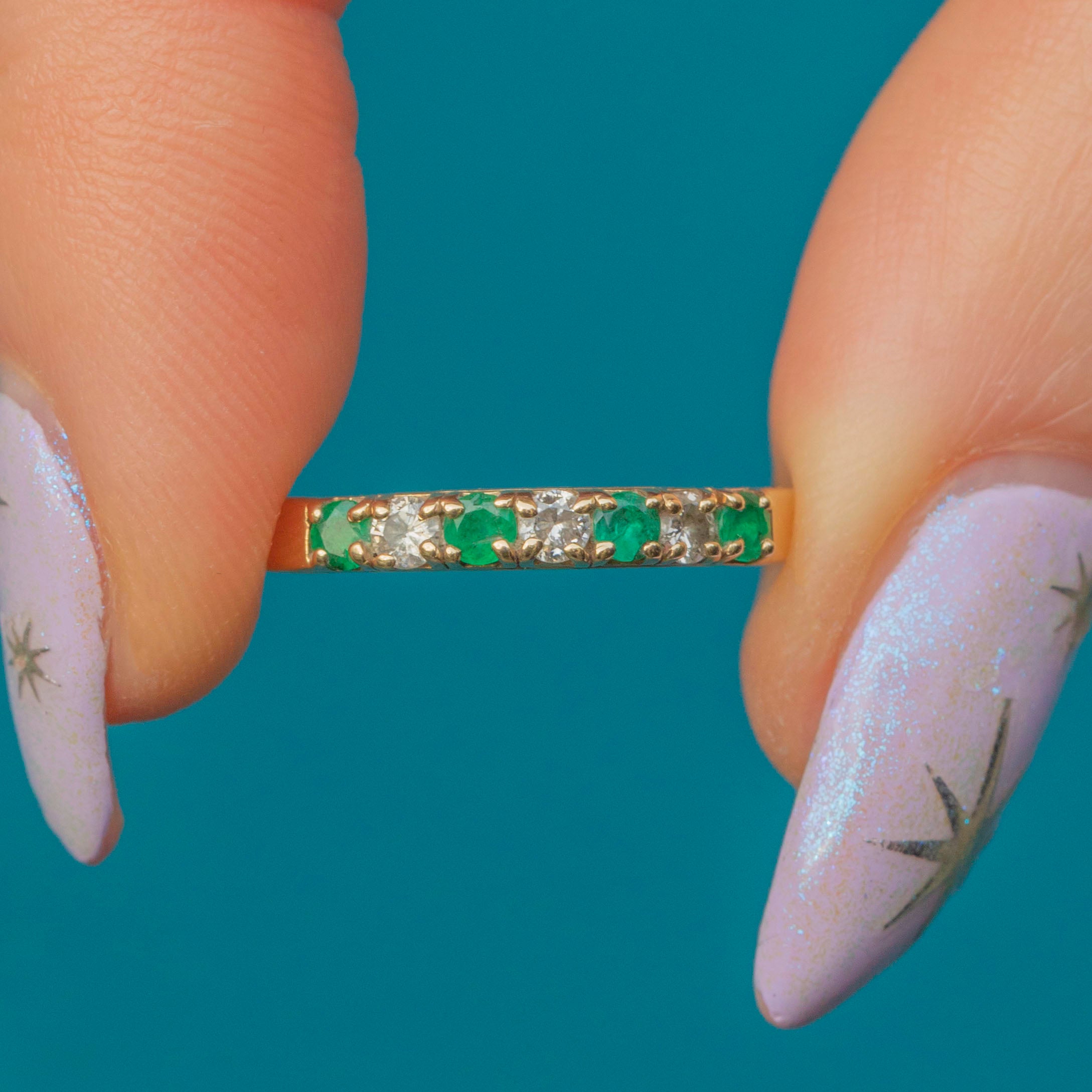 VERY GOOD-EXCELLENT. This 9ct Gold Emerald Diamond half eternity ring is in fabulous condition, with all gemstones securely set. There is some wear, particularly to one of the Emeralds and one of the other Emeralds has a few natural inclusions - however, this is only noticeable under the inspection of a loupe. The hallmarks remain clear, and the gold band has a smooth finish with minimal surface wear.