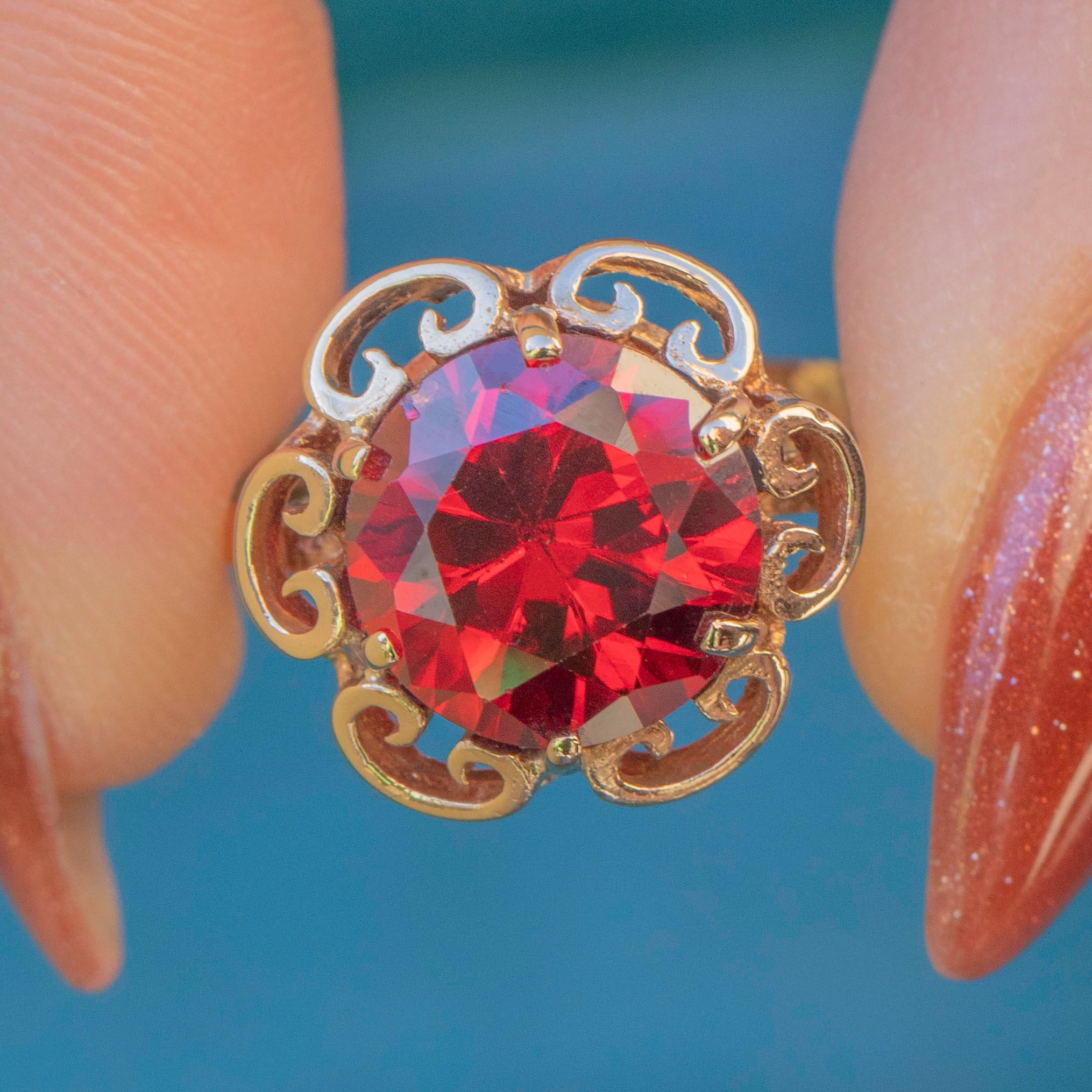In her centre sits a plump Garnet, boasting 5.10ct and radiating gorgeous deep crimson hues as she catches the light. She is set within an adorable floral 9ct Gold setting providing a wonderful adorable grace to contrast the bold faceted Garnet.