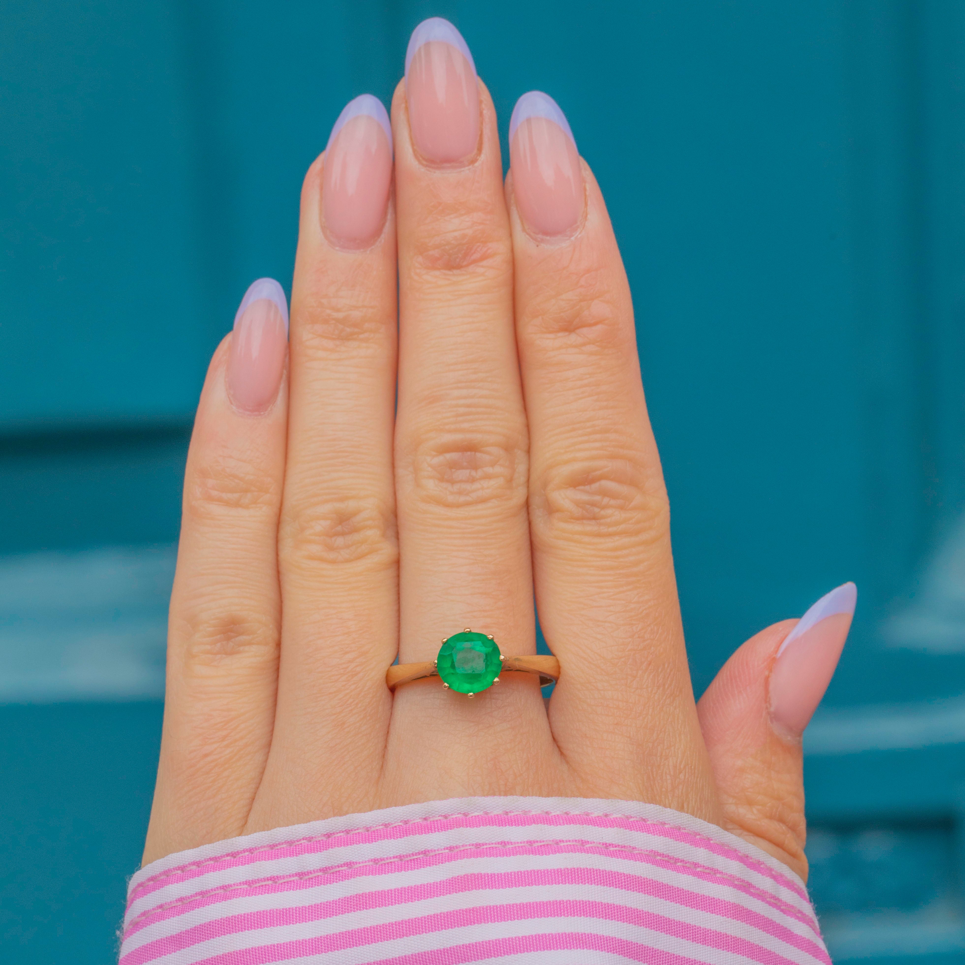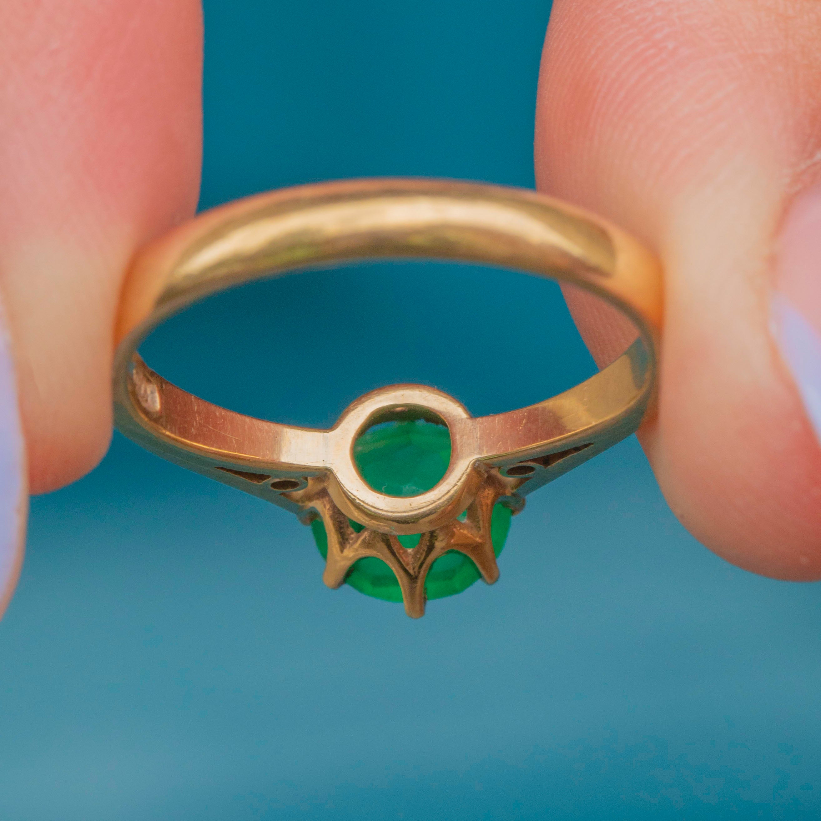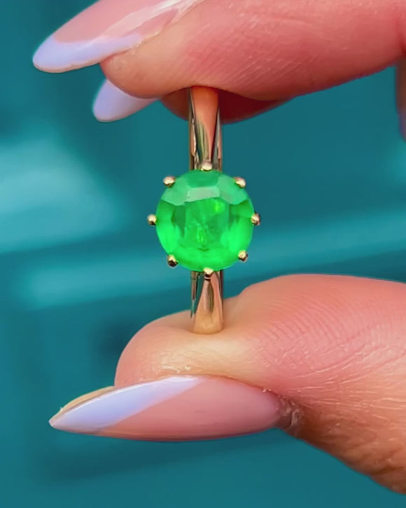 Crafted from buttery 9ct Gold, this vintage solitaire ring features a radiant round verdant green Paste stone in her centre, which is sure to catch your eye. She is hugged by 9ct Gold claws, with the warmth of the Gold effortlessly complementing the vibrancy of the Paste.