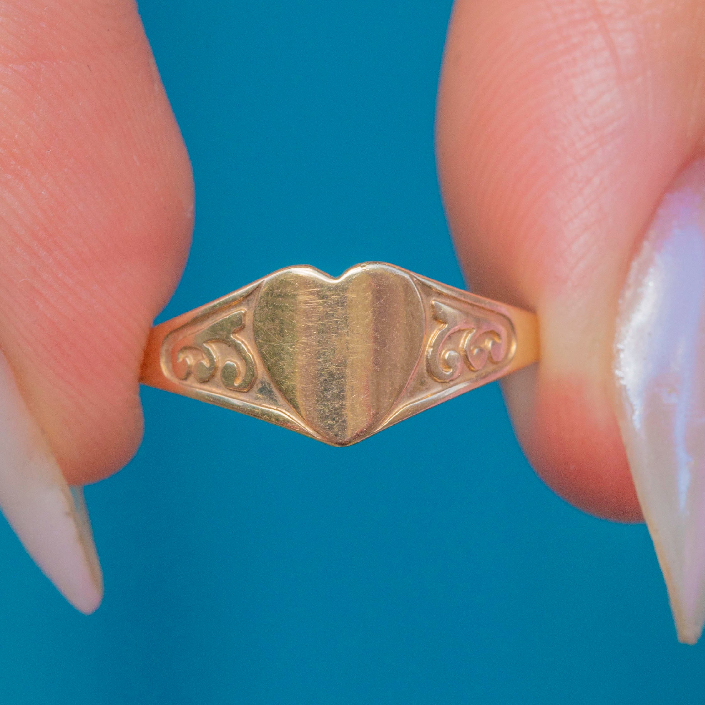 This adorable vintage heart signet ring is a dainty delight! With a sweet heart centre decorated with engraved details, this glossy slab of Gold is a unique signet ring perfect for everyday wear.
