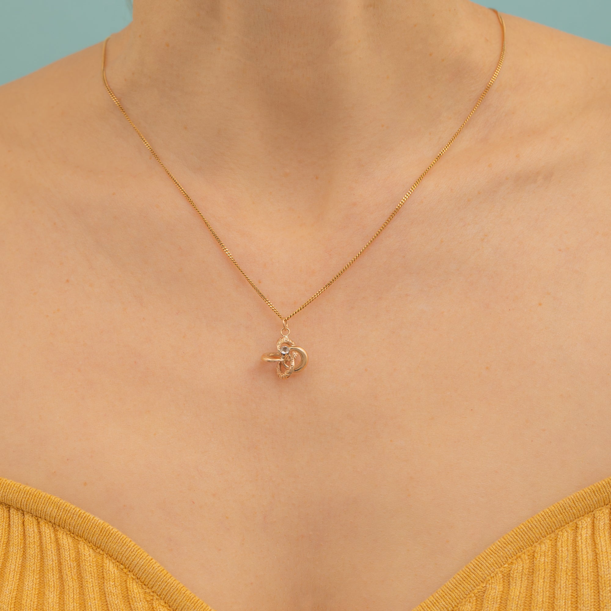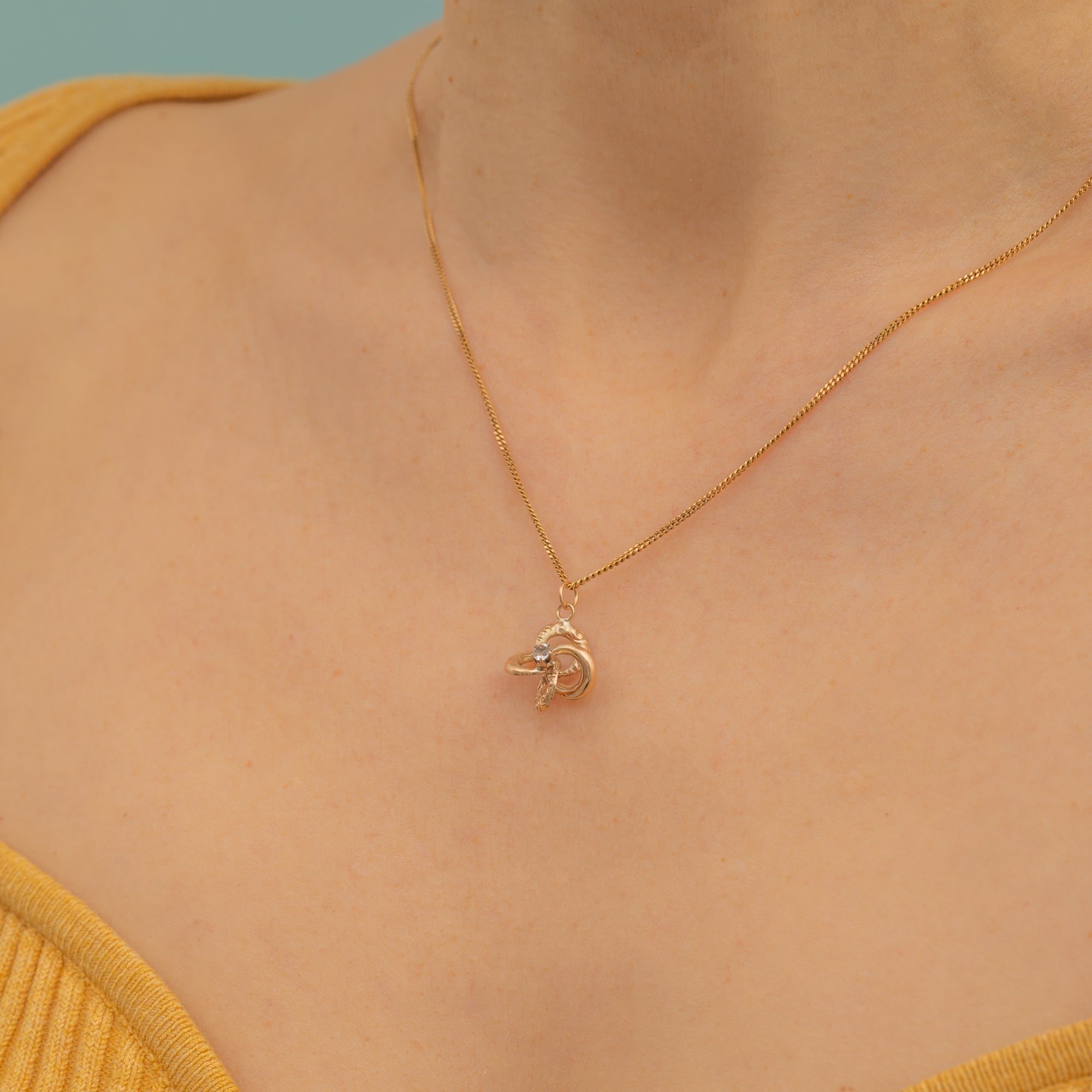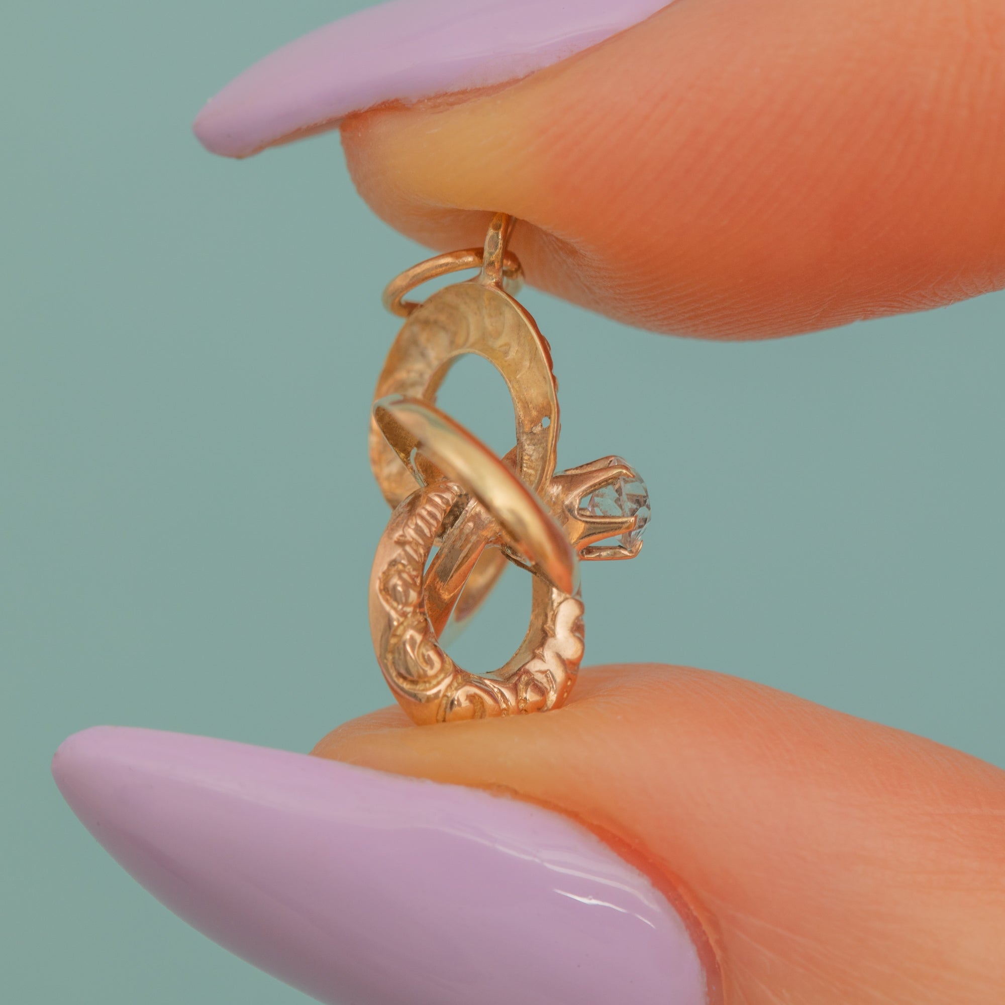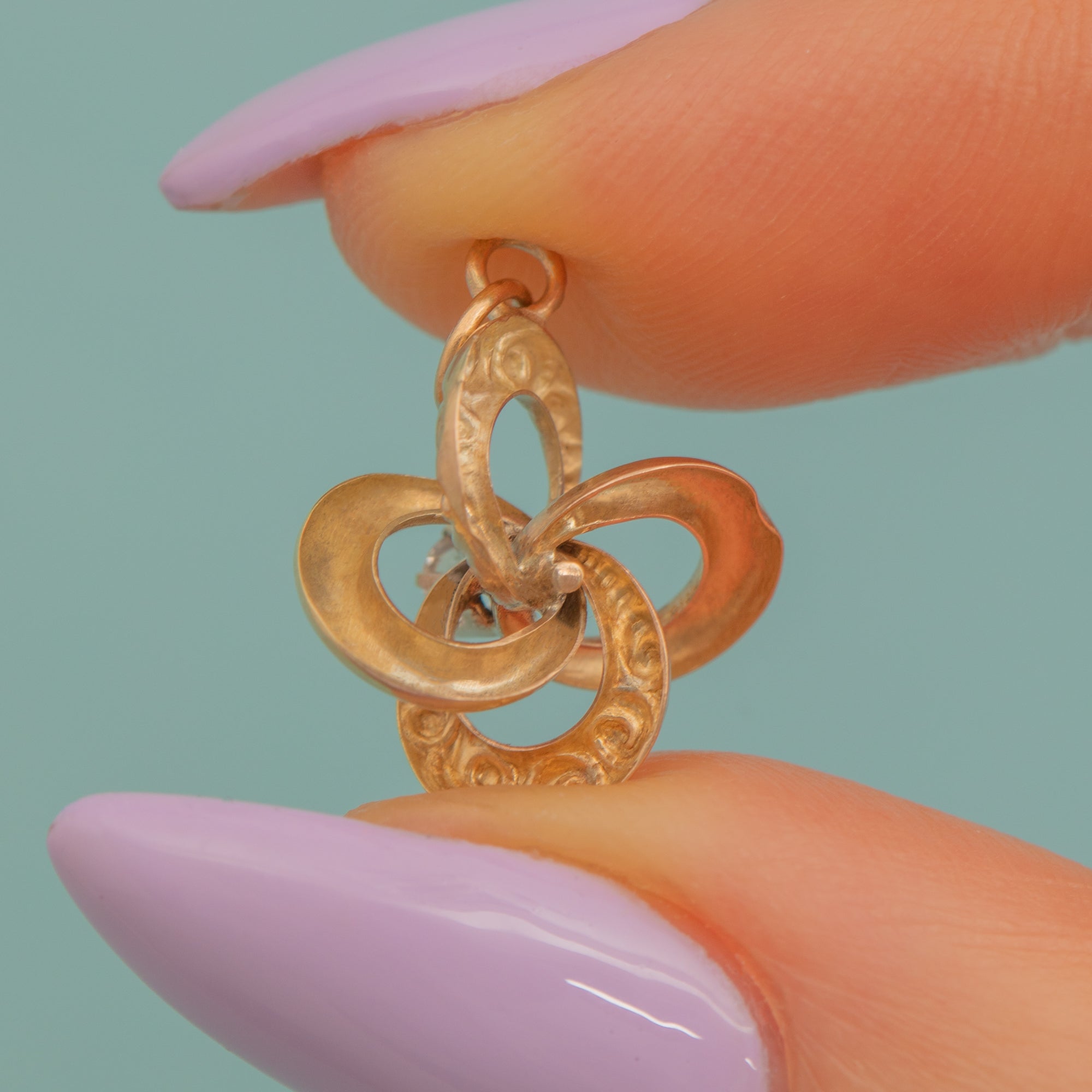 Simply suspend her from a fine chain and this romantic vintage lover's knot charm will rest delicately upon your décolletage!