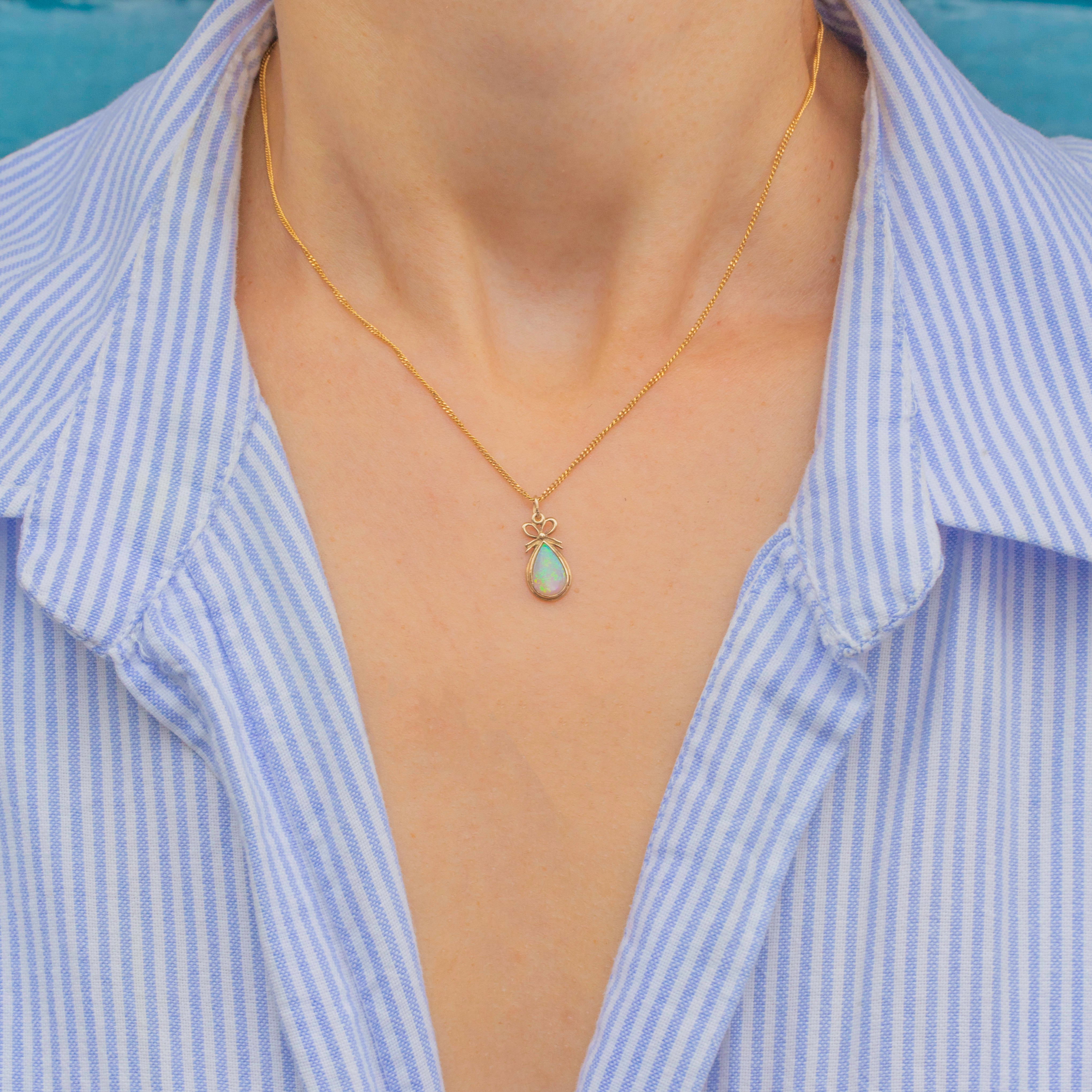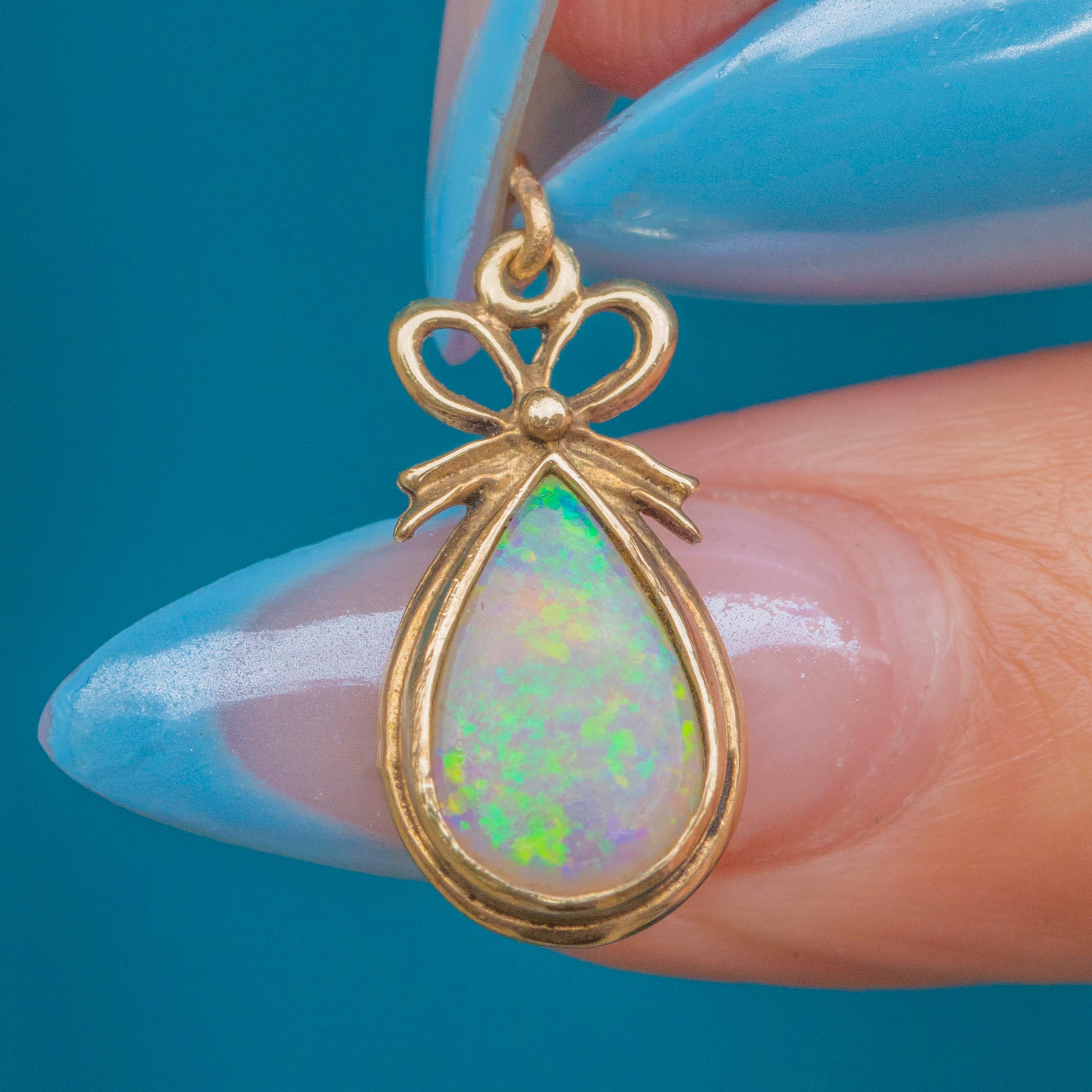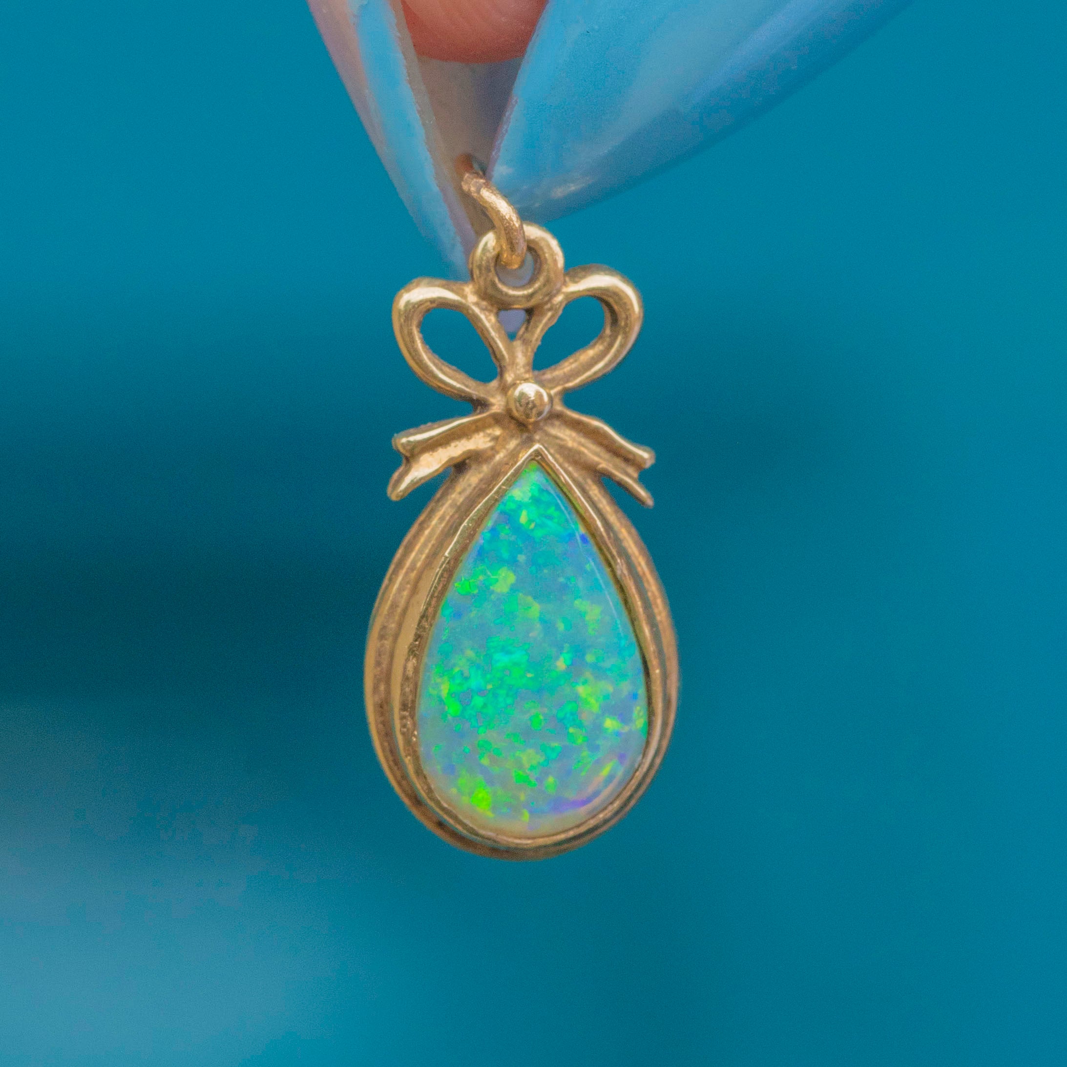 The pear-cut Opal cabochon is displayed within a glossy bezel and complete with an adorable ribbon top, adding a gorgeous, feminine finishing touch!