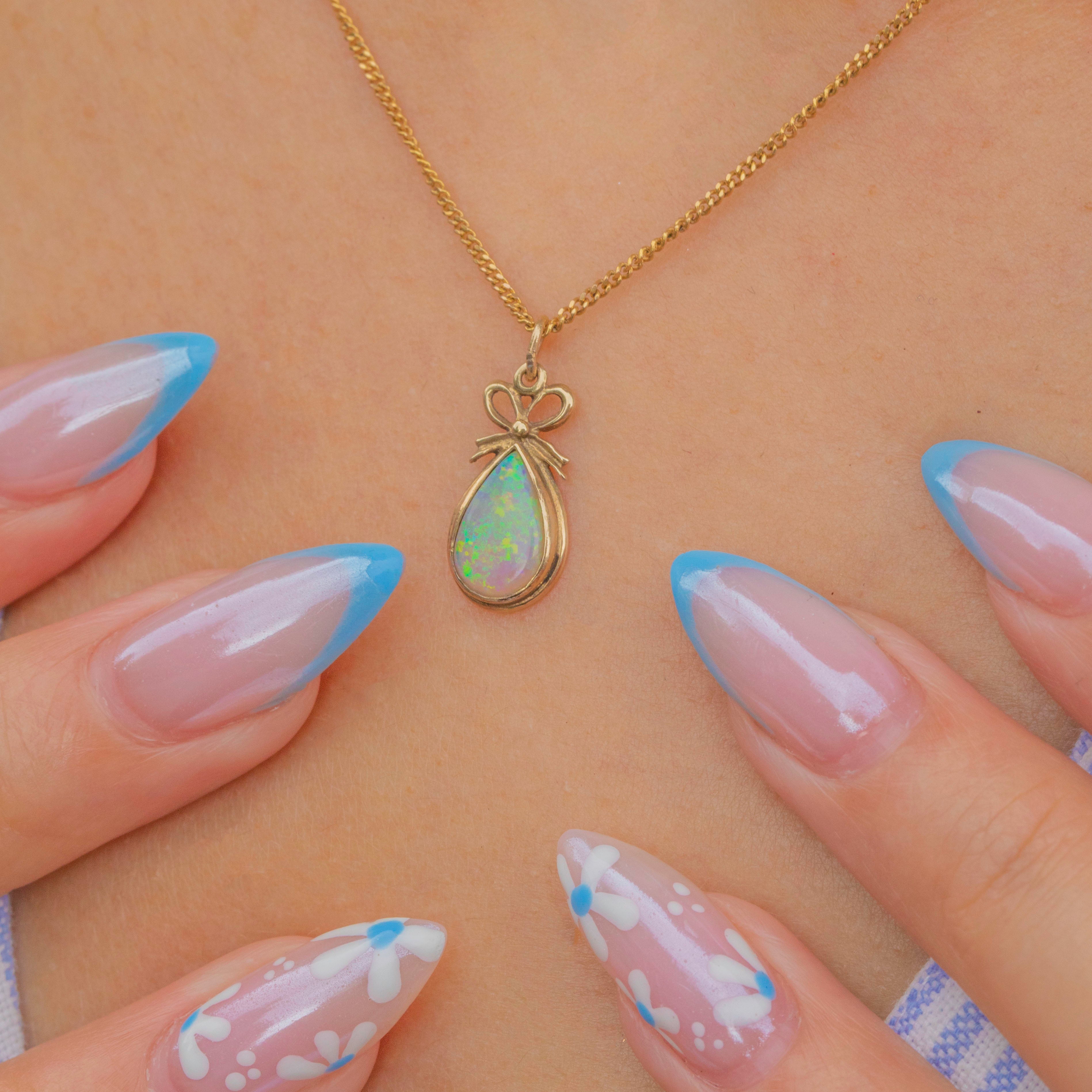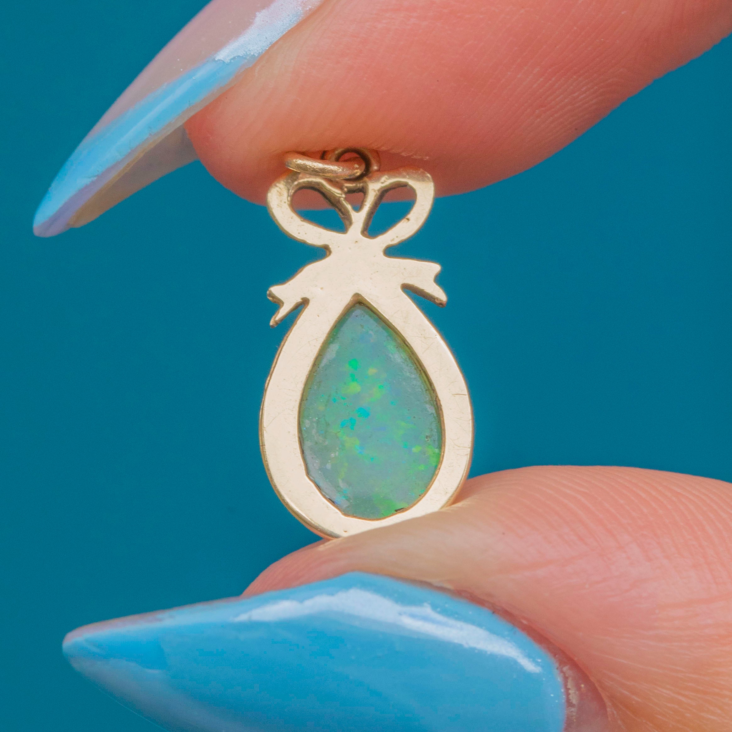 In the centre of this dainty charm sits a 0.40ct natural solid Opal, displaying soft blue and green hues with a sprinkling of vibrant orange and pink flashes as it catches the light.