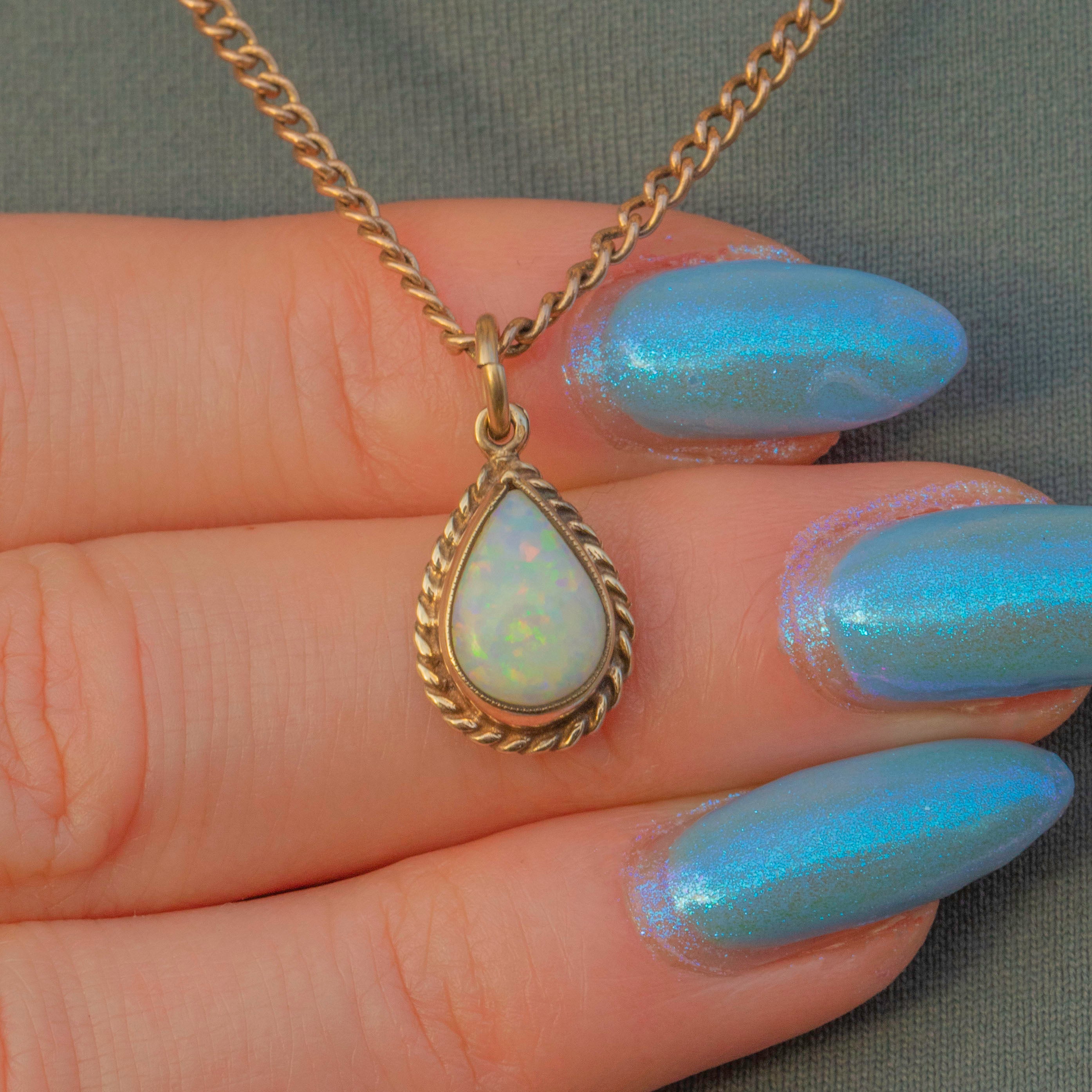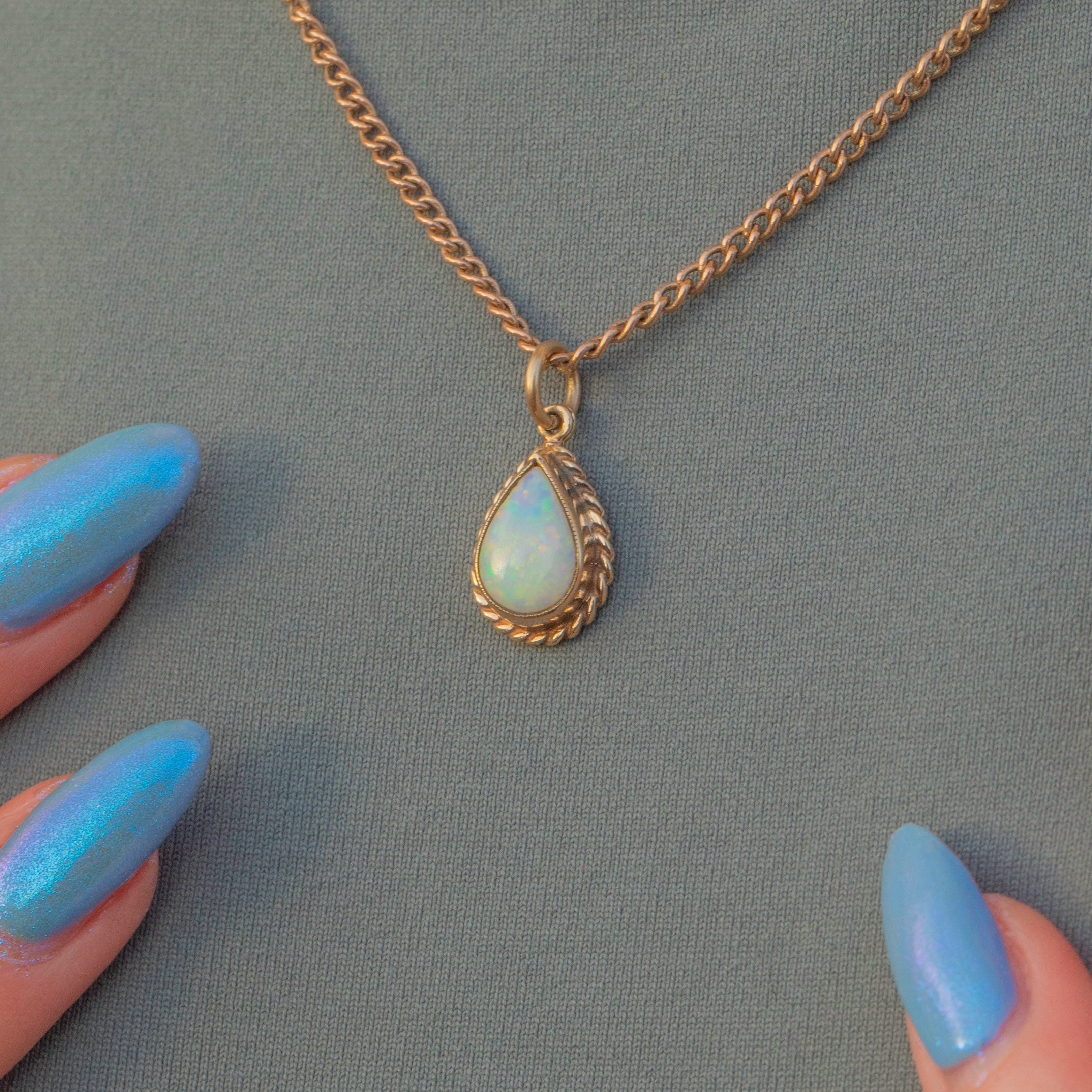 VERY GOOD. This 9ct Gold Opal pear drop charm is in wonderful condition. The Opal is smoothly domed and free from nibbles or abrasions. The Gold is buttery with only minor wear near the top of the bezel, but the Opal remains securely set. With a generously sized jump ring, all you need is a slender Gold chain to suspend this beauty from!