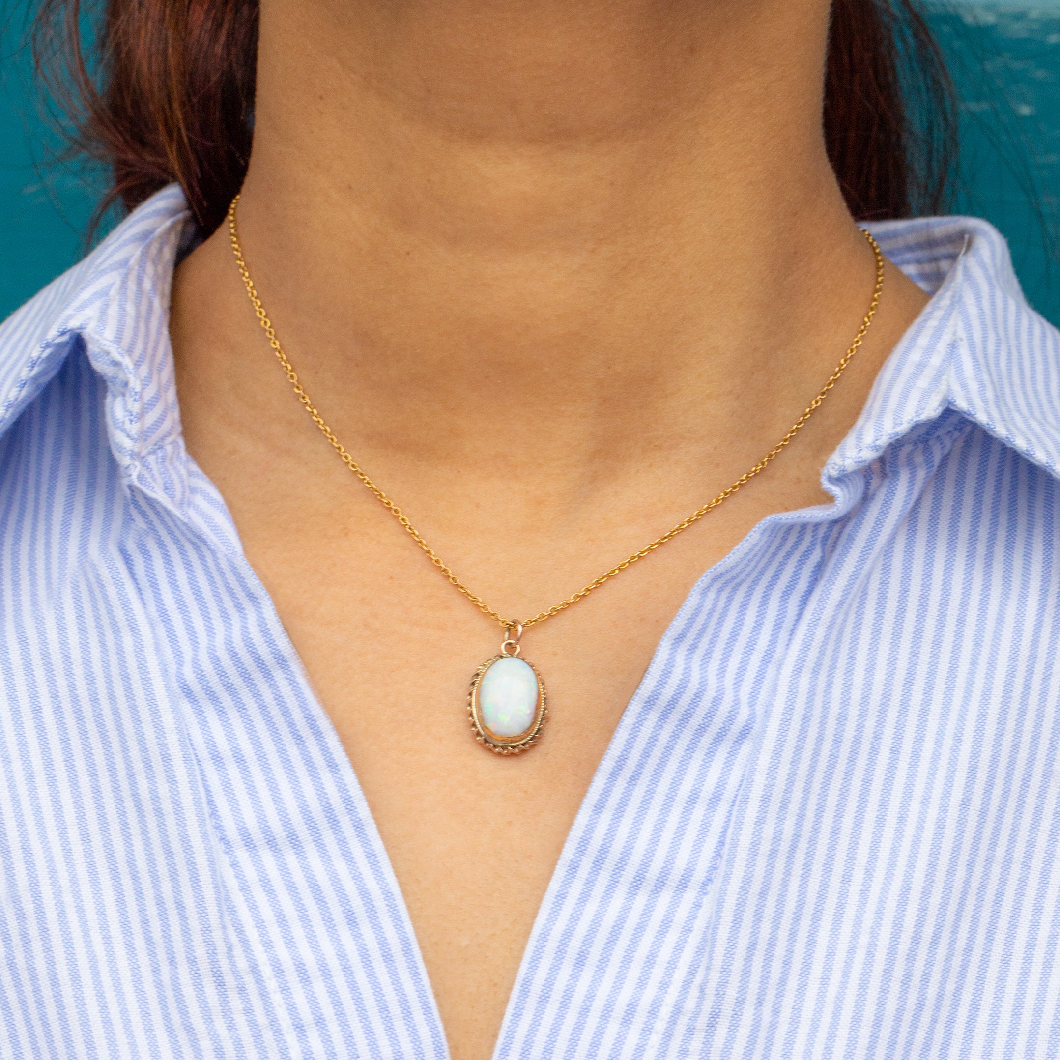 Crafted from buttery 9ct Gold, a striking rope border perfectly frames the vintage Opal cabochon. Opals are a symbol of hope, purity and truth, so this vintage Gold pendant would make a wonderfully thoughtful gift.