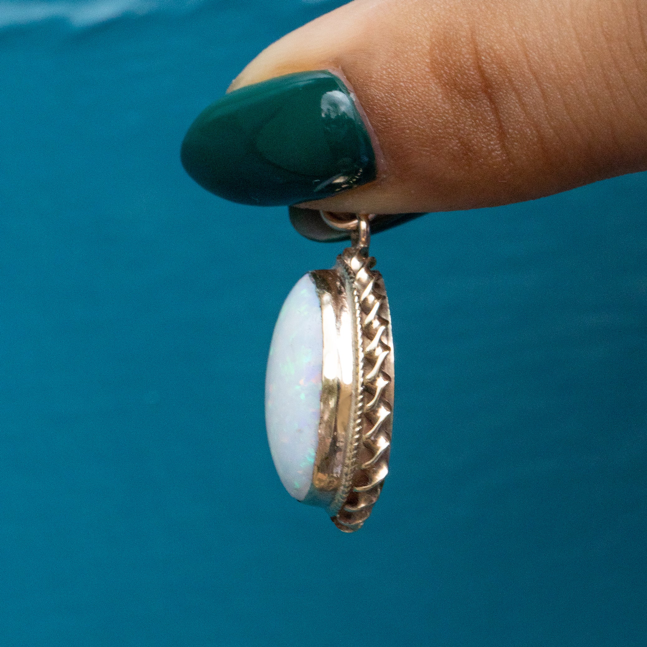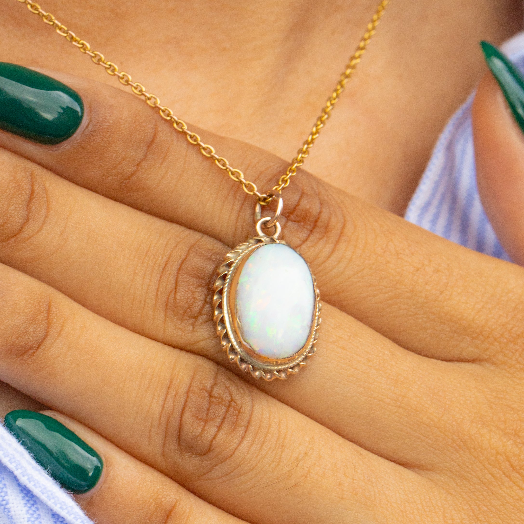 This vintage 9ct Gold Opal pendant is truly eye-catching! The 5.00ct Opal has a heavenly opaque body revealing a firework display of colours when light hits the gemstone's curvaceous body.
