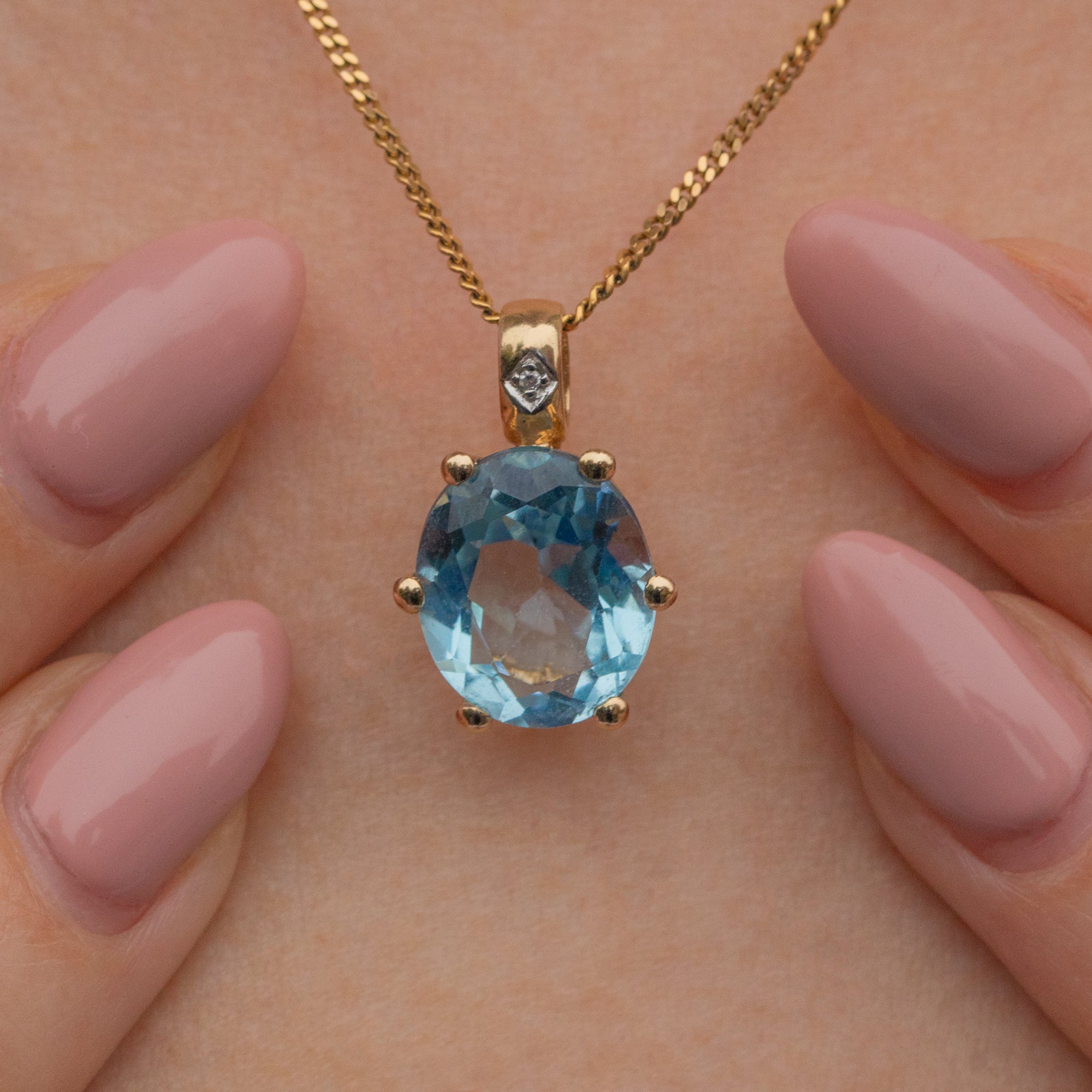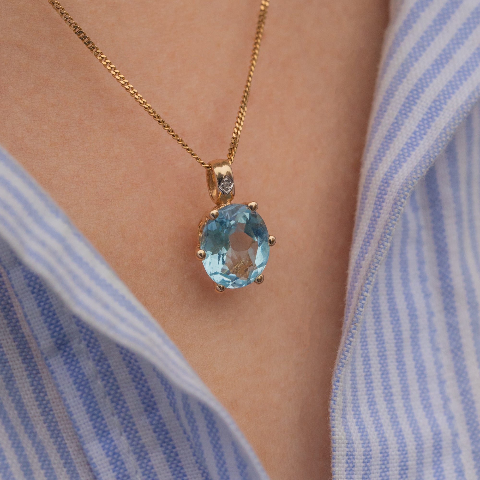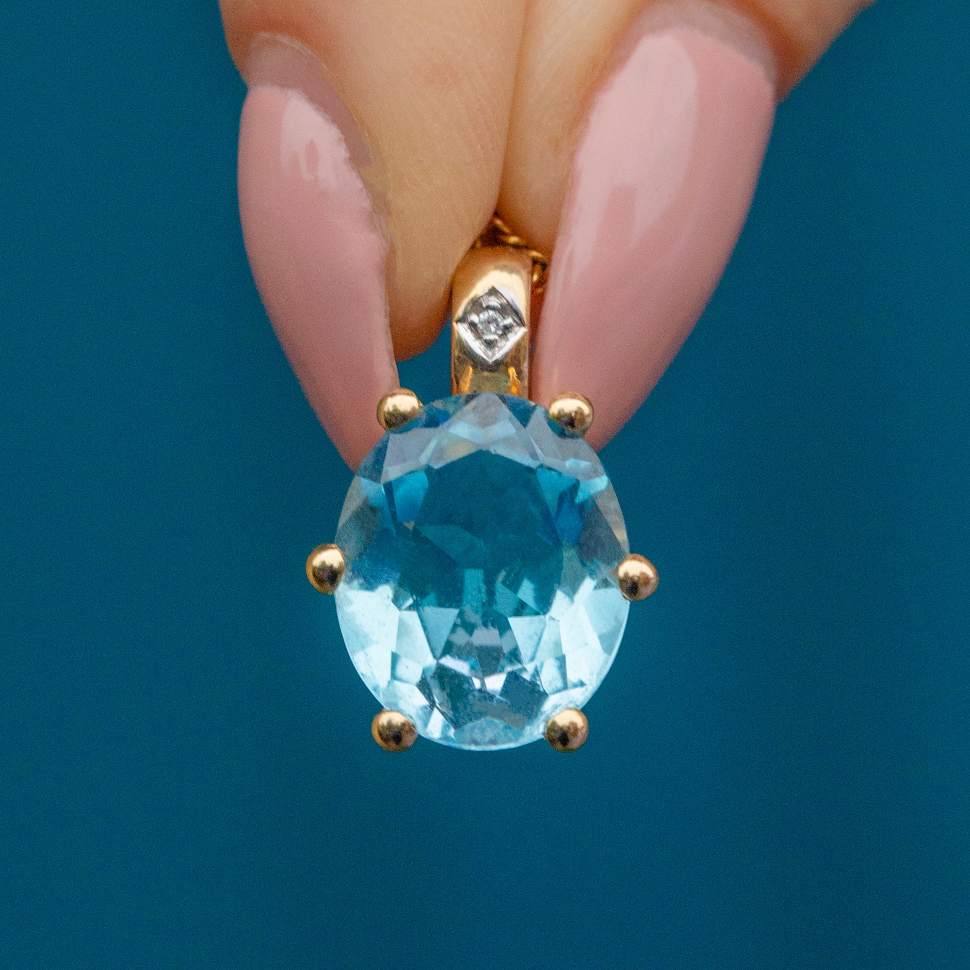 Add a pop of sky-blue serenity to your wardrobe with this 9ct Gold Oval Topaz Diamond charm! This Vintage pendant boasts a heavenly 2.35ct Topaz shimmering  with ethereal light, evoking a feeling of tranquility and calmness.