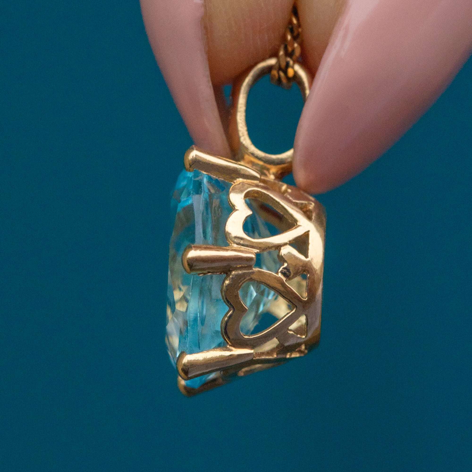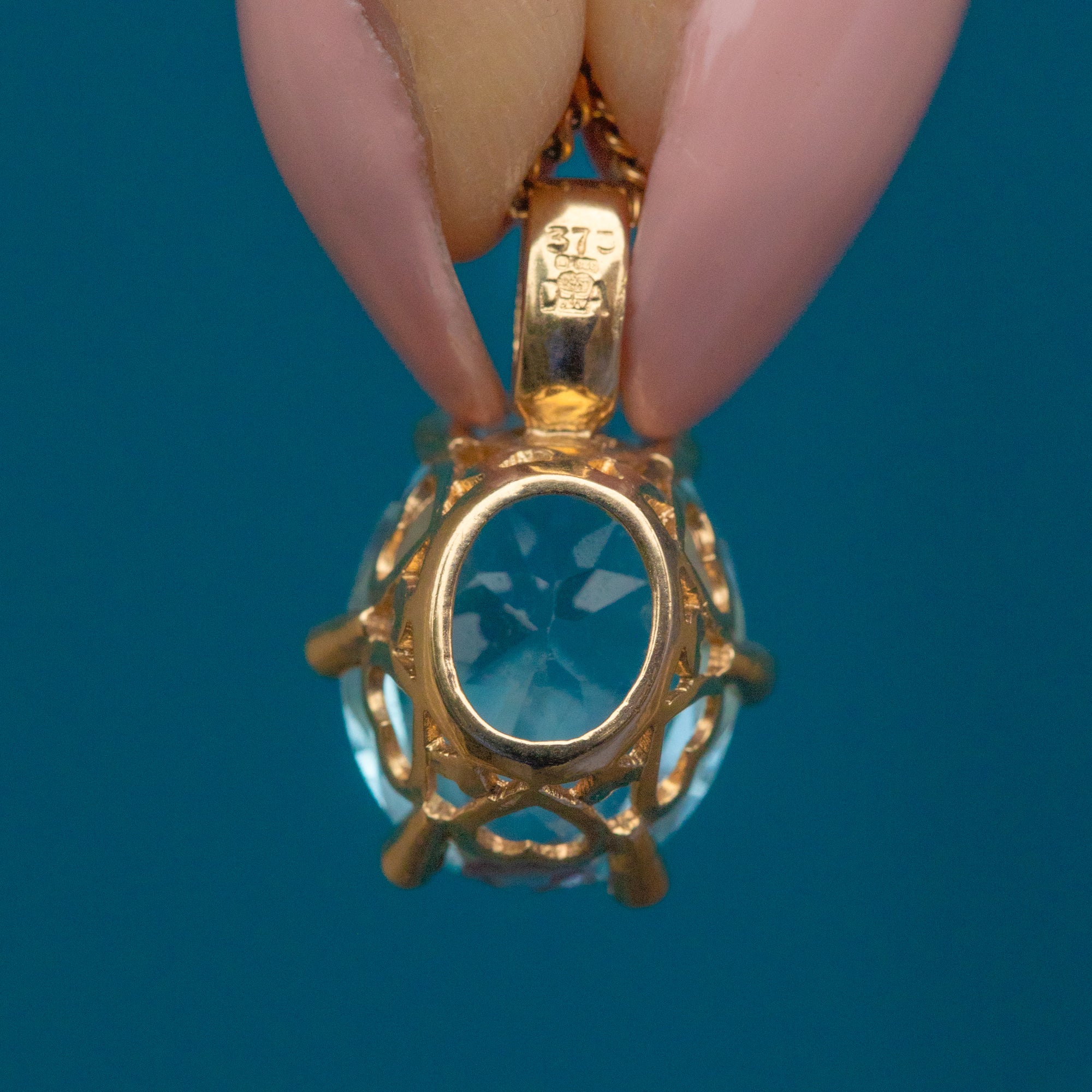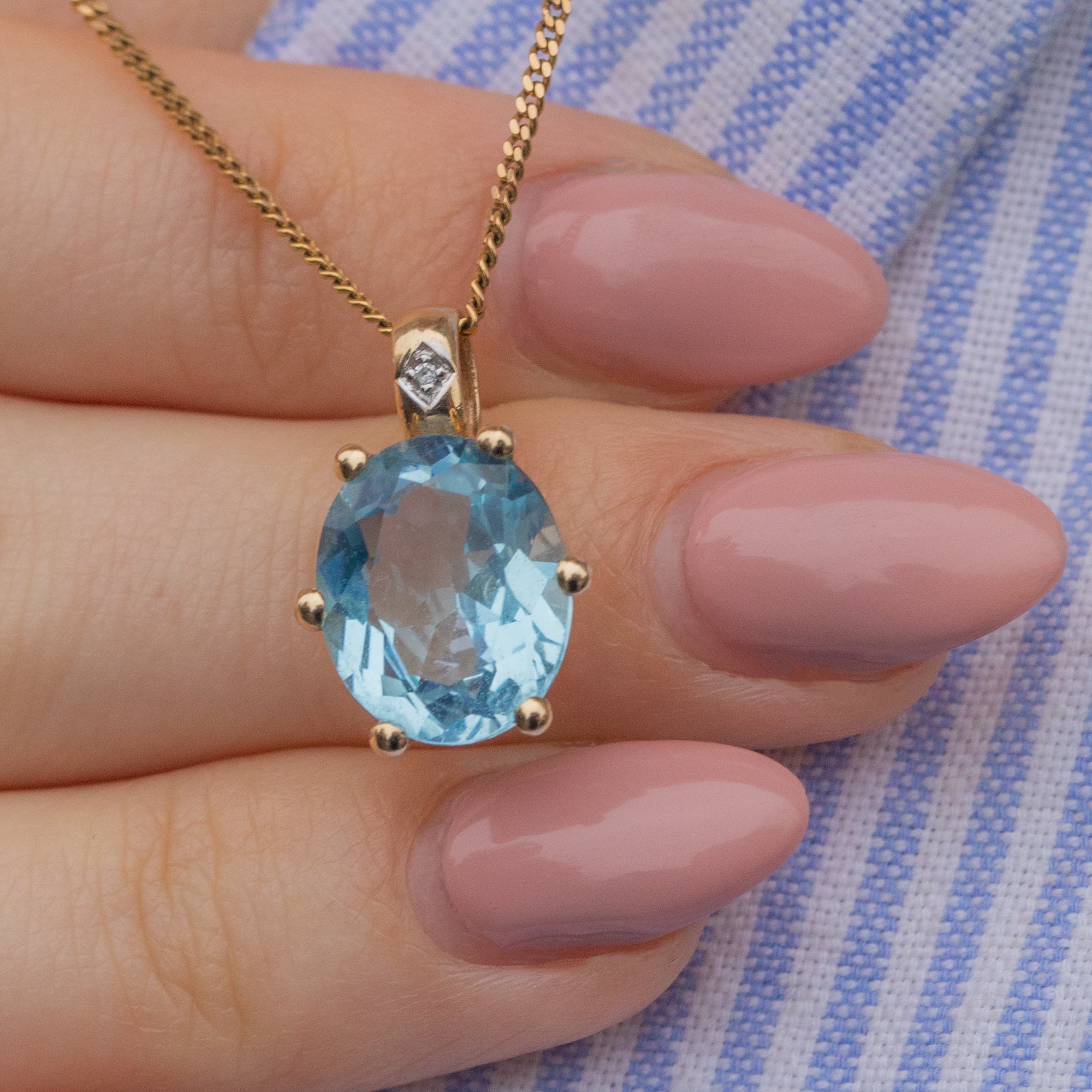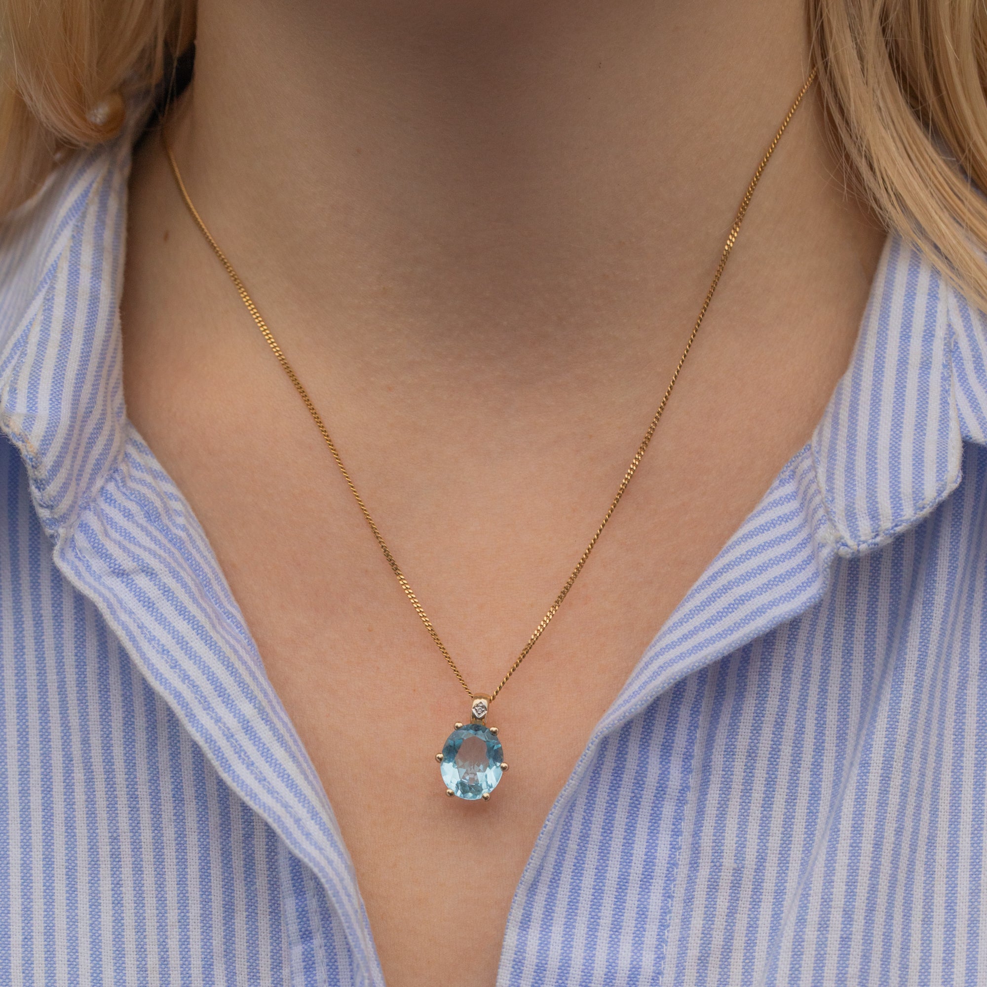 Add a pop of sky-blue serenity to your wardrobe with this 9ct Gold Oval Topaz Diamond charm! This Vintage pendant boasts a heavenly 2.35ct Topaz shimmering  with ethereal light, evoking a feeling of tranquility and calmness.