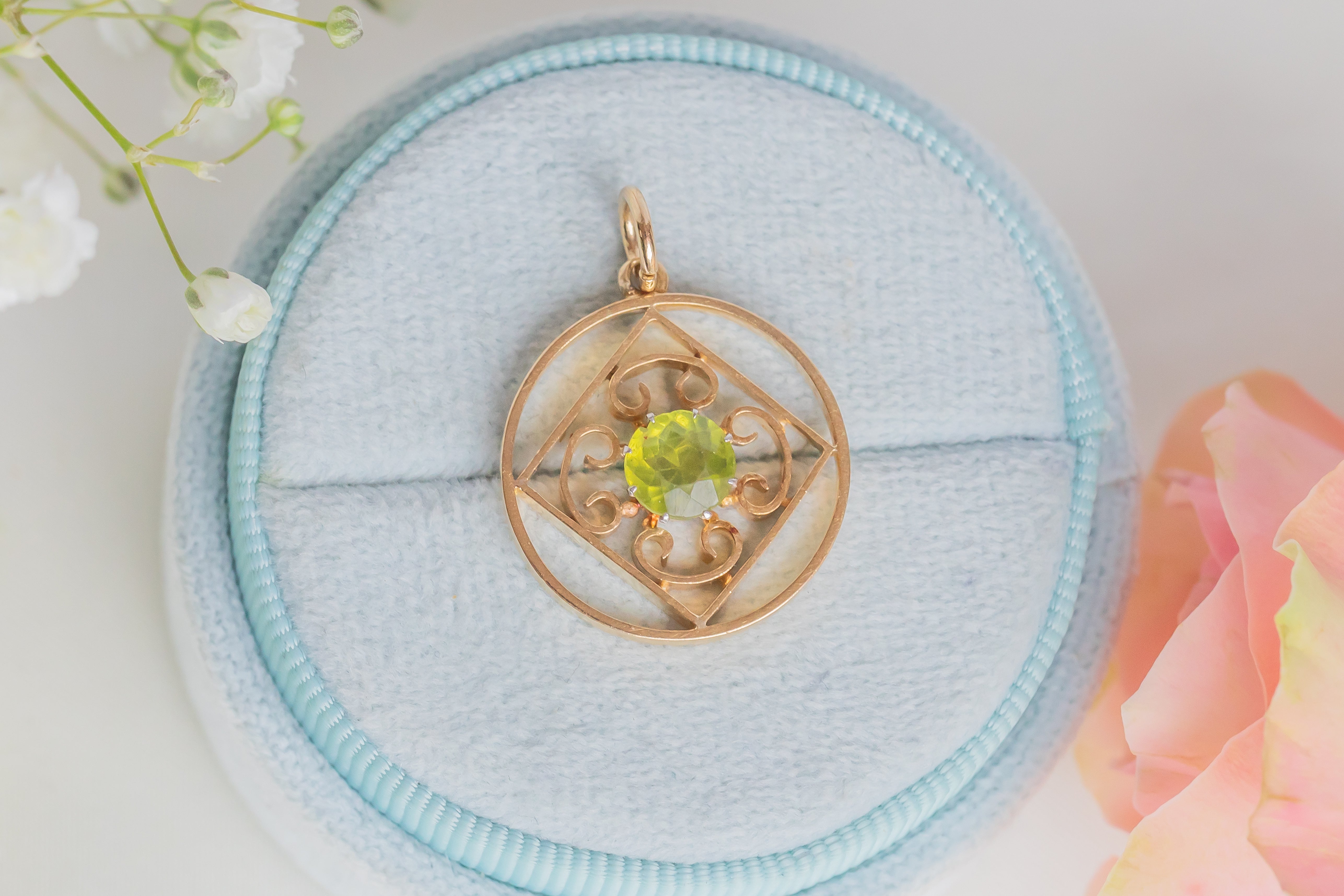 We adore this 9ct Gold Peridot pendant! This sweet piece is crafted from solid Gold and is inlaid with a zesty Peridot that twinkles beautifully as this vintage pendant catches the light.
