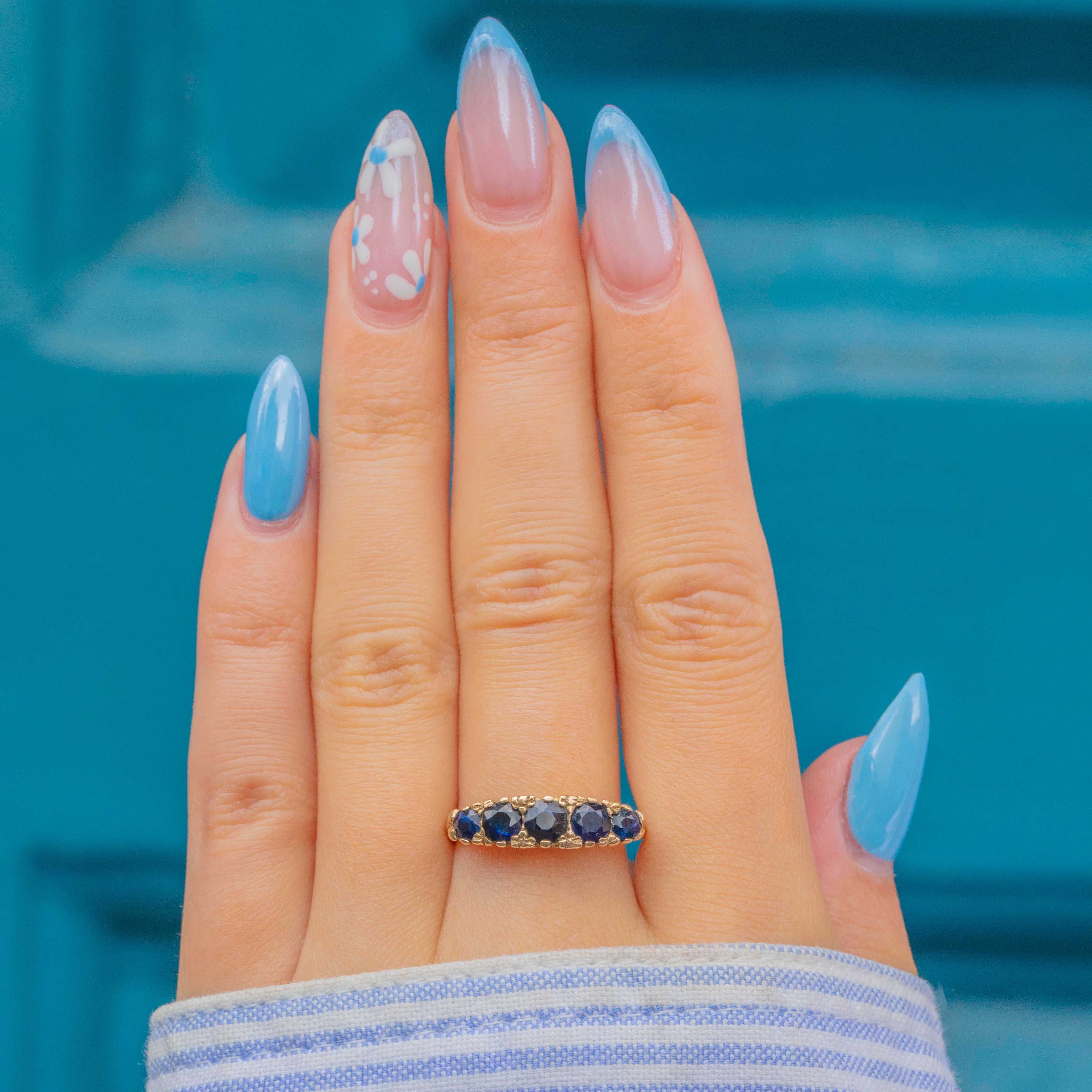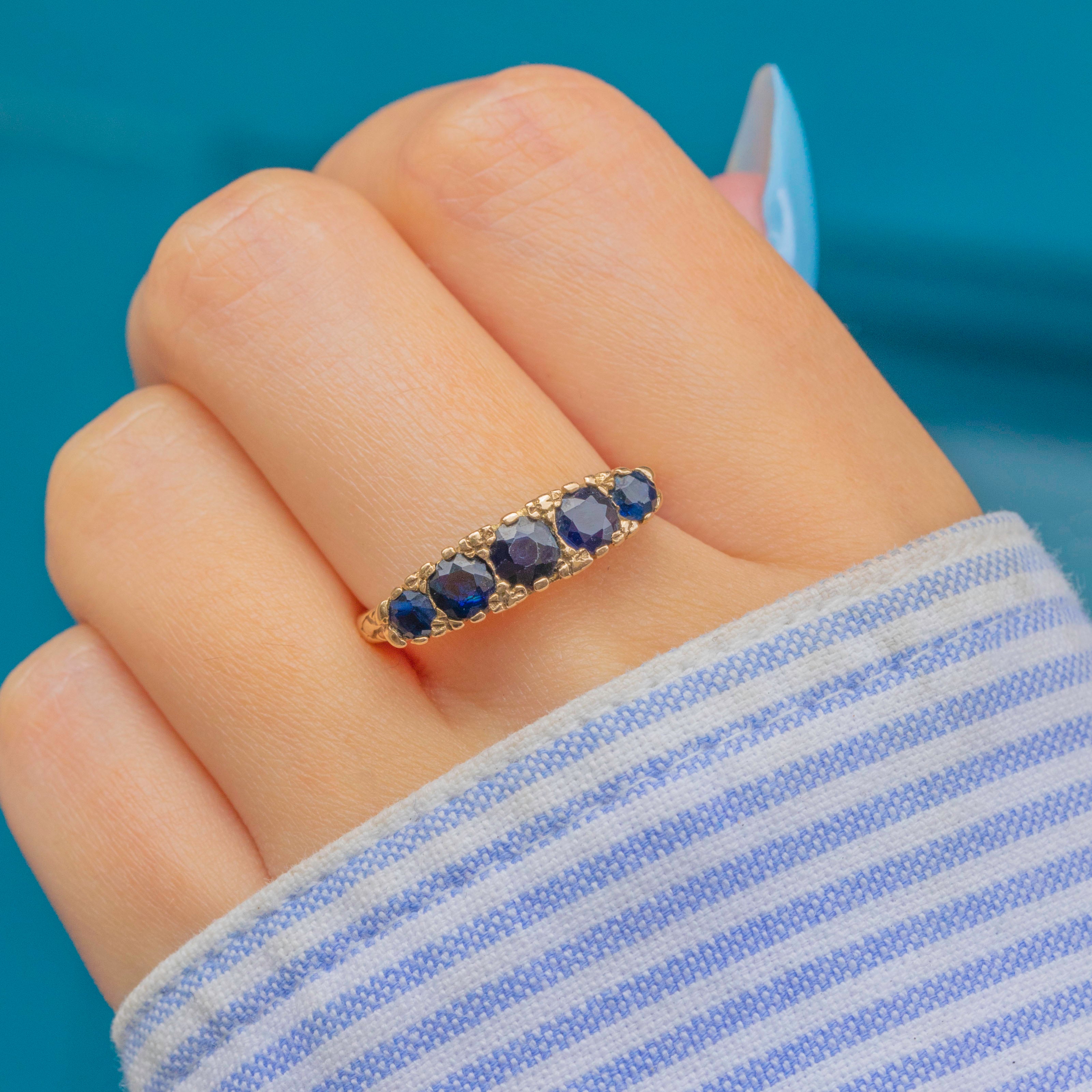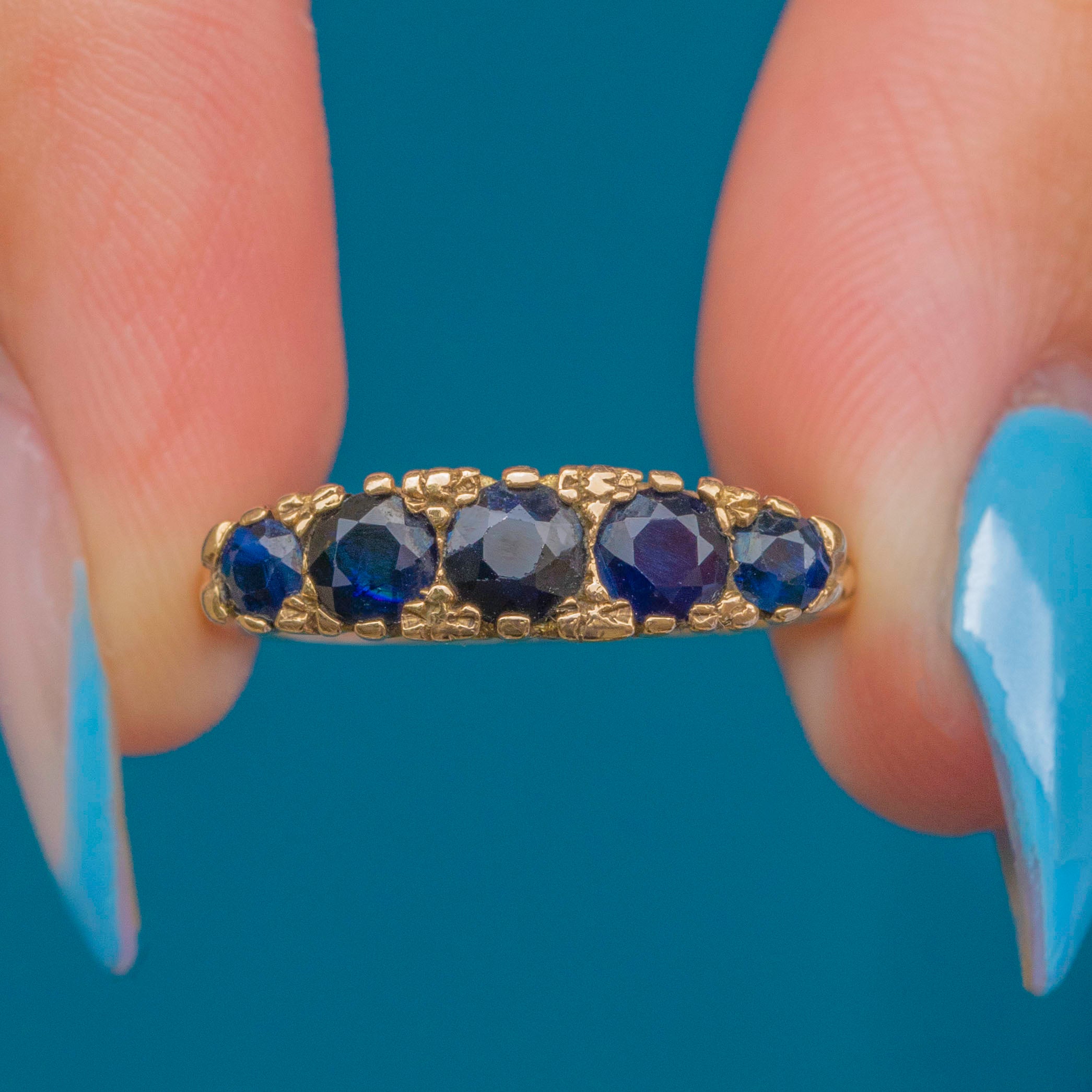 This vintage Sapphire ring is a fabulous piece! The five graduating Sapphires spread across the width of your finger, each one faceted wonderfully to catch the light, revealing gorgeous royal blue hues.