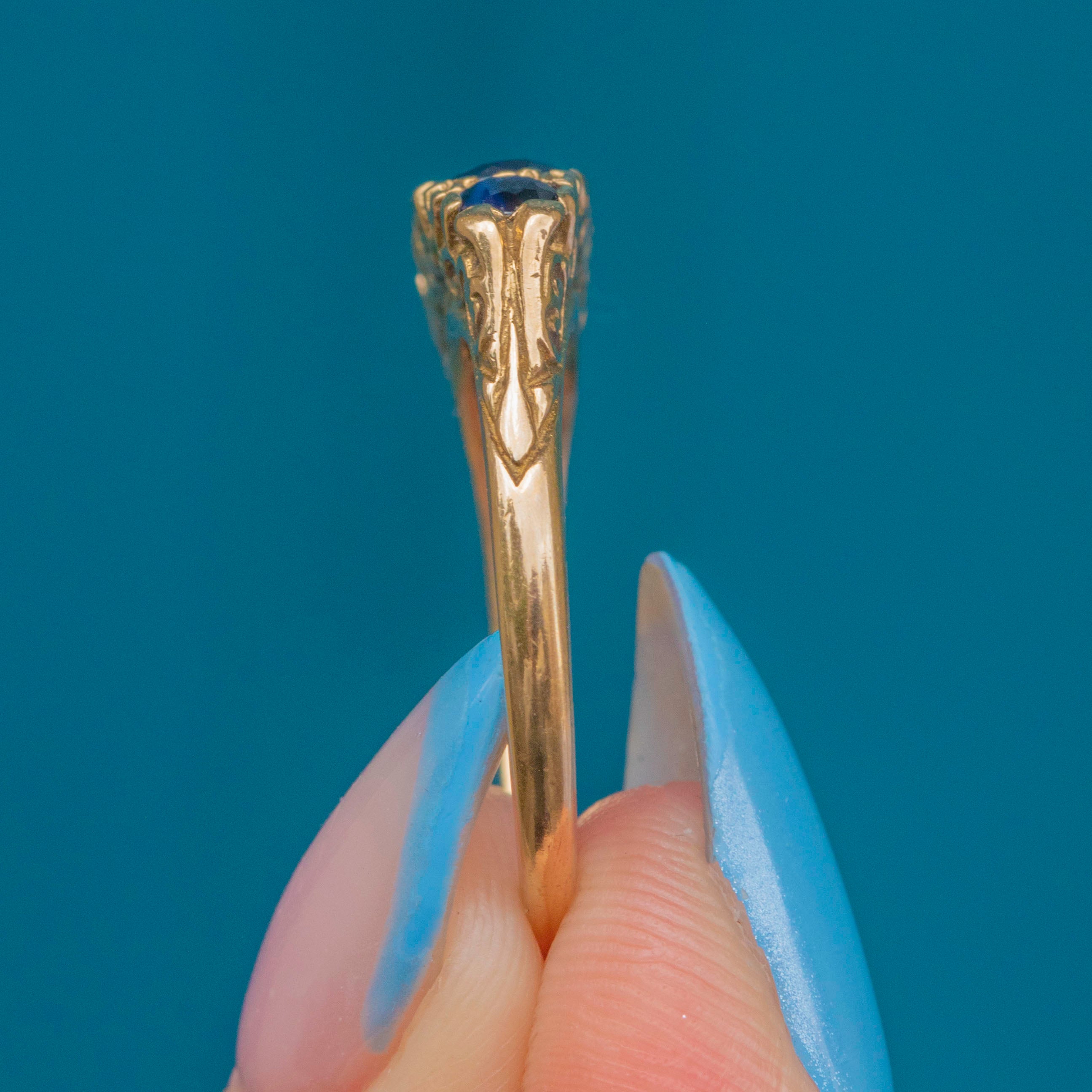 They sit within a decorative 9ct Gold gallery, creating an elegant profile as she rests on your finger. Perfect for everyday wear, this mid-century Sapphire ring would make a lovely choice for a unique engagement ring!