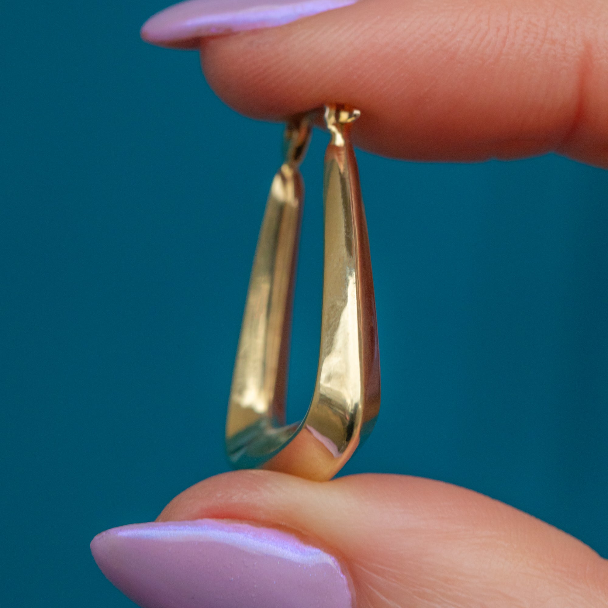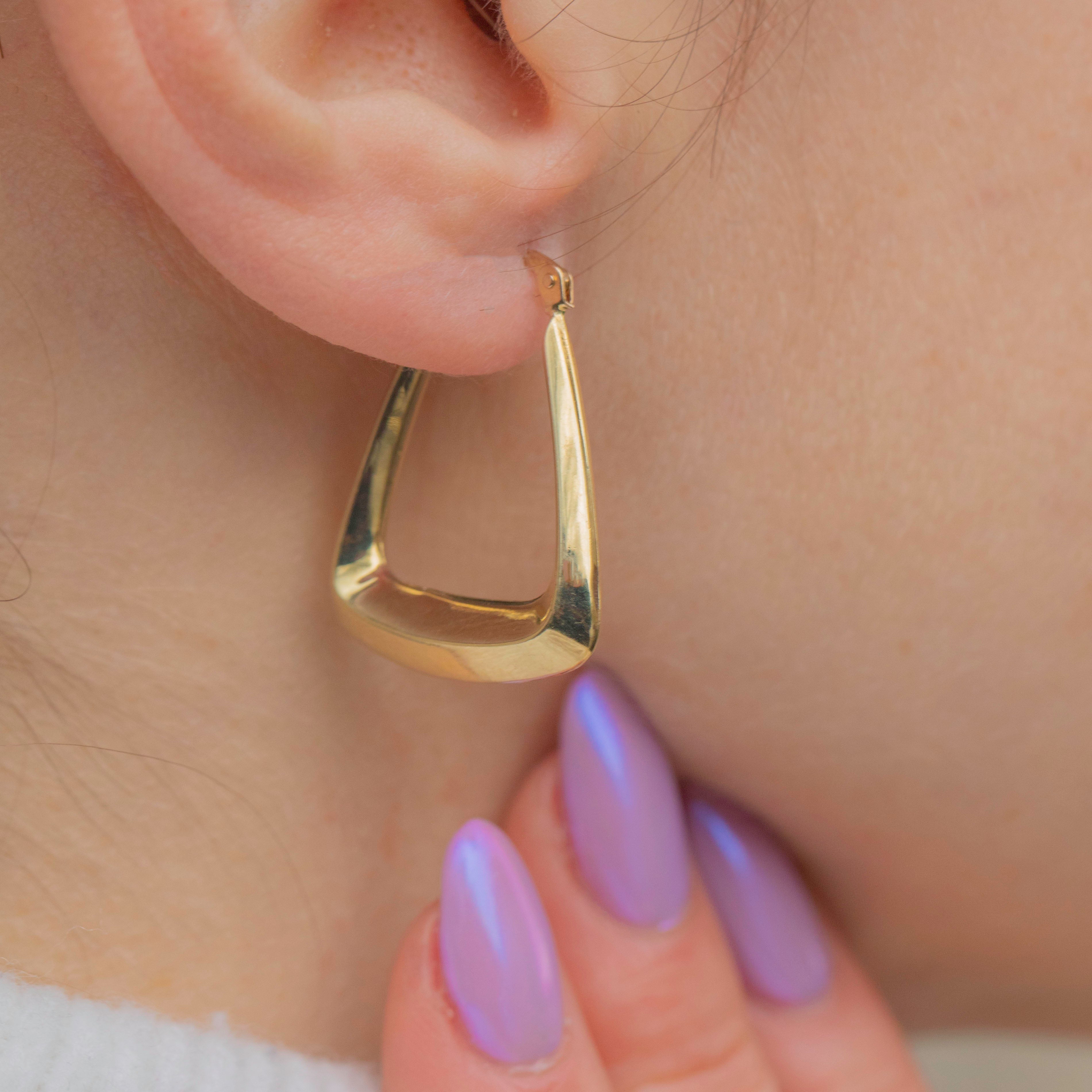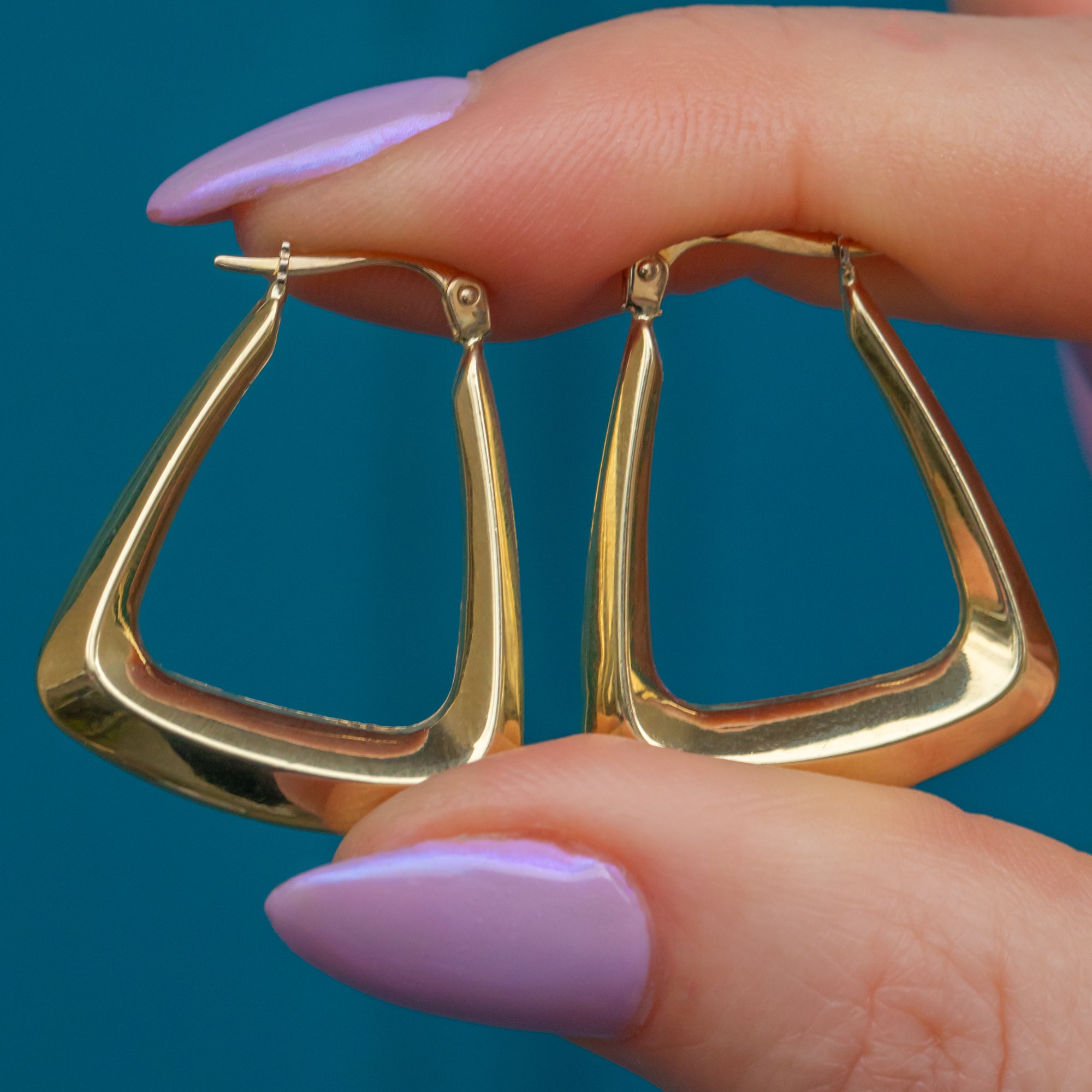 Spruce up your outfit with these 9ct Gold triangle hoop earrings! Crafted from bright 9ct Gold, these vintage hoops have striking angular forms that reflect the light magnificently.