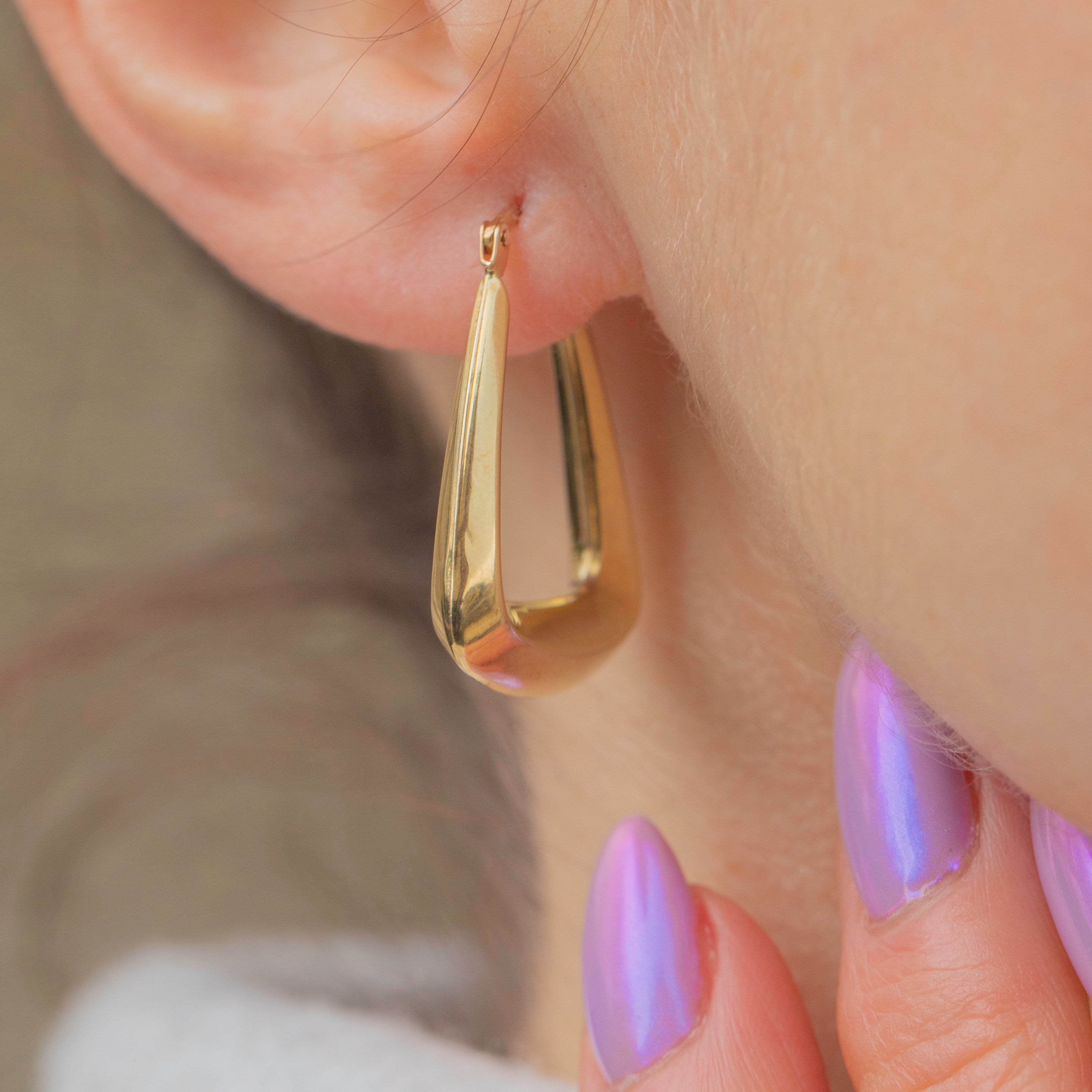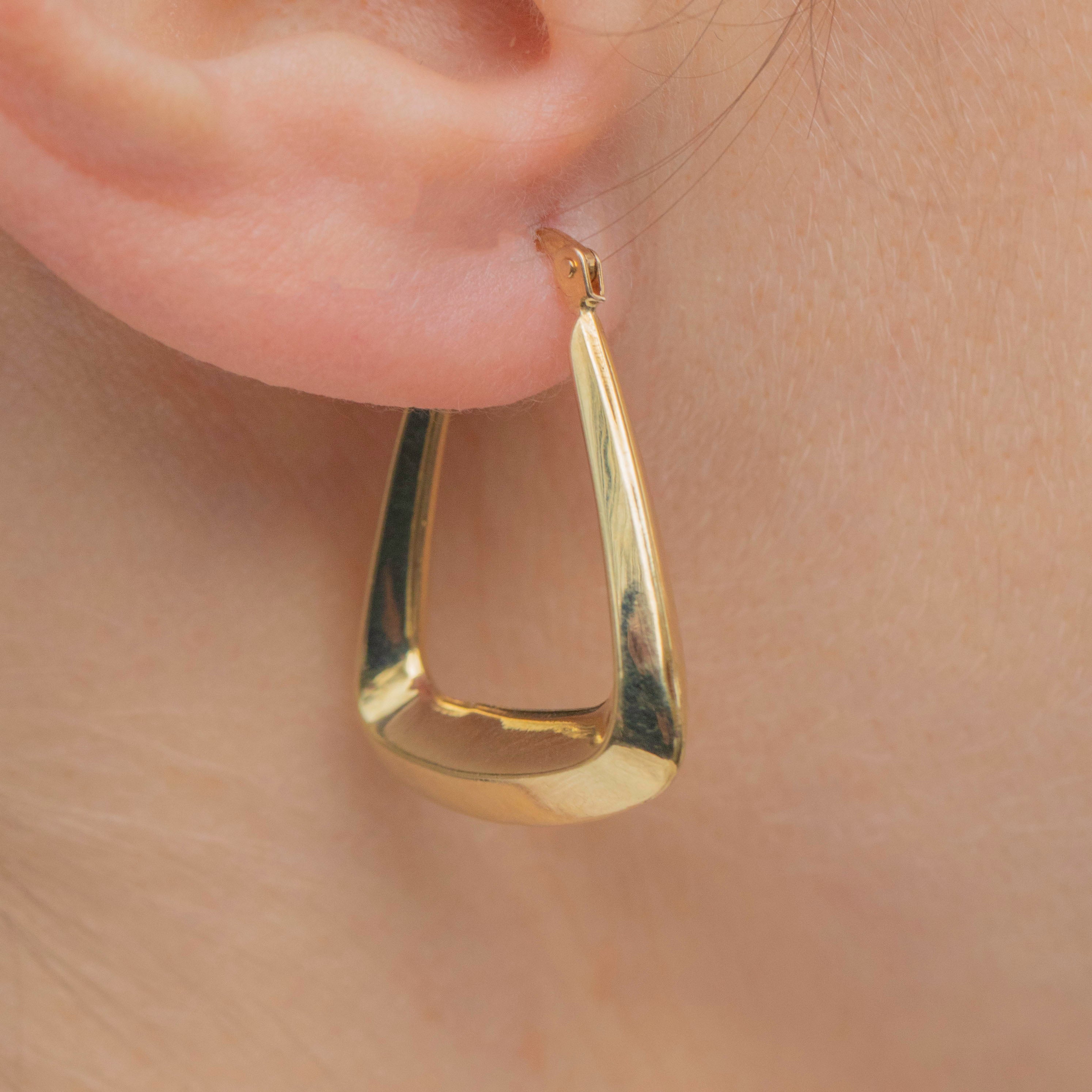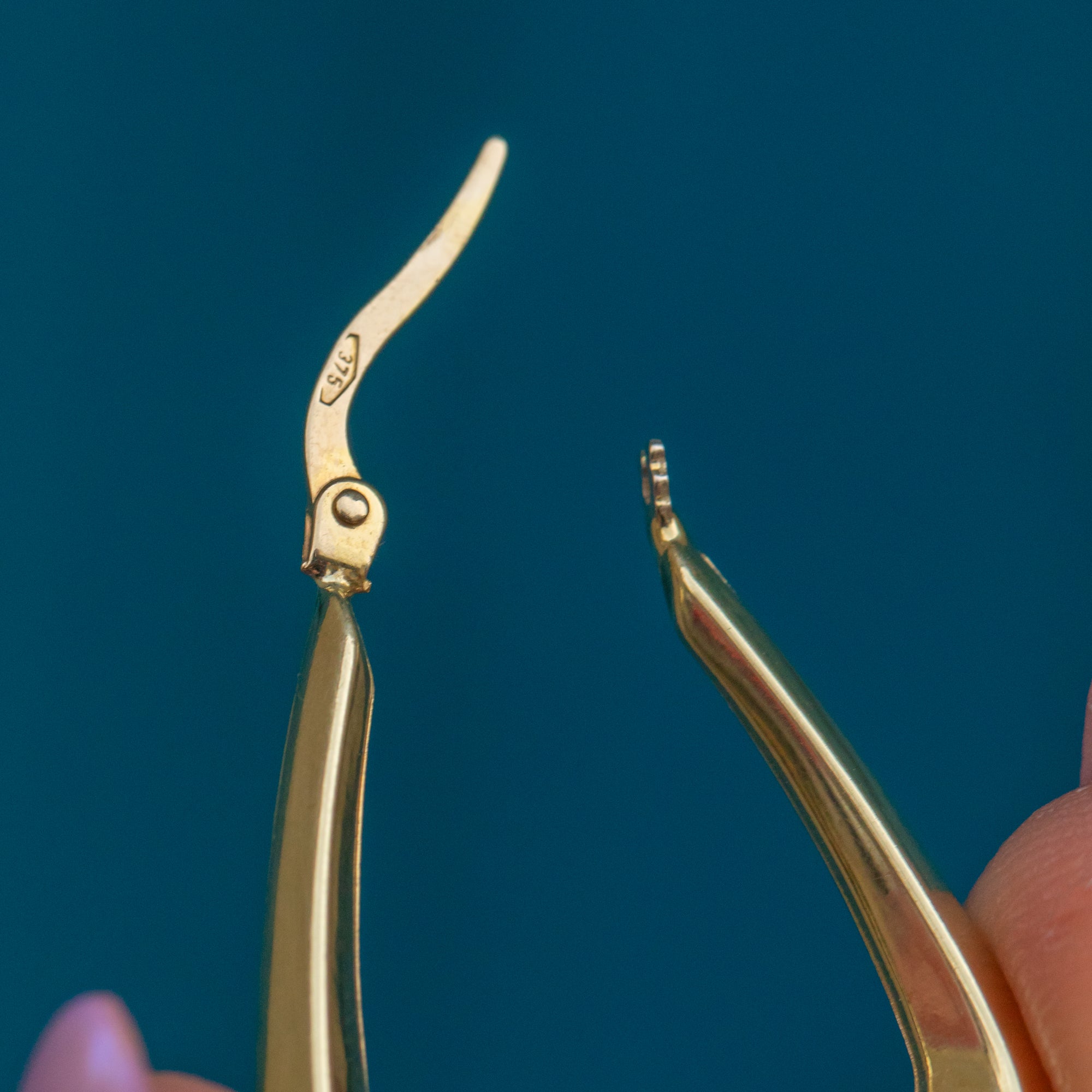 VERY GOOD-EXCELLENT. These 9ct Gold triangle hoop earrings are in superb condition. The Gold is luminous and the earrings have retained their forms well, with only minor surface wear noticeable under close inspection. The levers work well and close securely so you can enjoy wearing these distinct vintage Gold hoop earrings with confidence!